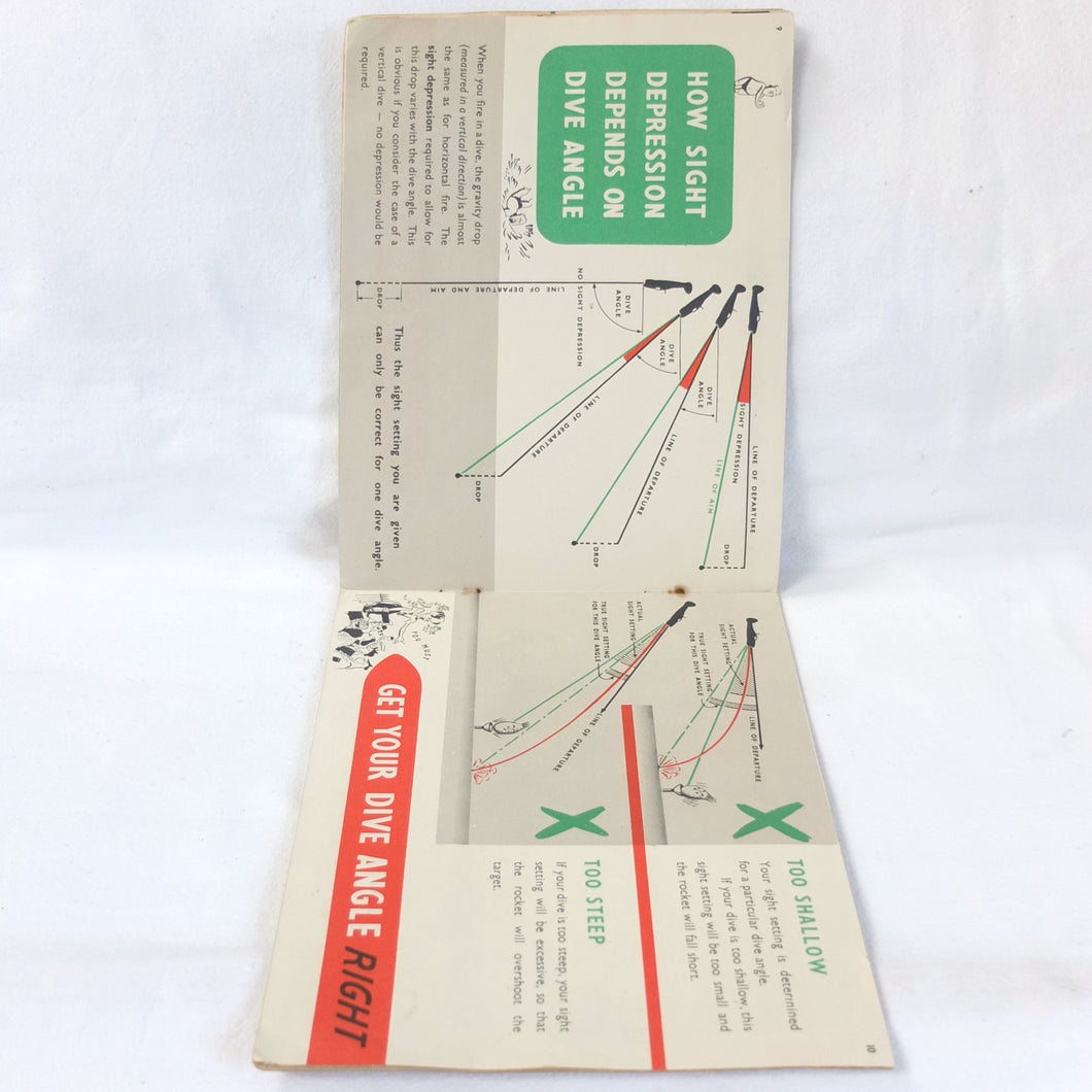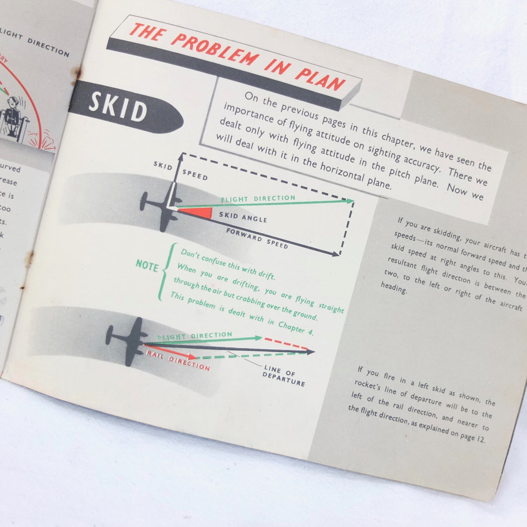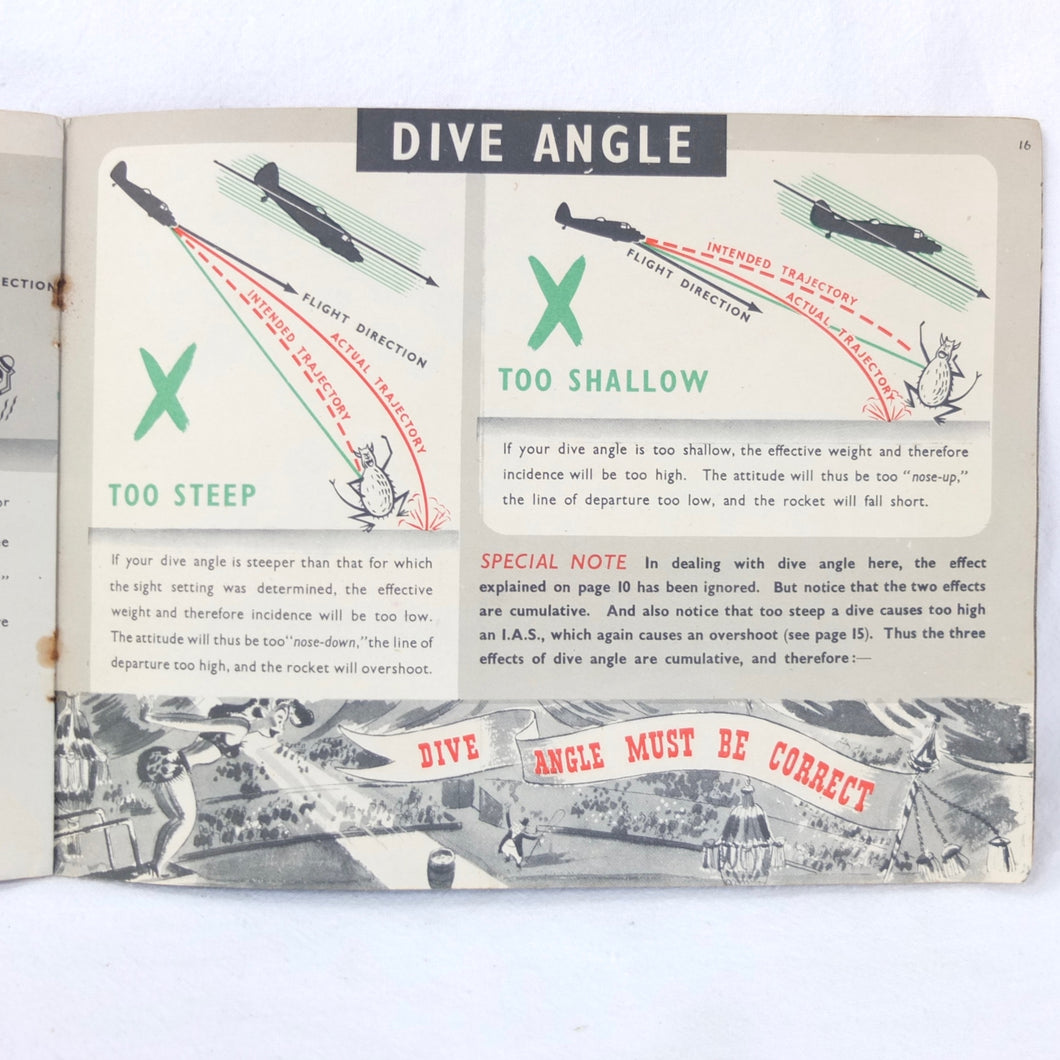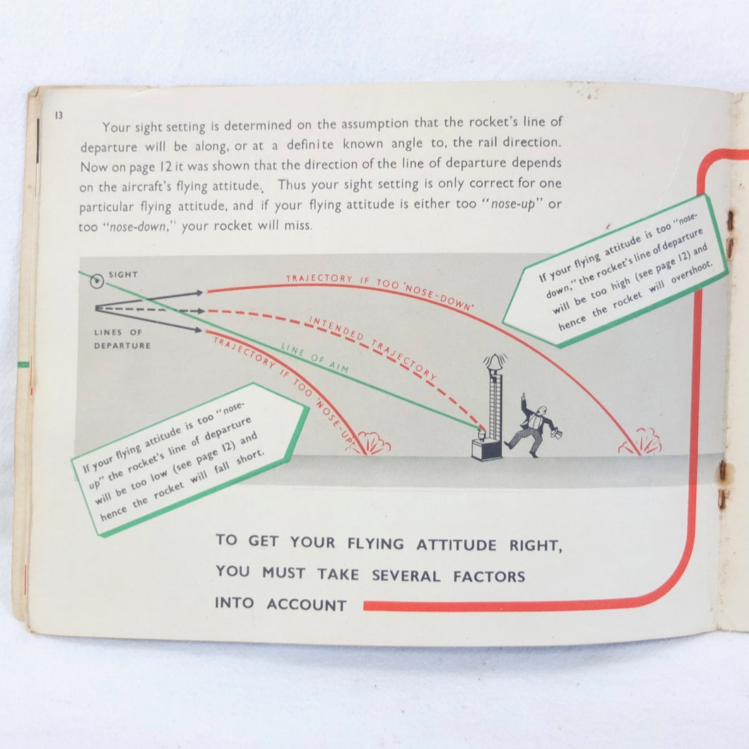 A rare original WW2 Air Ministry manual, published in September 1944. This is a guide to aircraft rocket weapons for RAF and Allied air forces fighter pilots. With instructions, advice, and numerous illustrations on how to aim and fire rockets against ground targets. There are many excellent diagrams showing angles of attack, trajectory, effects of 'G', points of aim, points of release, allowance for speed and wind, airspeed, dive angle, etc. There is also a general introduction to the main advantages of rockets over conventional shells.