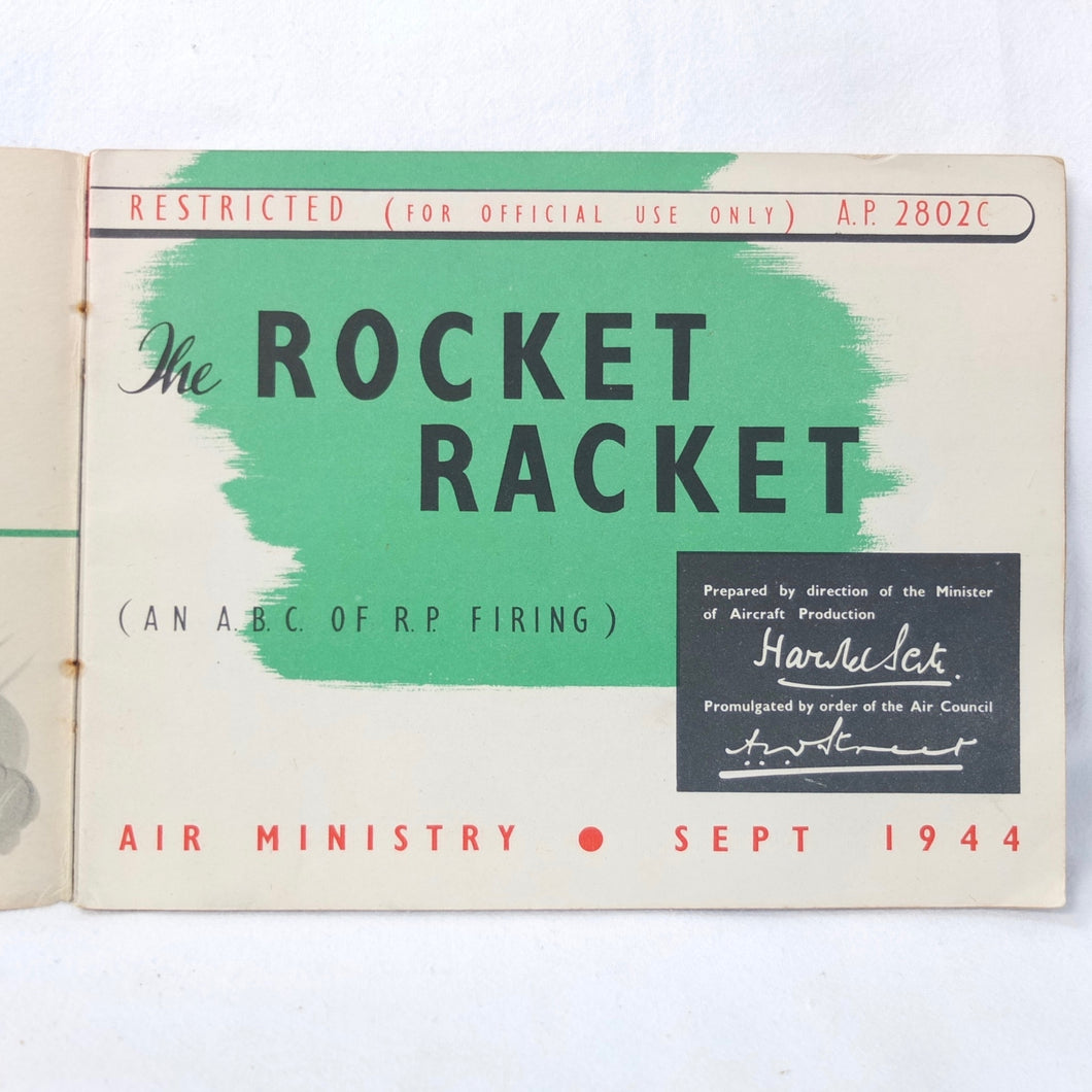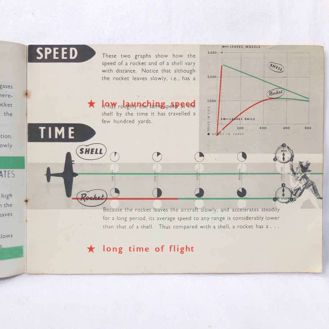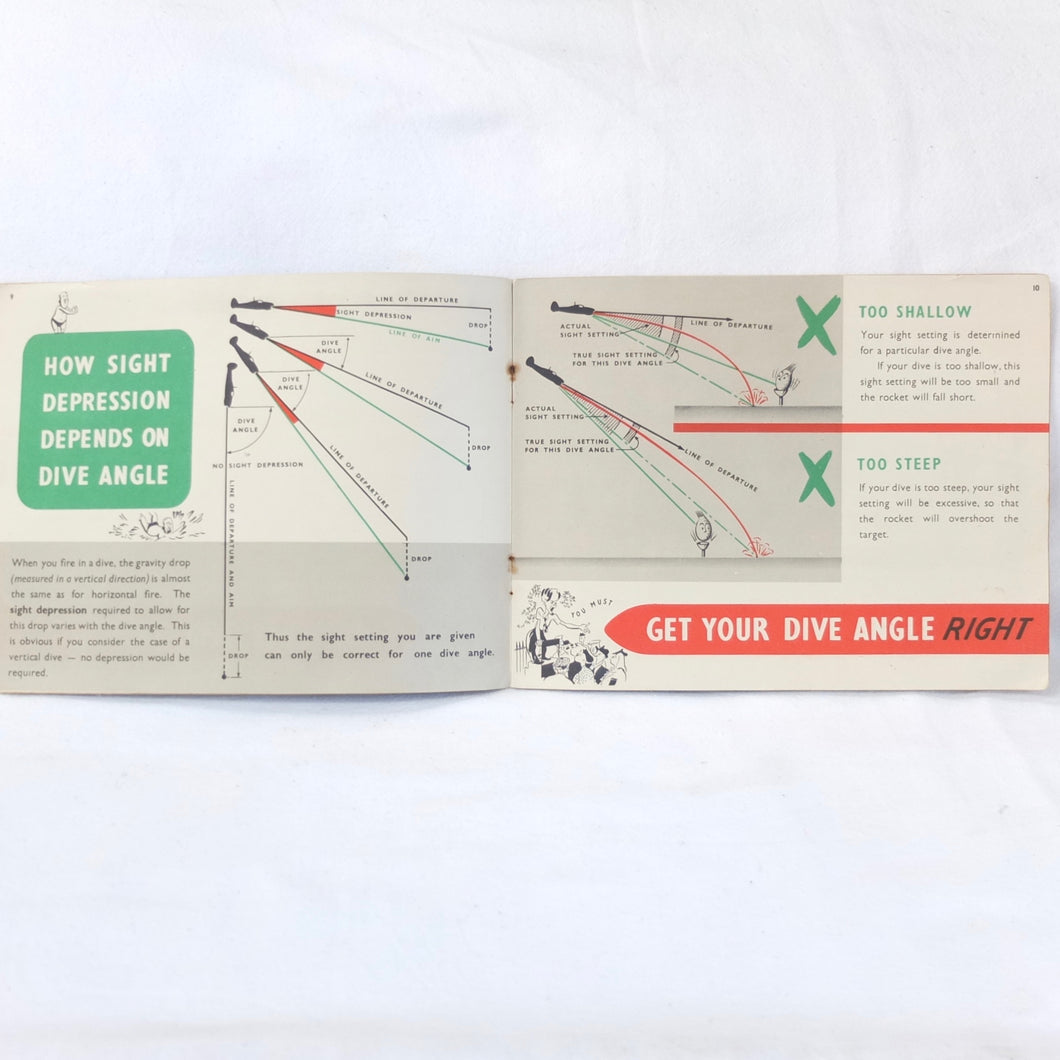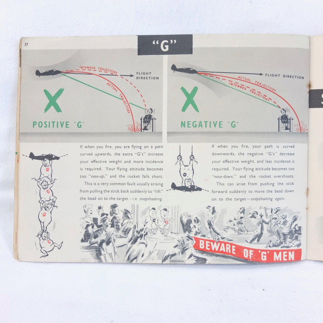 A rare original WW2 Air Ministry manual, published in September 1944. This is a guide to aircraft rocket weapons for RAF and Allied air forces fighter pilots. With instructions, advice, and numerous illustrations on how to aim and fire rockets against ground targets. There are many excellent diagrams showing angles of attack, trajectory, effects of 'G', points of aim, points of release, allowance for speed and wind, airspeed, dive angle, etc. There is also a general introduction to the main advantages of rockets over conventional shells.