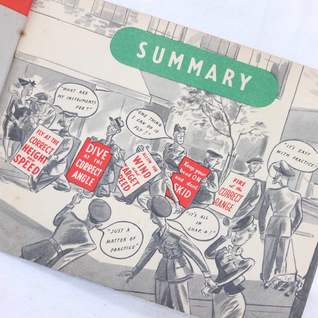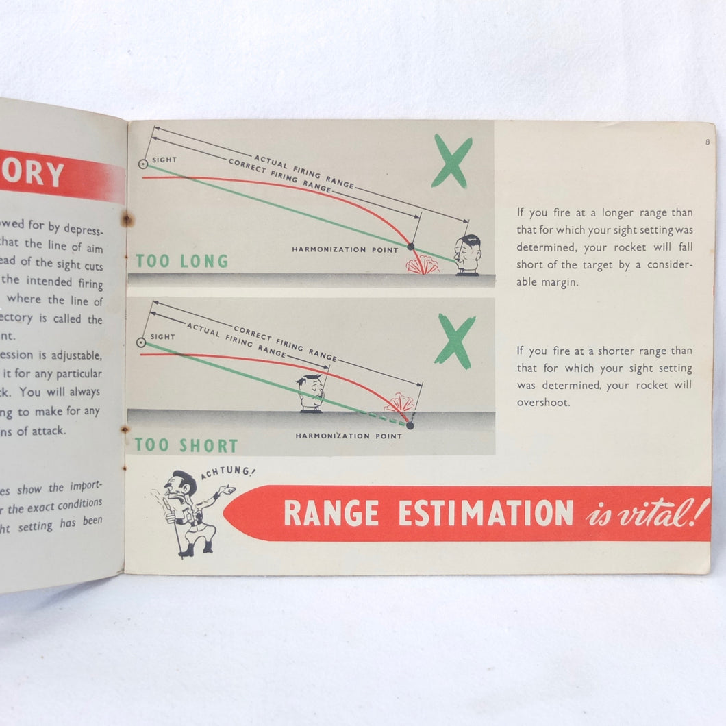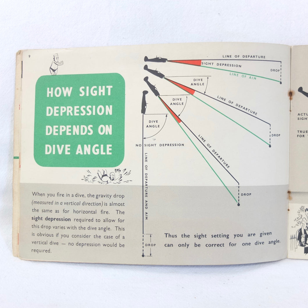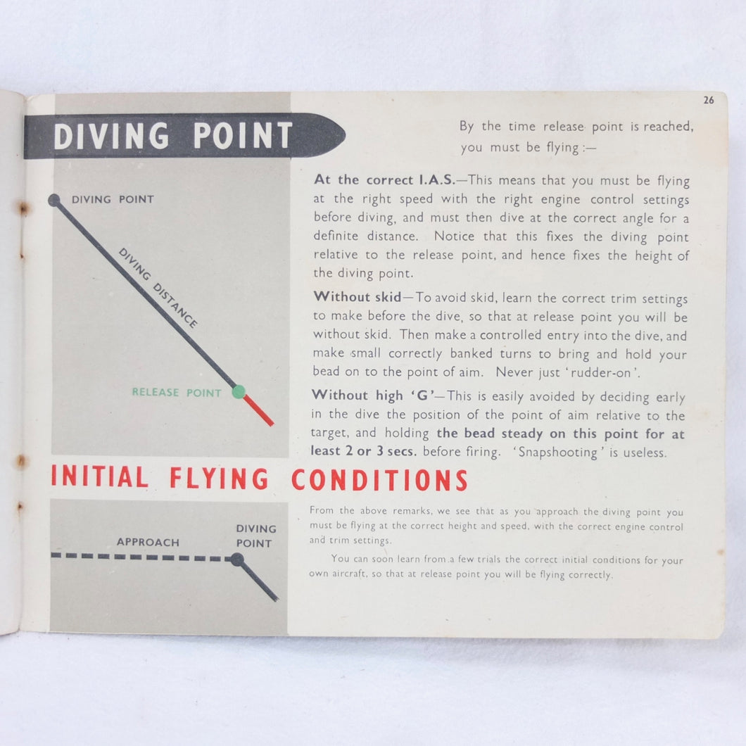 A rare original WW2 Air Ministry manual, published in September 1944. This is a guide to aircraft rocket weapons for RAF and Allied air forces fighter pilots. With instructions, advice, and numerous illustrations on how to aim and fire rockets against ground targets. There are many excellent diagrams showing angles of attack, trajectory, effects of 'G', points of aim, points of release, allowance for speed and wind, airspeed, dive angle, etc. There is also a general introduction to the main advantages of rockets over conventional shells.