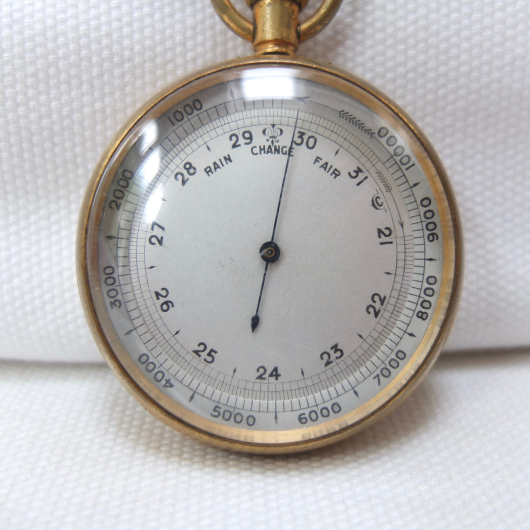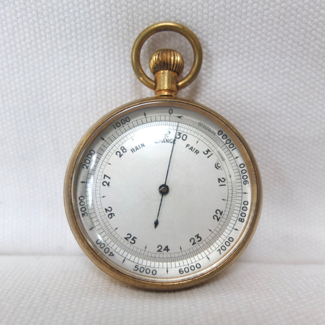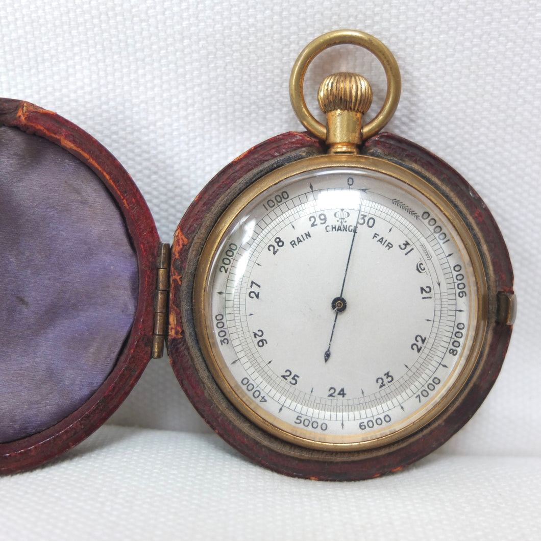 A Victorian pocket altimeter barometer, dating from c.1900. It would have been used by explorers, mountaineers, or travellers. Although there are no obvious maker's marks, it was made in England, probably around 1900, by one of the best makers, almost certainly Francis Barker. Francis Barker was a prolific maker of pocket barometers from the Victorian era through to the early 20th century. Almost all of Barker's barometers were supplied unsigned to the retail trade, with the retailer often adding their own details to the dial. But Barker often added a discreet marking on the dial, a kind of hidden signature - in this case it can be seen in the letter 'C' placed between the '31' and '21' markings. The dial is calibrated from zero to 10,000 feet, with additional 'Rain', 'Change', and 'Fair' markings. The barometer has a gilt brass case, blued needle, a rotating bezel operated by turning the crown, and an adjustment screw on the rear. Two almost identical Barometers, made by Francis Barker between 1905-1910, can be seen on pages 86-87 of Paul Crespel's book Trade Mark London.