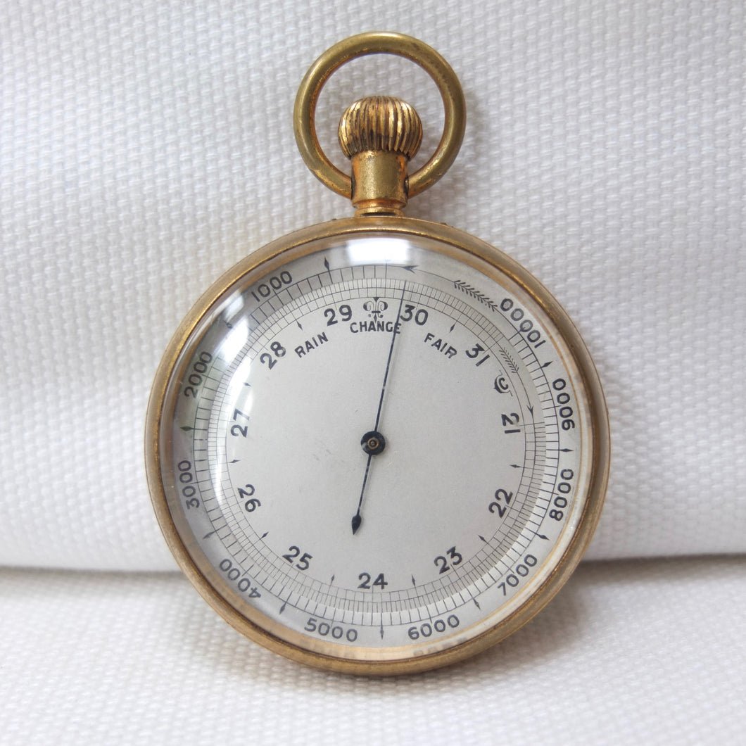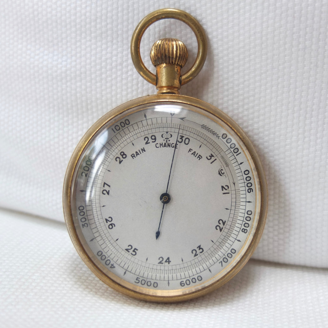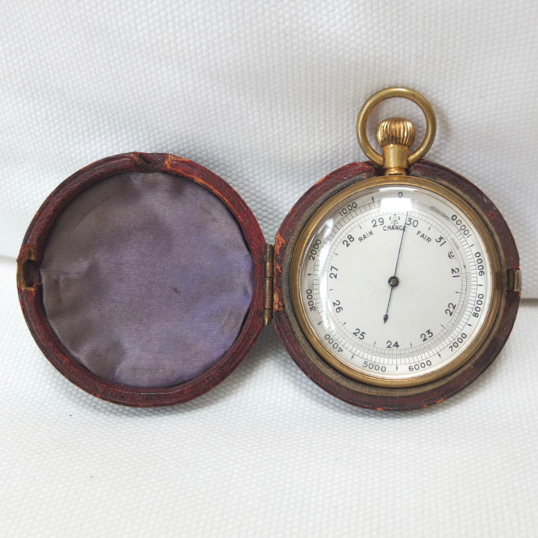 A Victorian pocket altimeter barometer, dating from c.1900. It would have been used by explorers, mountaineers, or travellers. Although there are no obvious maker's marks, it was made in England, probably around 1900, by one of the best makers, almost certainly Francis Barker. Francis Barker was a prolific maker of pocket barometers from the Victorian era through to the early 20th century. Almost all of Barker's barometers were supplied unsigned to the retail trade, with the retailer often adding their own details to the dial. But Barker often added a discreet marking on the dial, a kind of hidden signature - in this case it can be seen in the letter 'C' placed between the '31' and '21' markings. The dial is calibrated from zero to 10,000 feet, with additional 'Rain', 'Change', and 'Fair' markings. The barometer has a gilt brass case, blued needle, a rotating bezel operated by turning the crown, and an adjustment screw on the rear. Two almost identical Barometers, made by Francis Barker between 1905-1910, can be seen on pages 86-87 of Paul Crespel's book Trade Mark London.