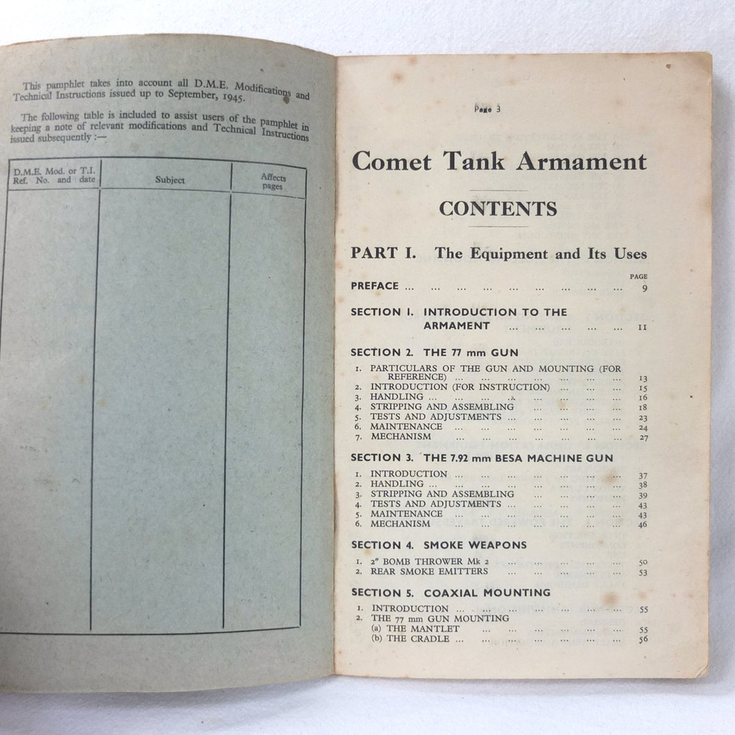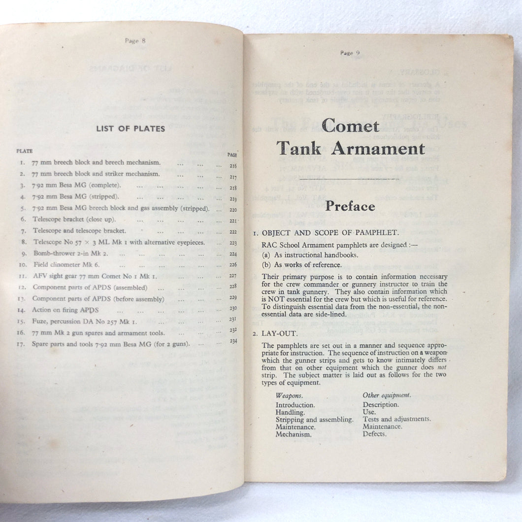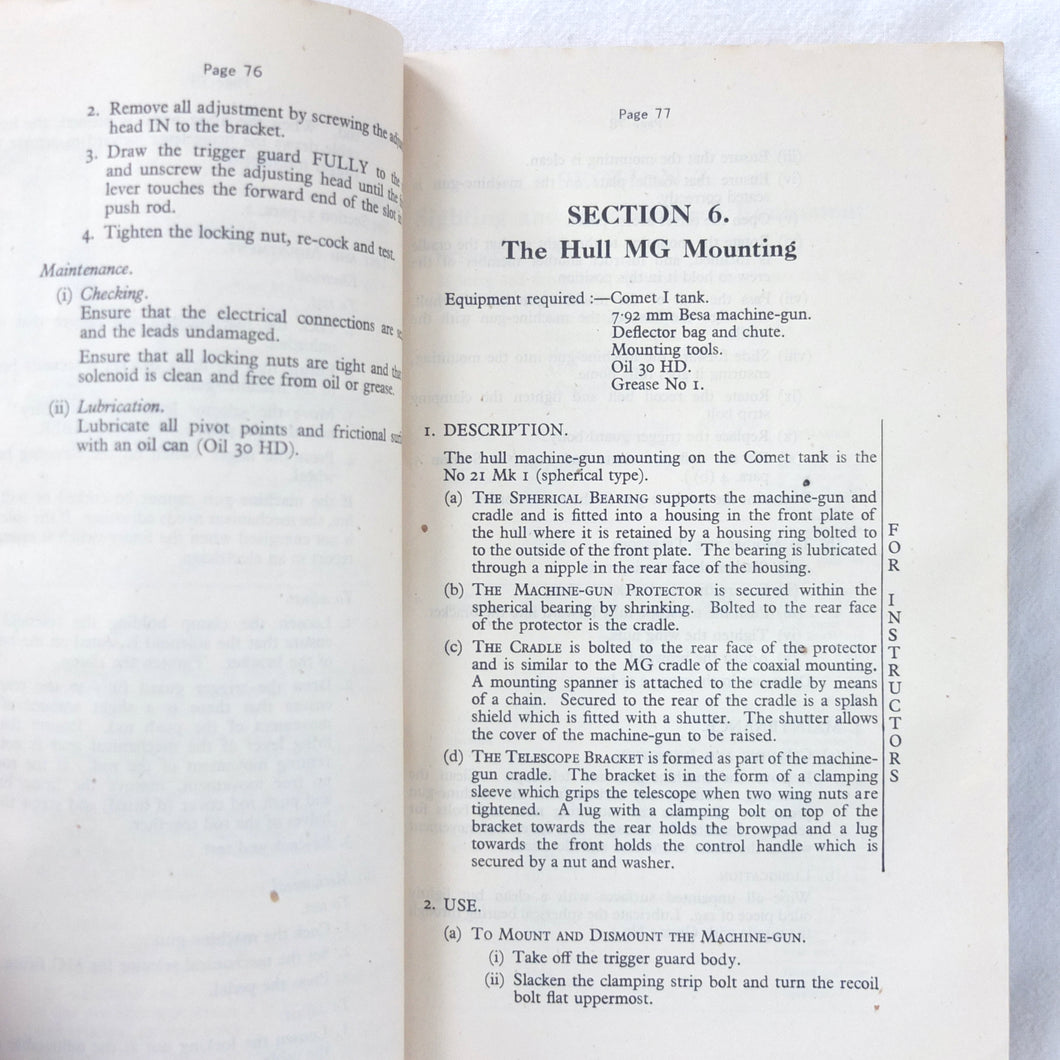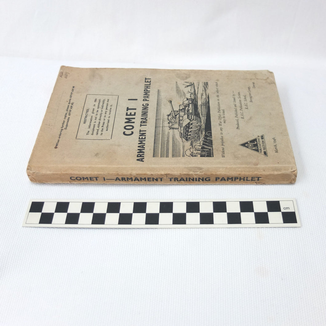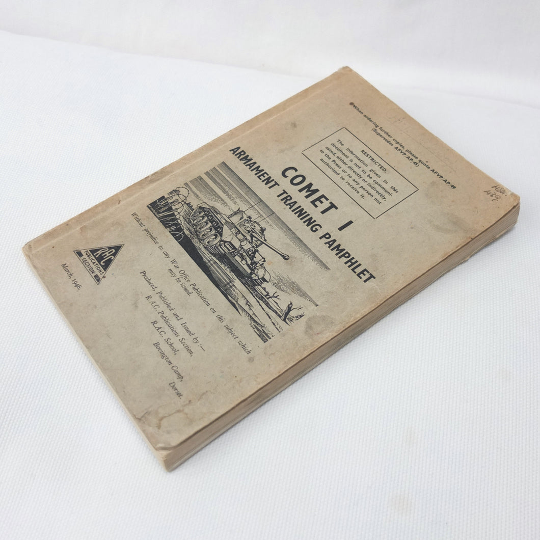 A rare original Royal Armoured Corps handbook for the Comet Tank, published in March 1946. Produced by the R.A.C., the handbook is a well illustrated guide to the use and maintenance of the armament and ammunition of Mk I Comet Tank. Subjects covered include: introduction to armament, 77mm gun, 7.92 BESA MG, smoke weapons, co-axial mountings, machine gun shooting, shooting at moving targets, shooting on the move, fire discipline, tools and spares, aiming, sighting equipment, ammunition, techniques of shooting, stationary targets, etc.