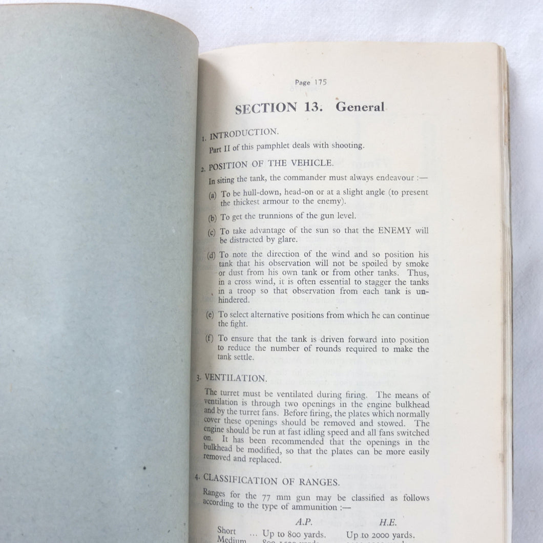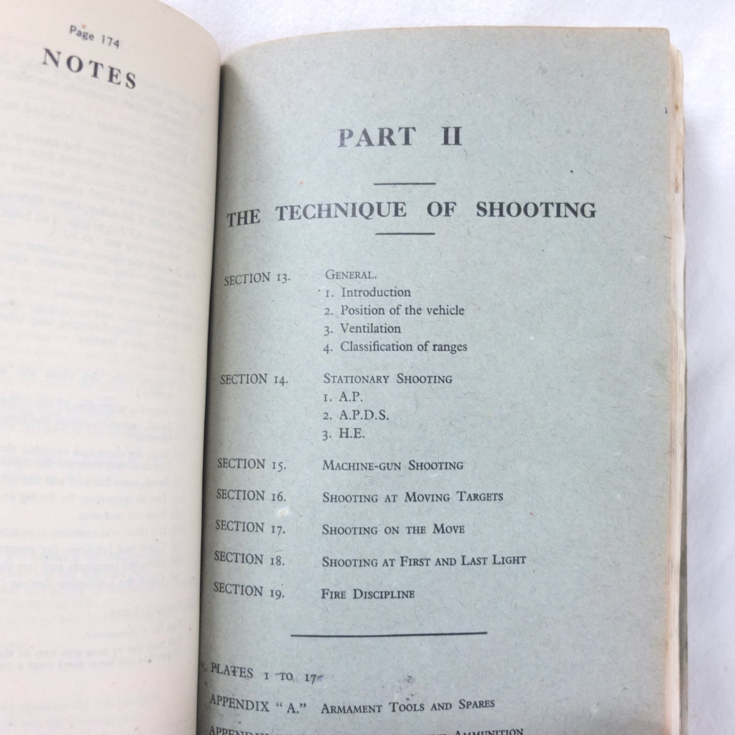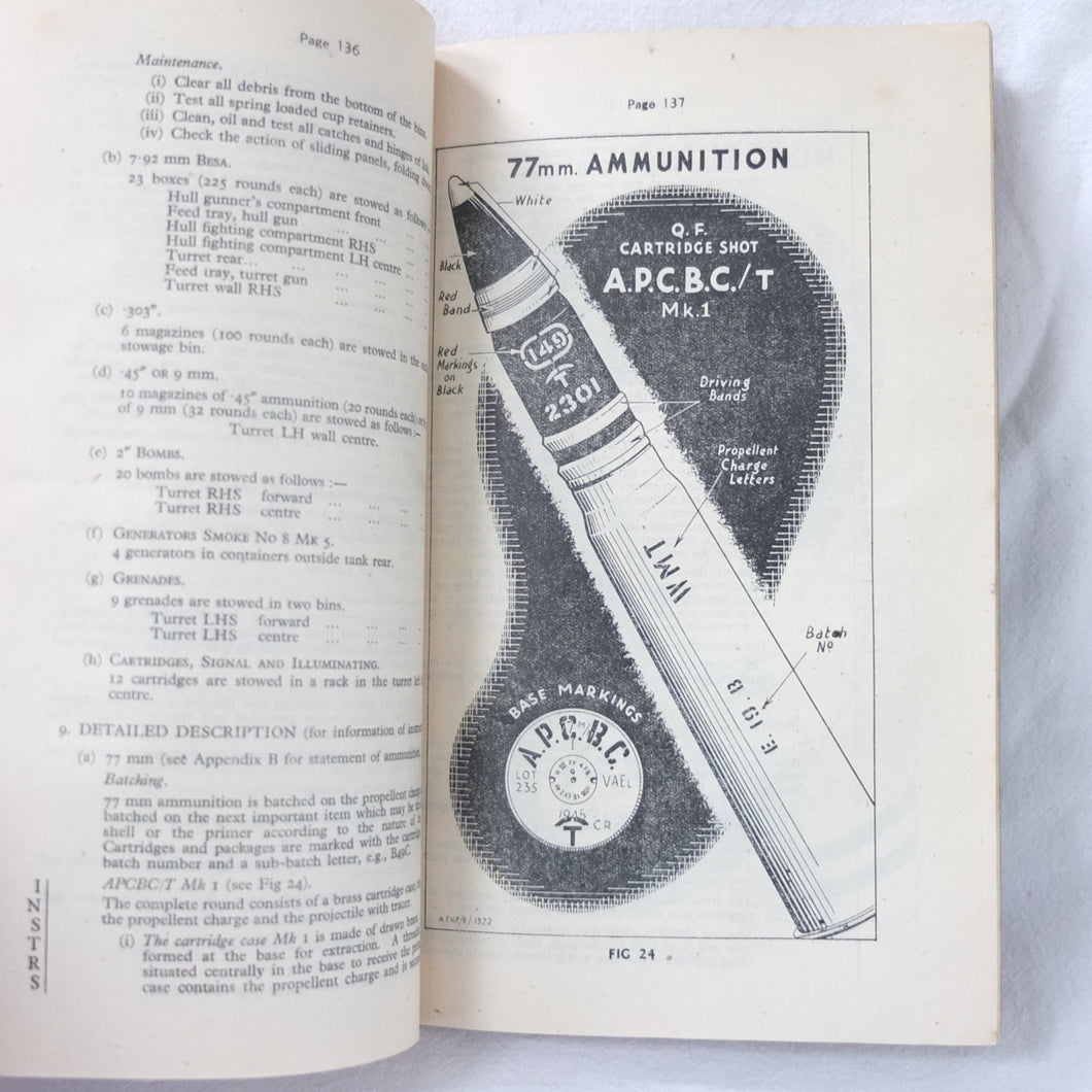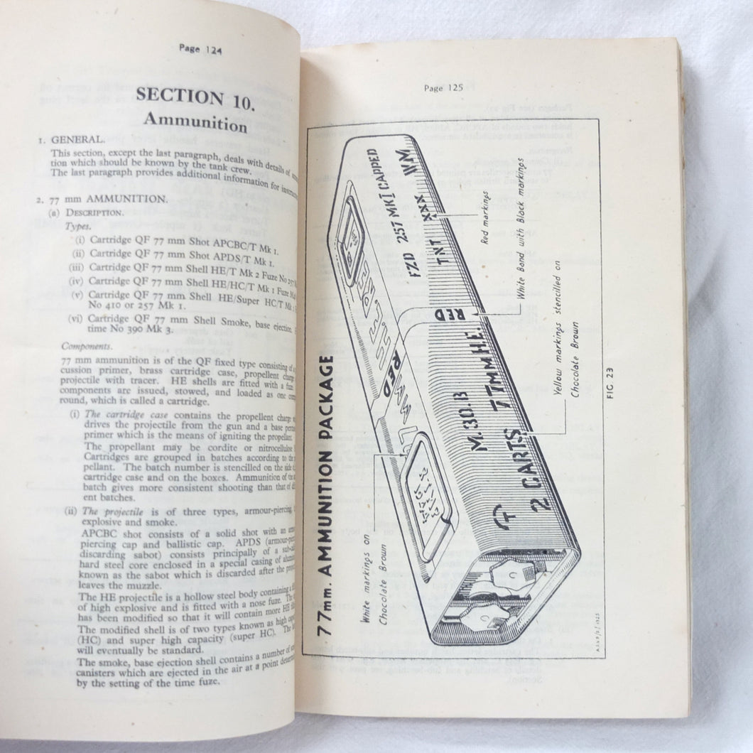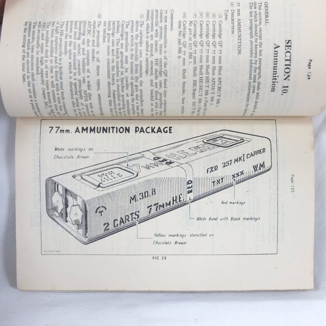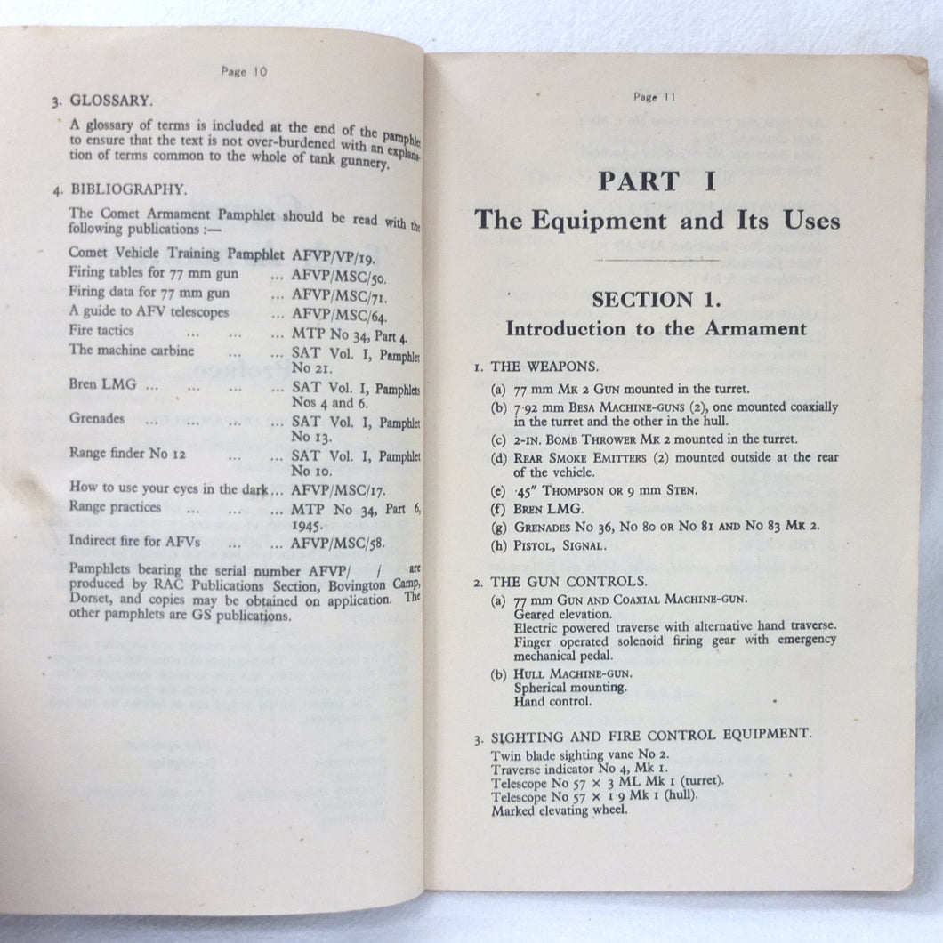 A rare original Royal Armoured Corps handbook for the Comet Tank, published in March 1946. Produced by the R.A.C., the handbook is a well illustrated guide to the use and maintenance of the armament and ammunition of Mk I Comet Tank. Subjects covered include: introduction to armament, 77mm gun, 7.92 BESA MG, smoke weapons, co-axial mountings, machine gun shooting, shooting at moving targets, shooting on the move, fire discipline, tools and spares, aiming, sighting equipment, ammunition, techniques of shooting, stationary targets, etc.