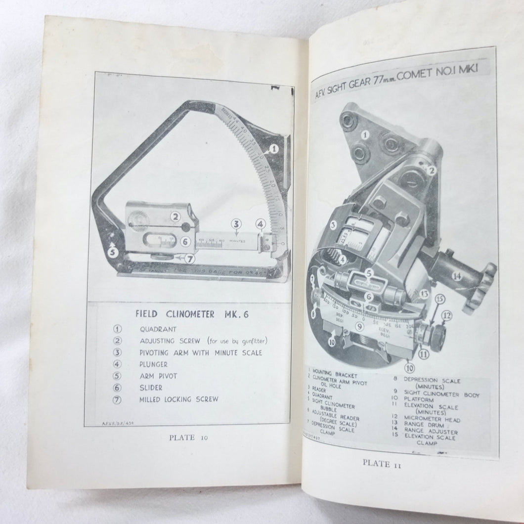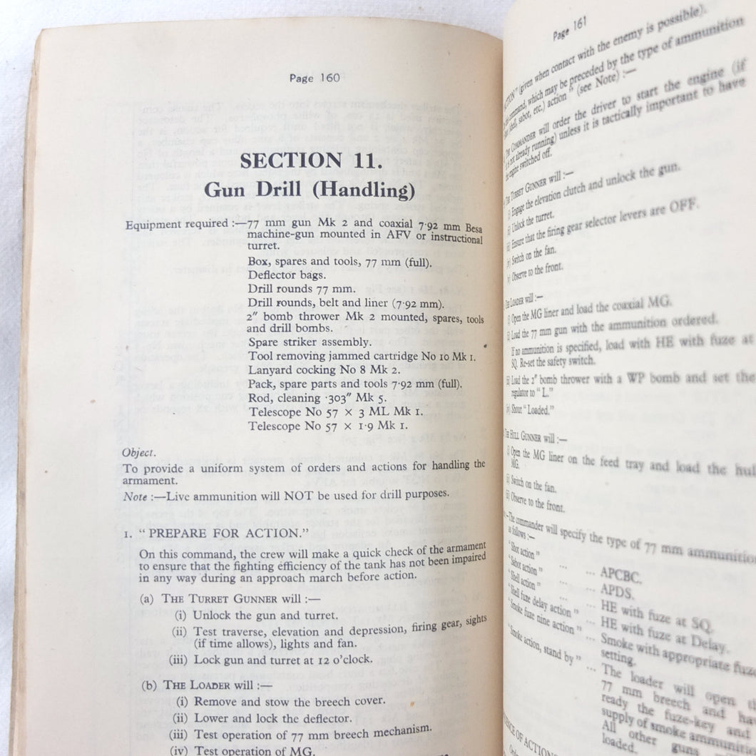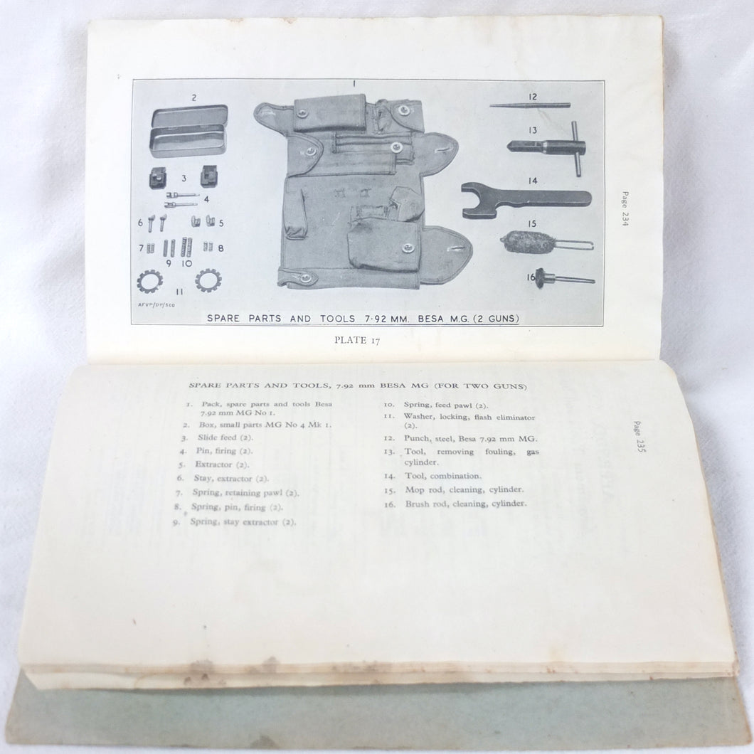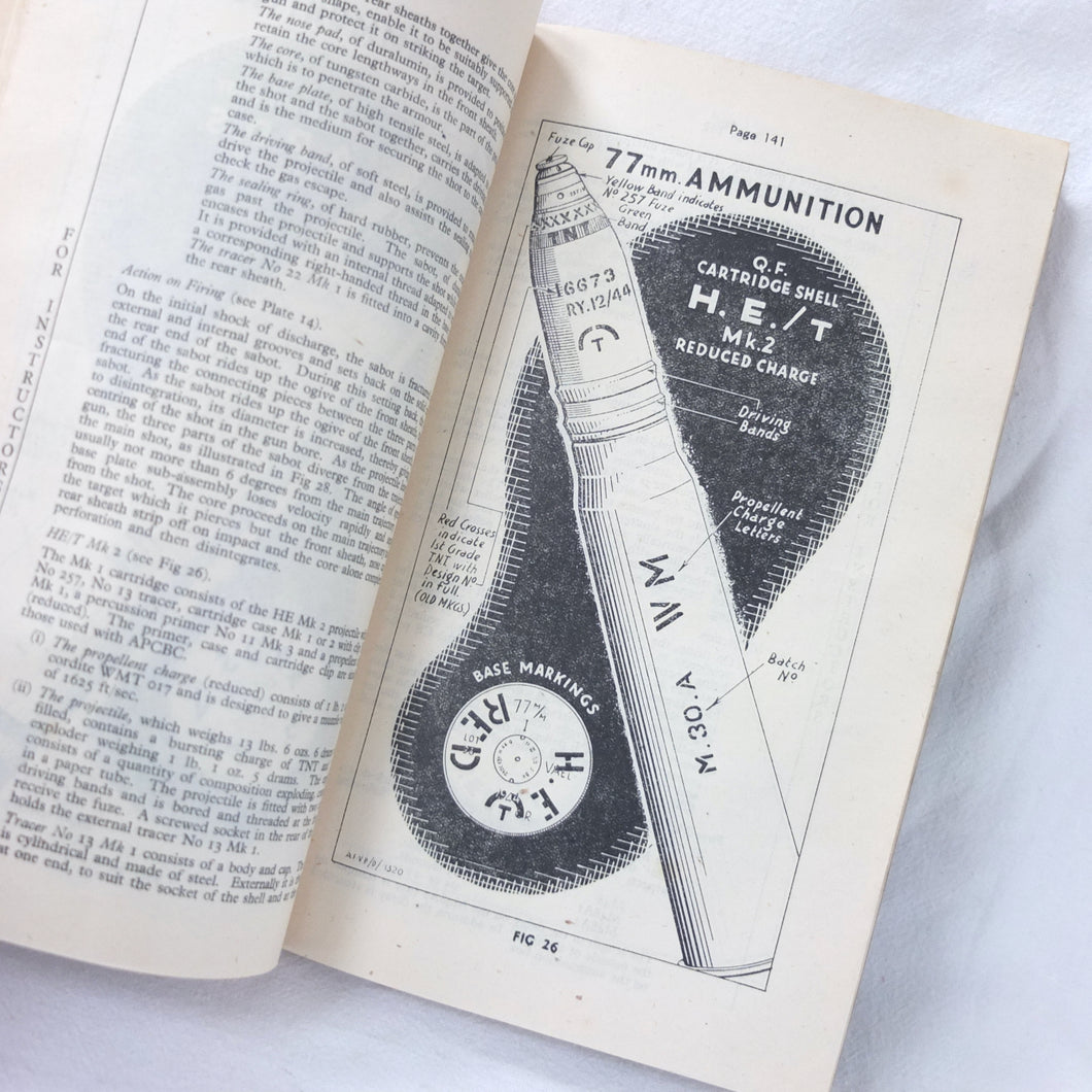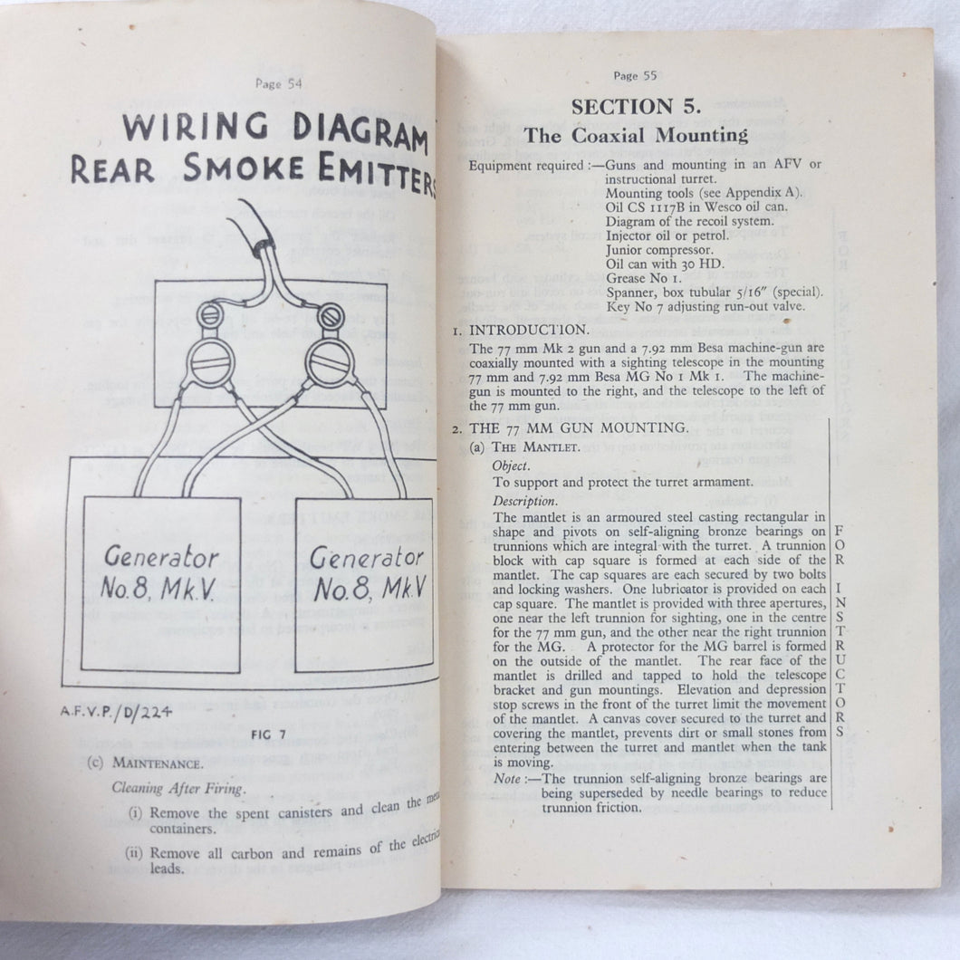 A rare original Royal Armoured Corps handbook for the Comet Tank, published in March 1946. Produced by the R.A.C., the handbook is a well illustrated guide to the use and maintenance of the armament and ammunition of Mk I Comet Tank. Subjects covered include: introduction to armament, 77mm gun, 7.92 BESA MG, smoke weapons, co-axial mountings, machine gun shooting, shooting at moving targets, shooting on the move, fire discipline, tools and spares, aiming, sighting equipment, ammunition, techniques of shooting, stationary targets, etc.