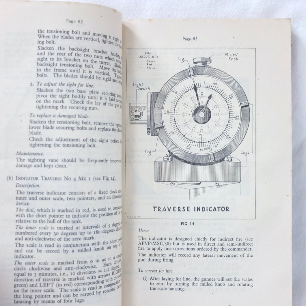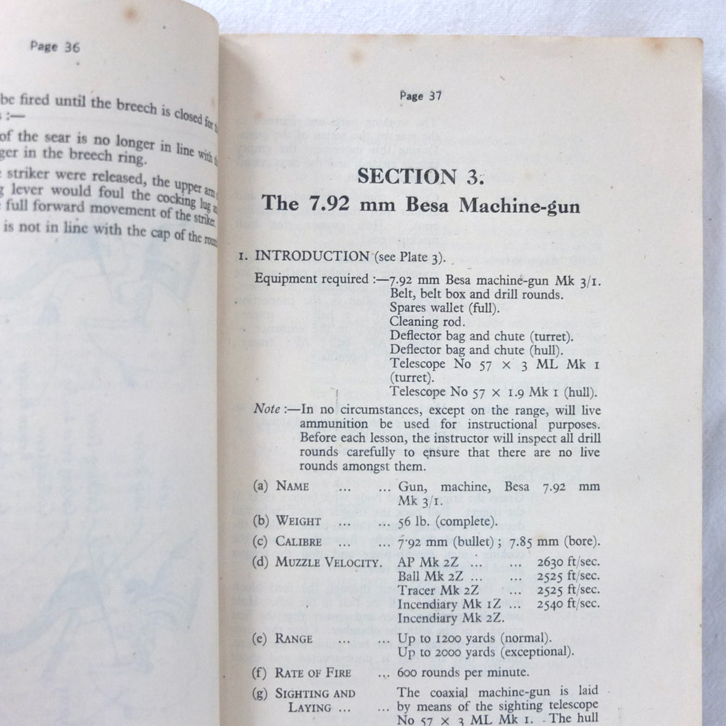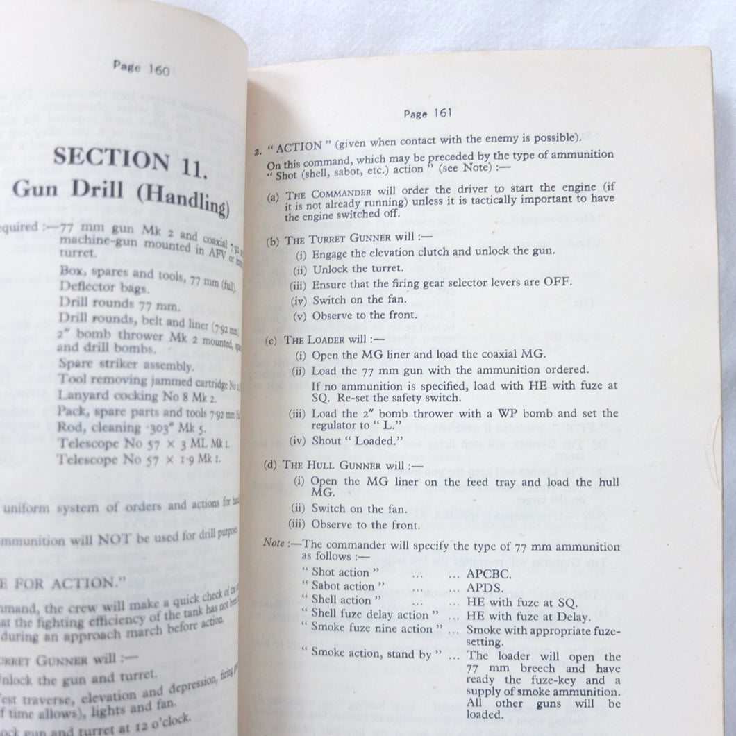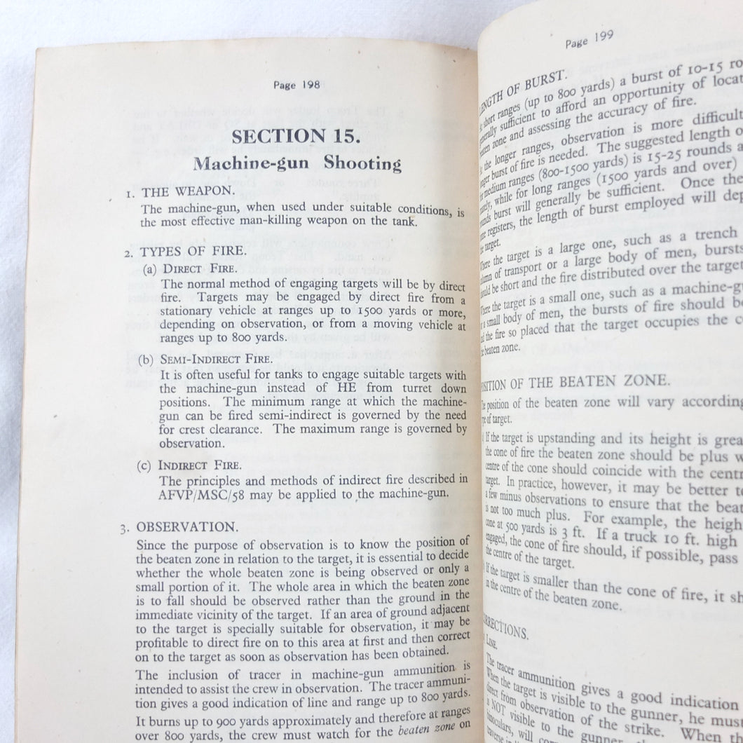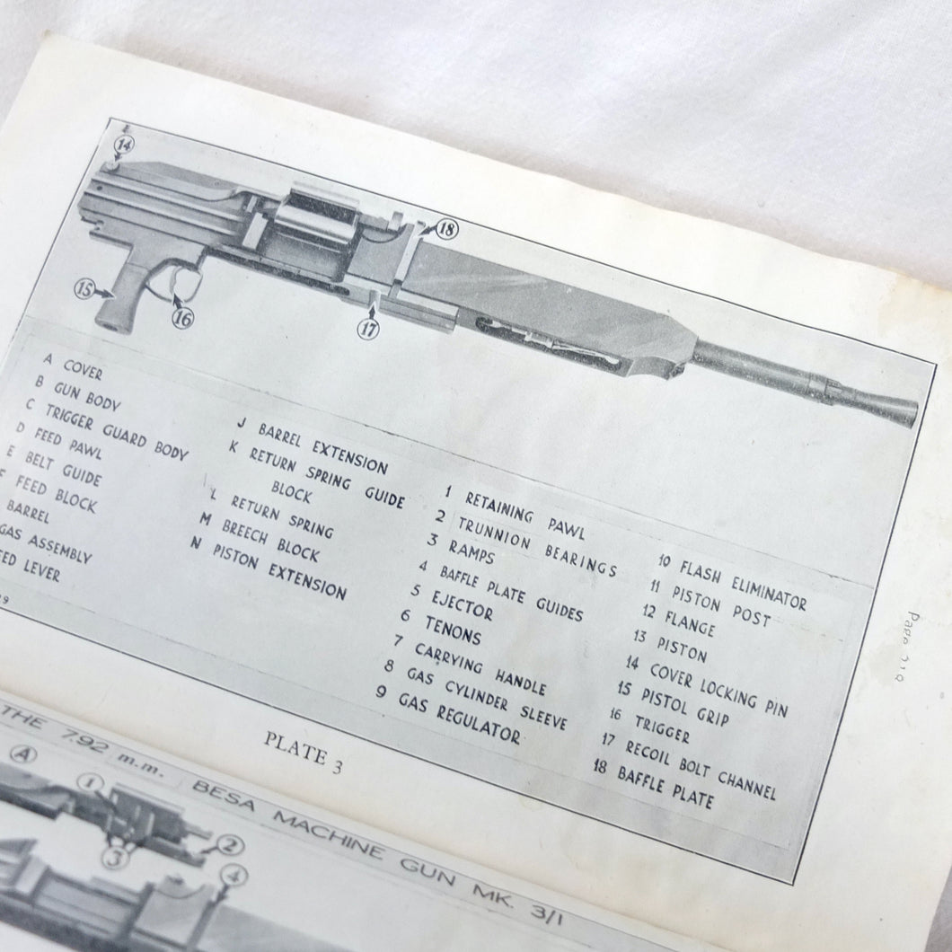 A rare original Royal Armoured Corps handbook for the Comet Tank, published in March 1946. Produced by the R.A.C., the handbook is a well illustrated guide to the use and maintenance of the armament and ammunition of Mk I Comet Tank. Subjects covered include: introduction to armament, 77mm gun, 7.92 BESA MG, smoke weapons, co-axial mountings, machine gun shooting, shooting at moving targets, shooting on the move, fire discipline, tools and spares, aiming, sighting equipment, ammunition, techniques of shooting, stationary targets, etc.