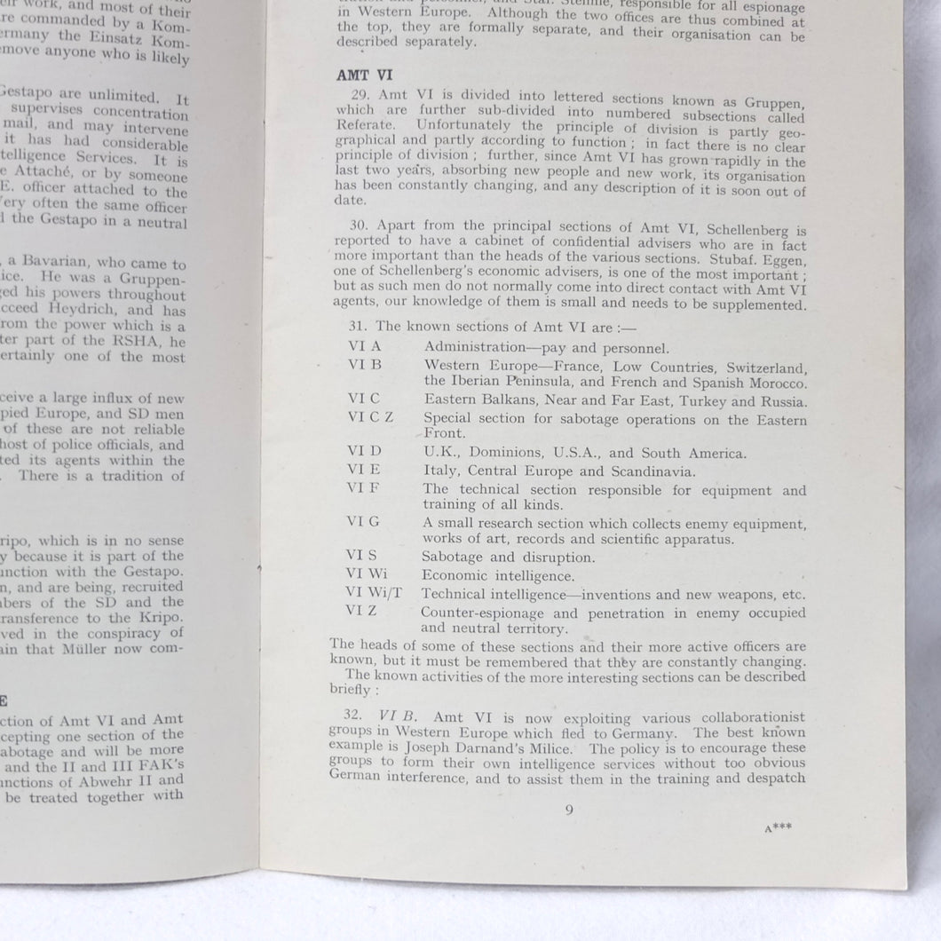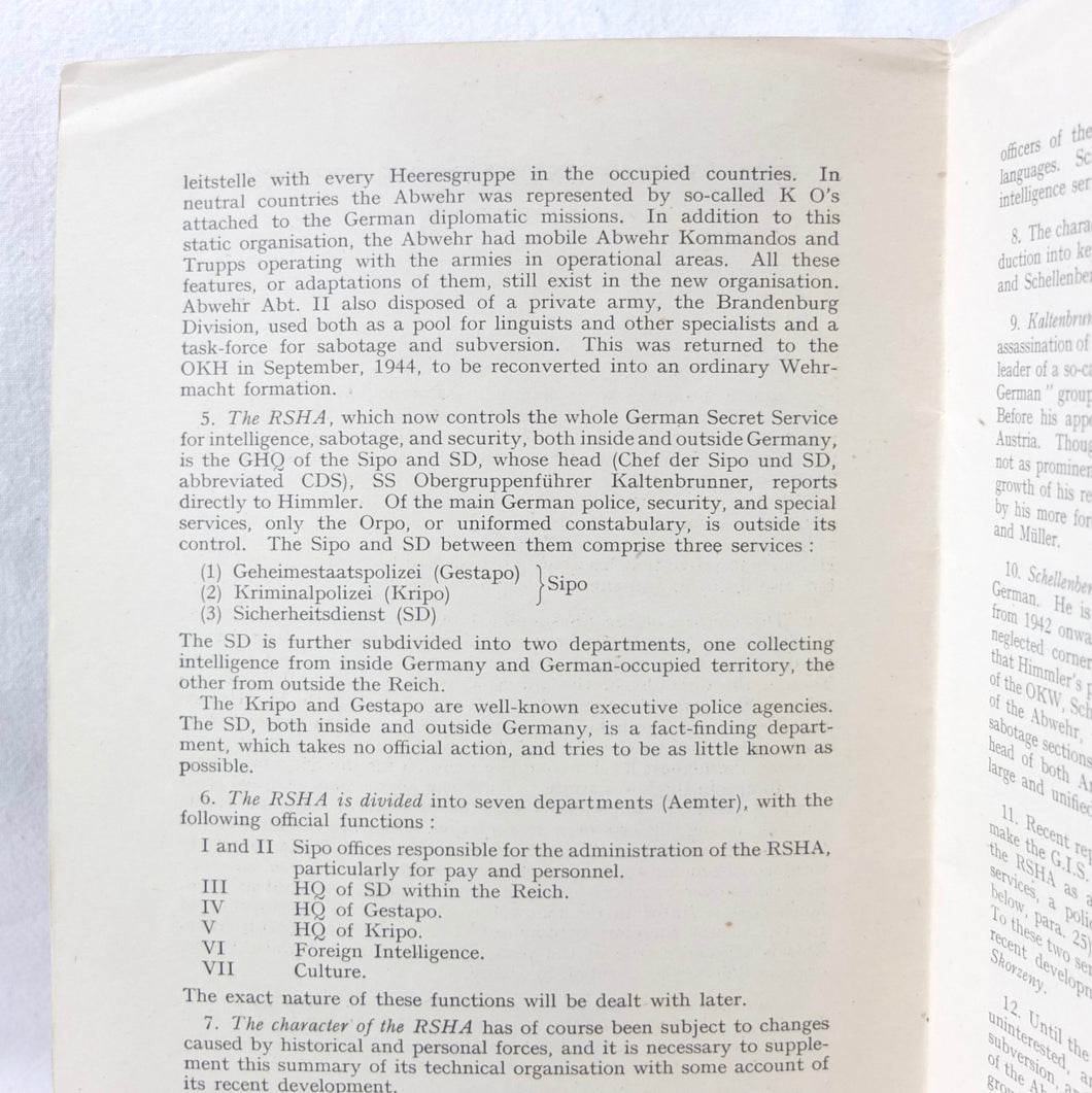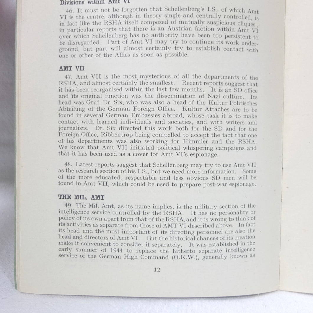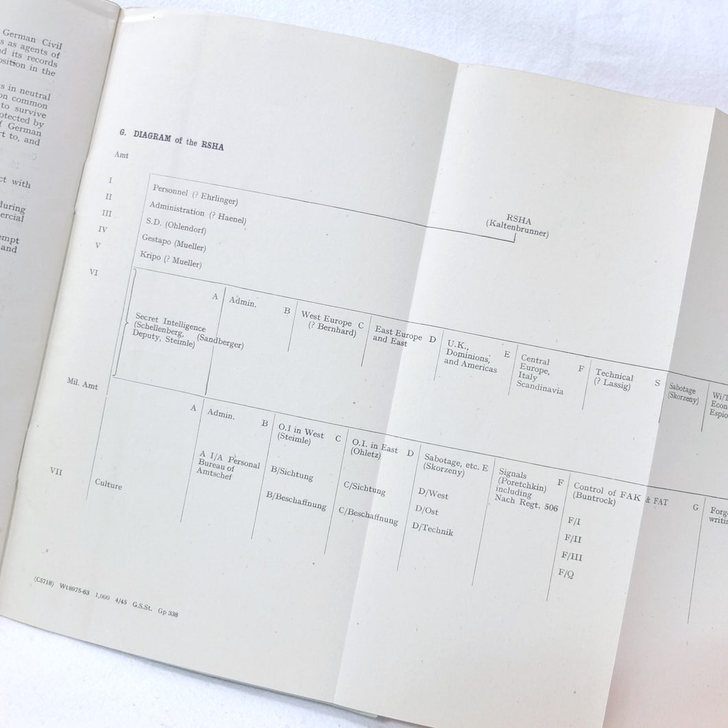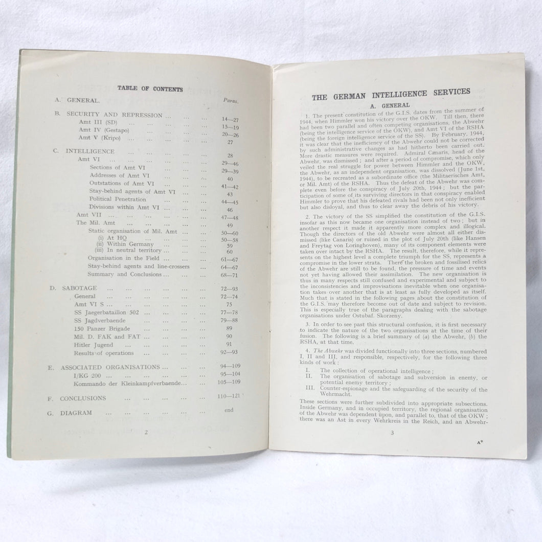 The German Intelligence Service provides an overview of the Third Reich's intelligence services. It would have been based on the work of M.I. 14, the British wartime department that specialised in intelligence about Germany. Also known as 'Section 14', M.I. 14 was a department of the British Directorate of Military Intelligence. M.I. 14 was closely associated with M.I.R.S. (Military Intelligence Research Section) which was a joint Anglo-American agency with offices in Washington DC and London, founded in 1943 under the supervision of M.I. 14 and G-2 (Counter Intelligence).