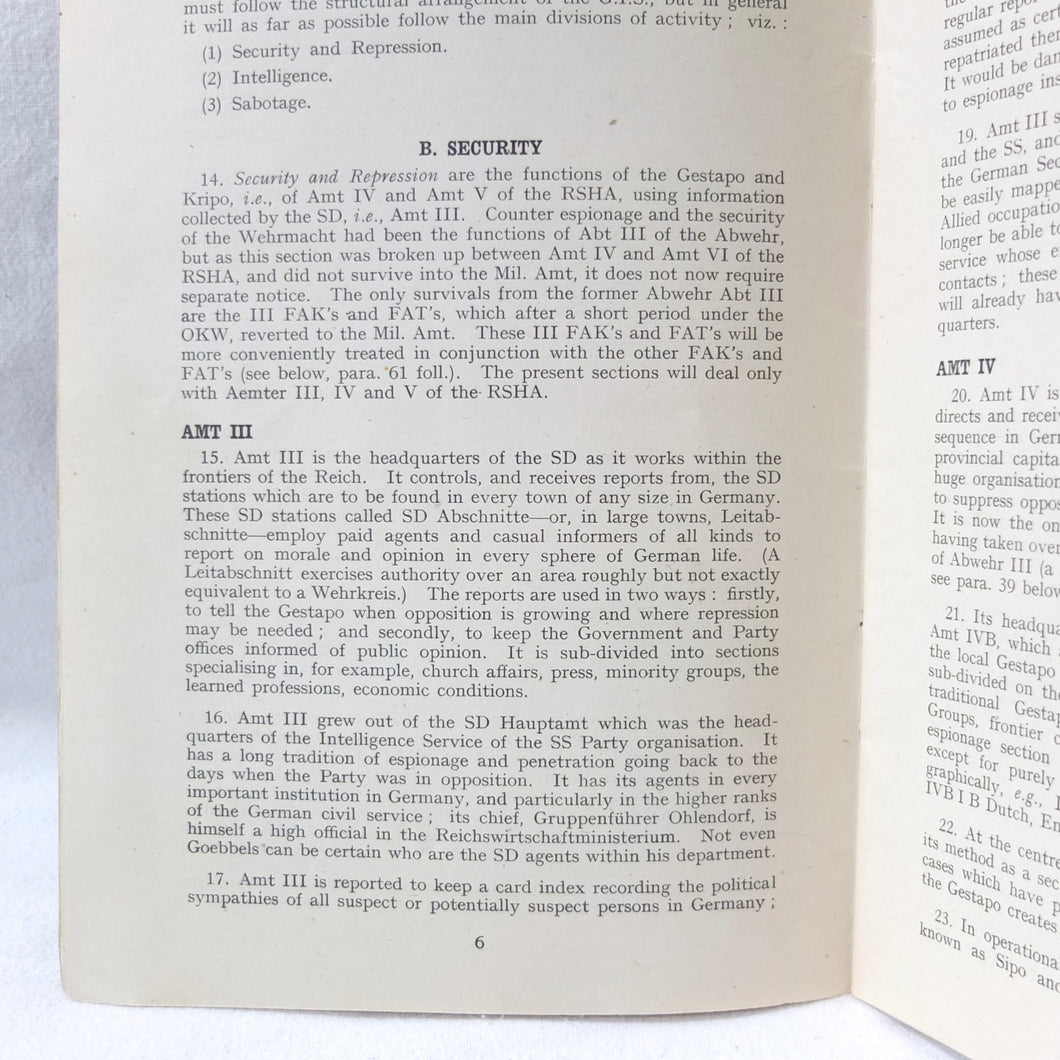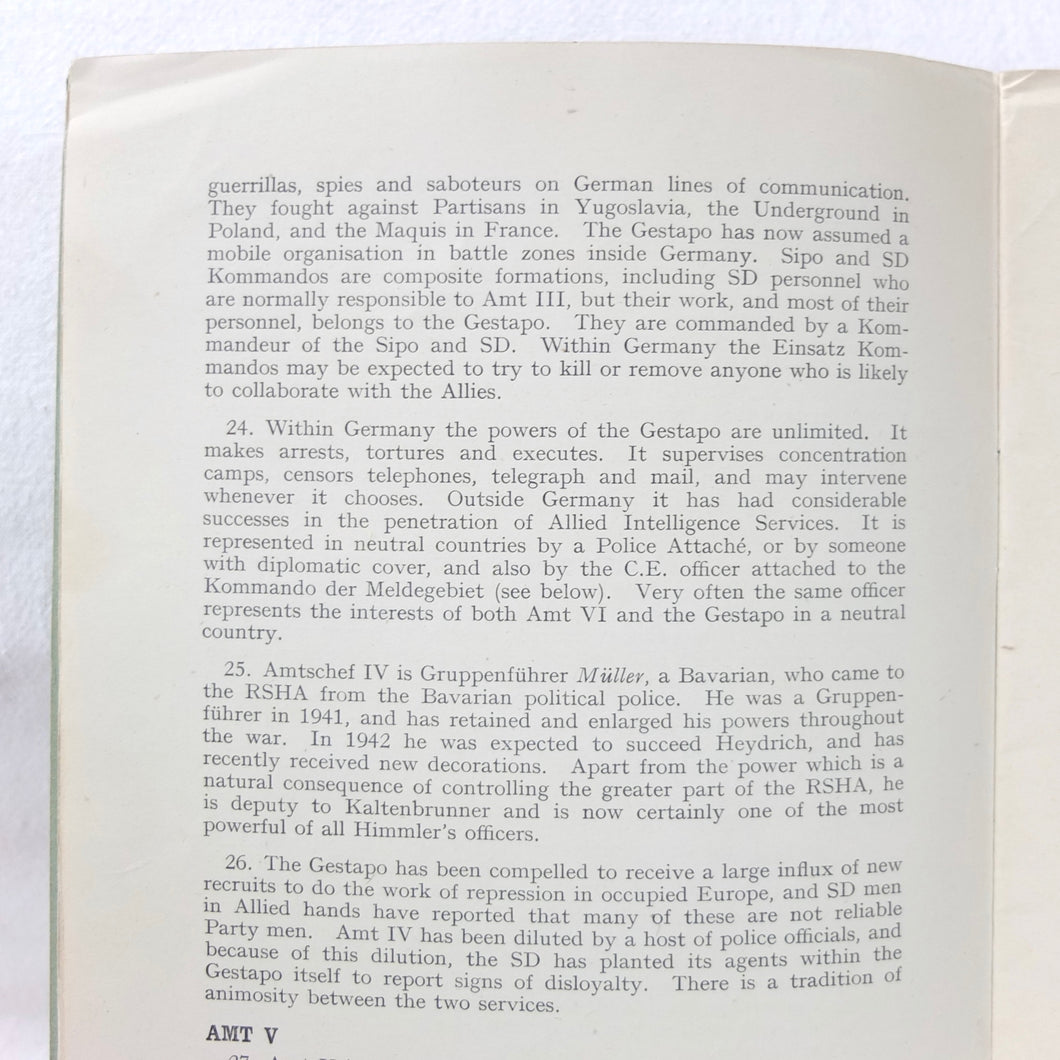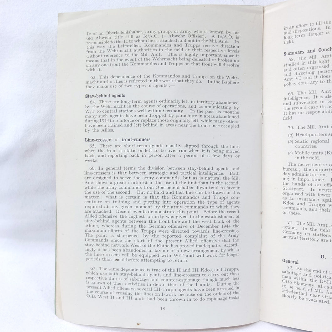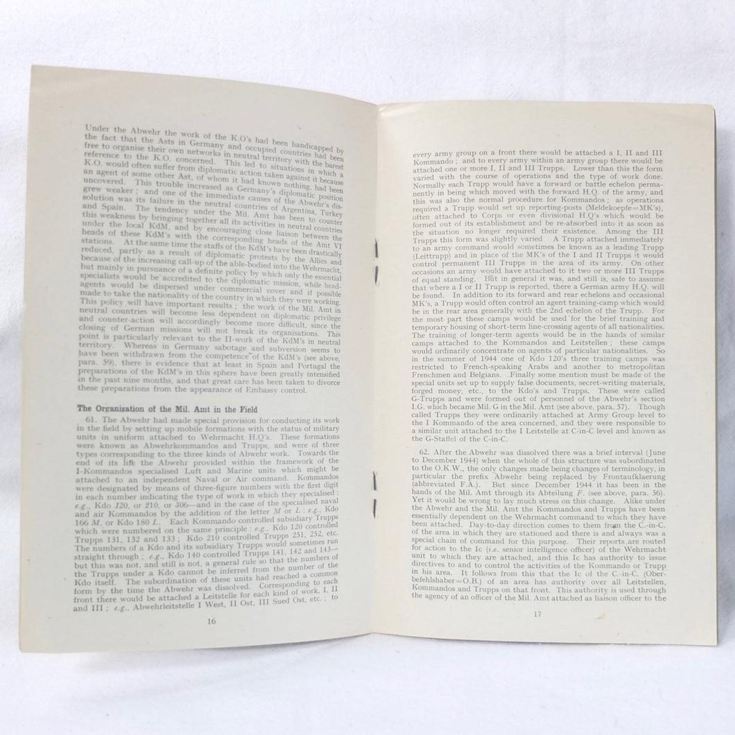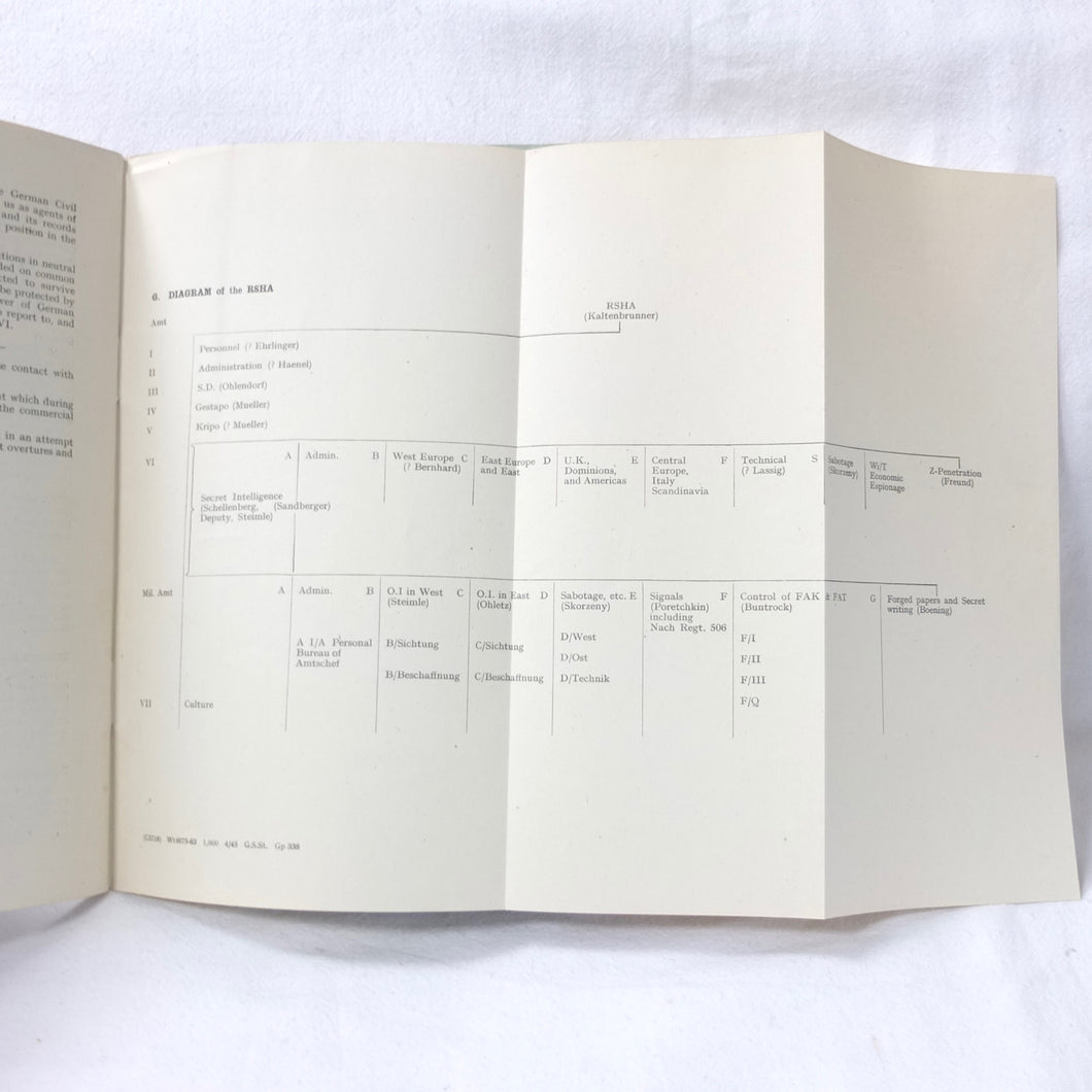 The German Intelligence Service provides an overview of the Third Reich's intelligence services. It would have been based on the work of M.I. 14, the British wartime department that specialised in intelligence about Germany. Also known as 'Section 14', M.I. 14 was a department of the British Directorate of Military Intelligence. M.I. 14 was closely associated with M.I.R.S. (Military Intelligence Research Section) which was a joint Anglo-American agency with offices in Washington DC and London, founded in 1943 under the supervision of M.I. 14 and G-2 (Counter Intelligence).