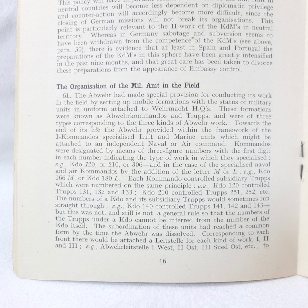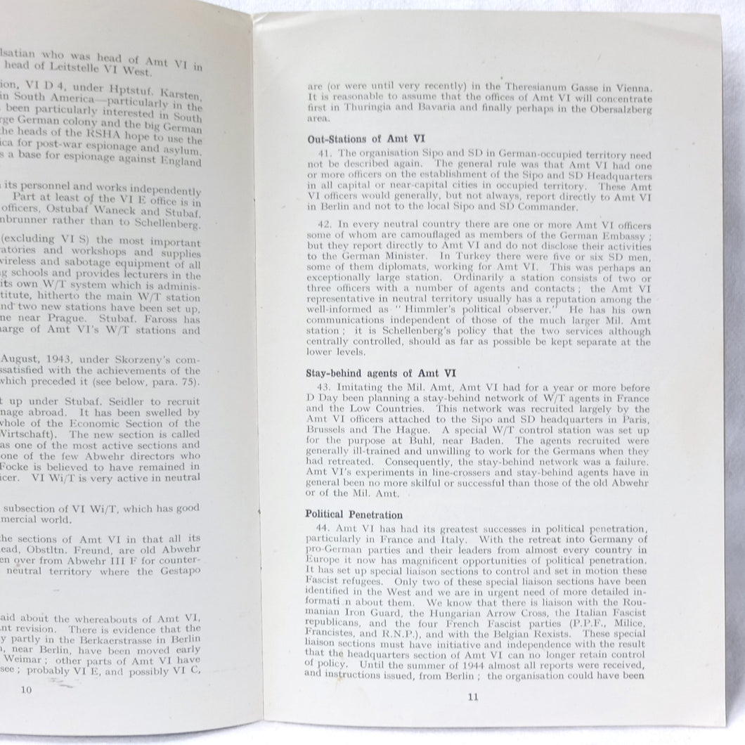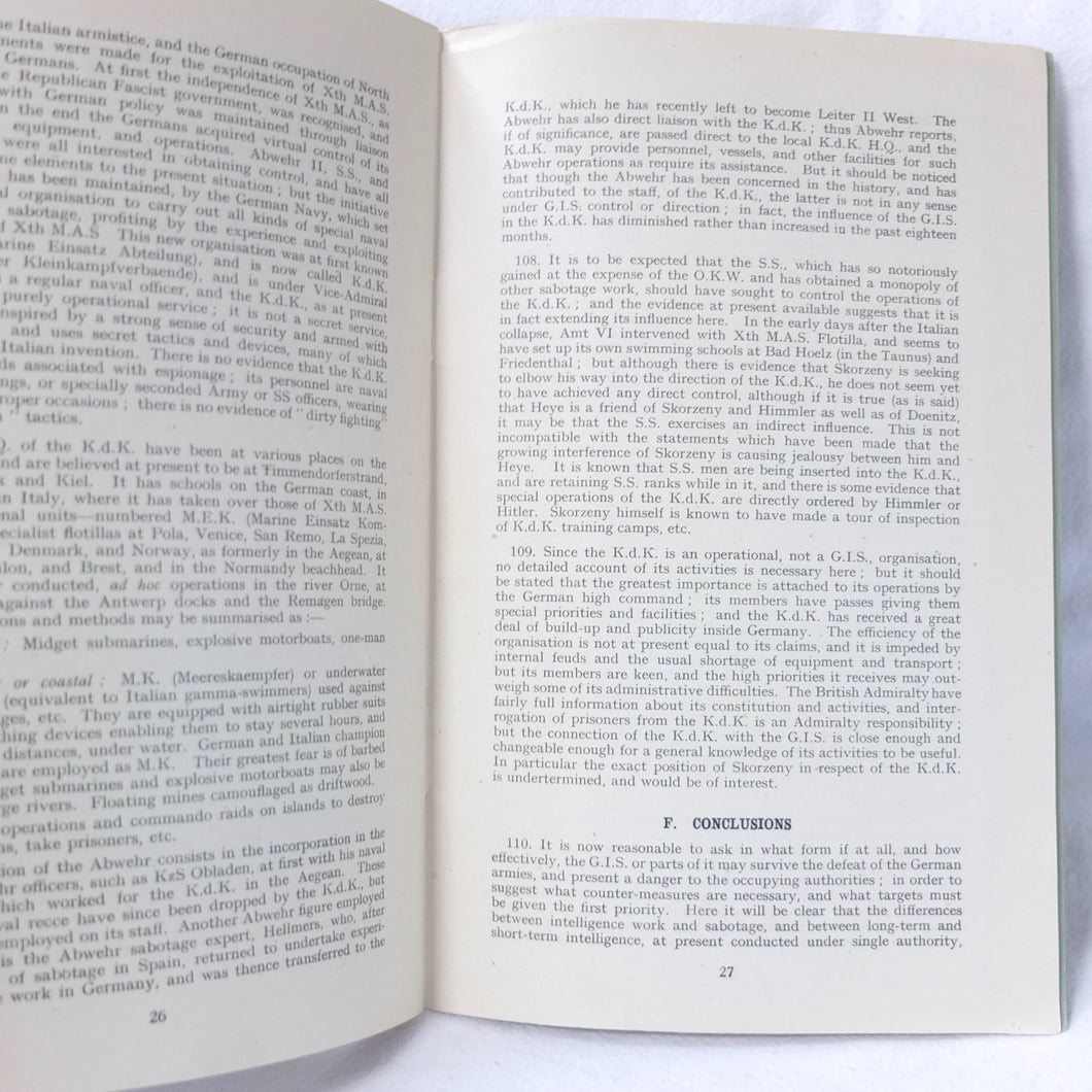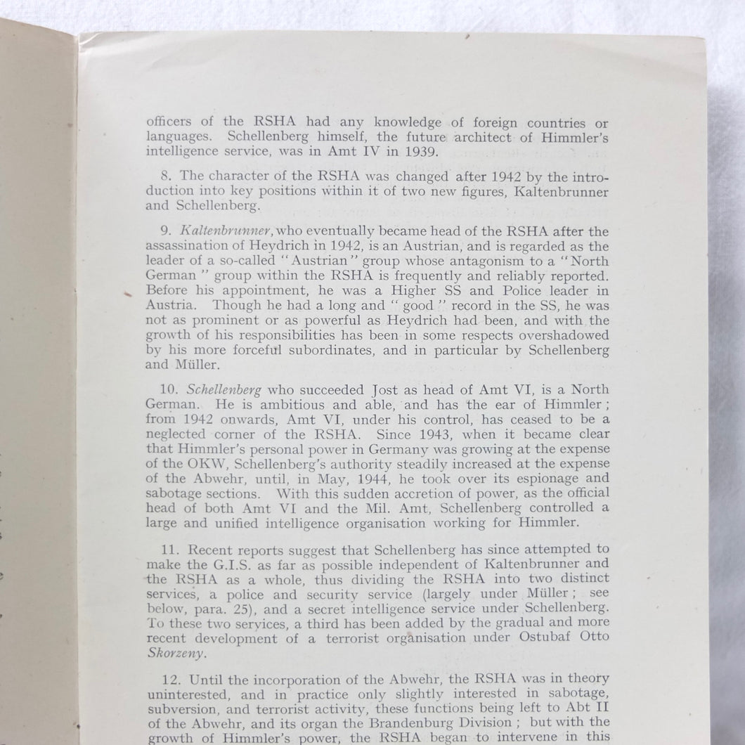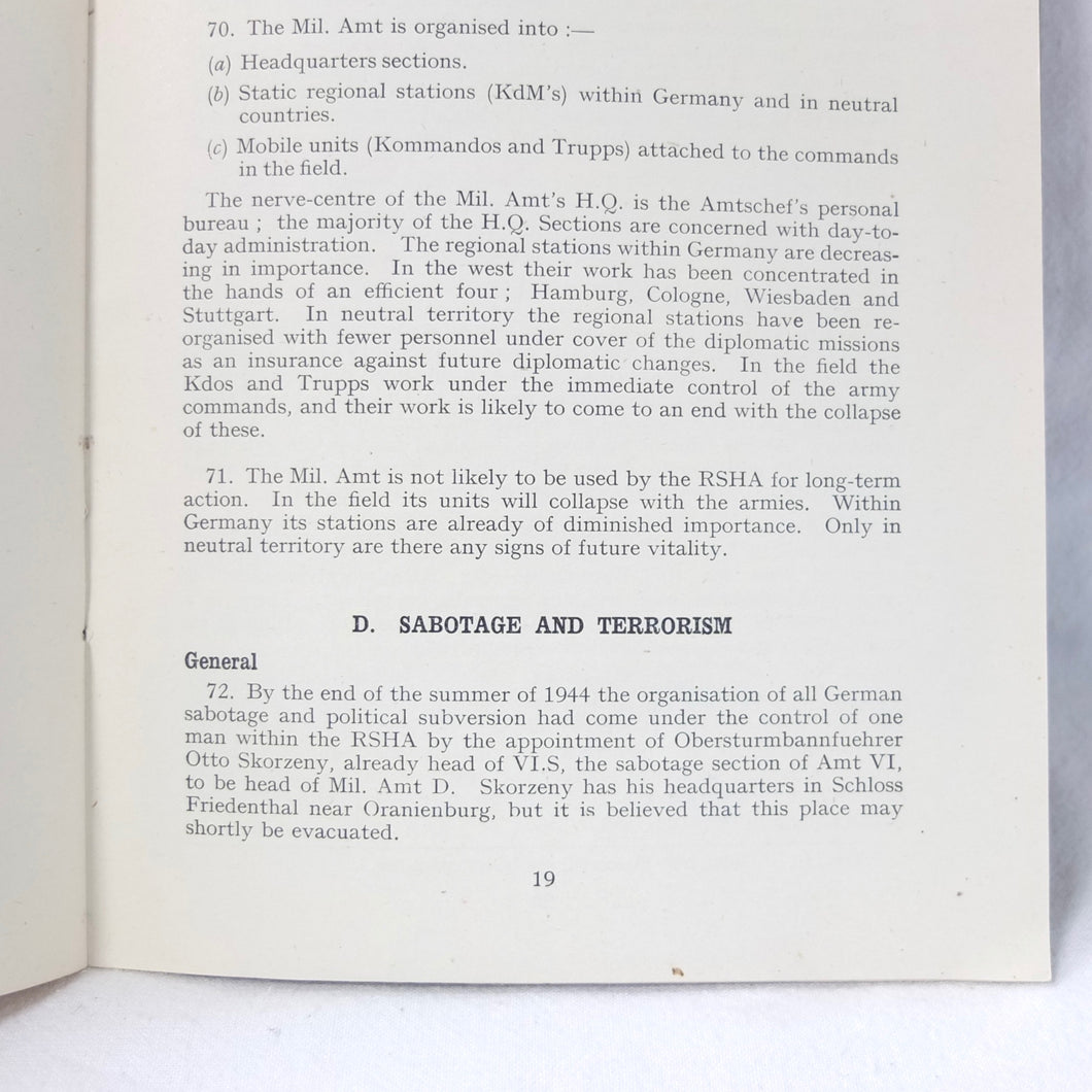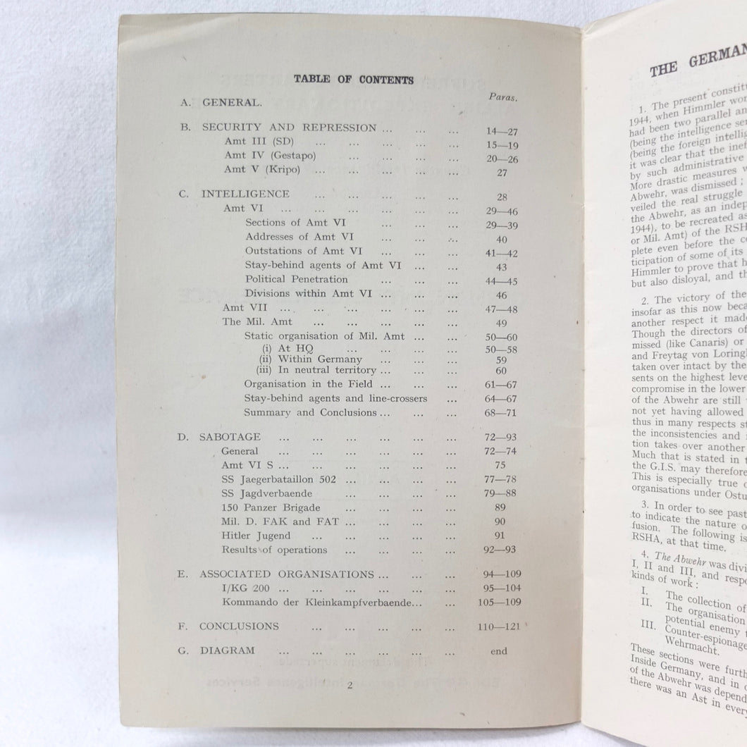 The German Intelligence Service provides an overview of the Third Reich's intelligence services. It would have been based on the work of M.I. 14, the British wartime department that specialised in intelligence about Germany. Also known as 'Section 14', M.I. 14 was a department of the British Directorate of Military Intelligence. M.I. 14 was closely associated with M.I.R.S. (Military Intelligence Research Section) which was a joint Anglo-American agency with offices in Washington DC and London, founded in 1943 under the supervision of M.I. 14 and G-2 (Counter Intelligence).
