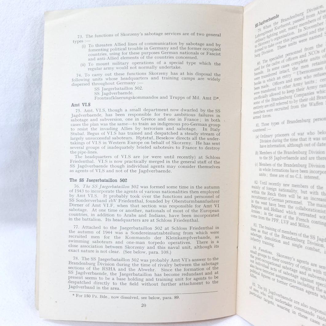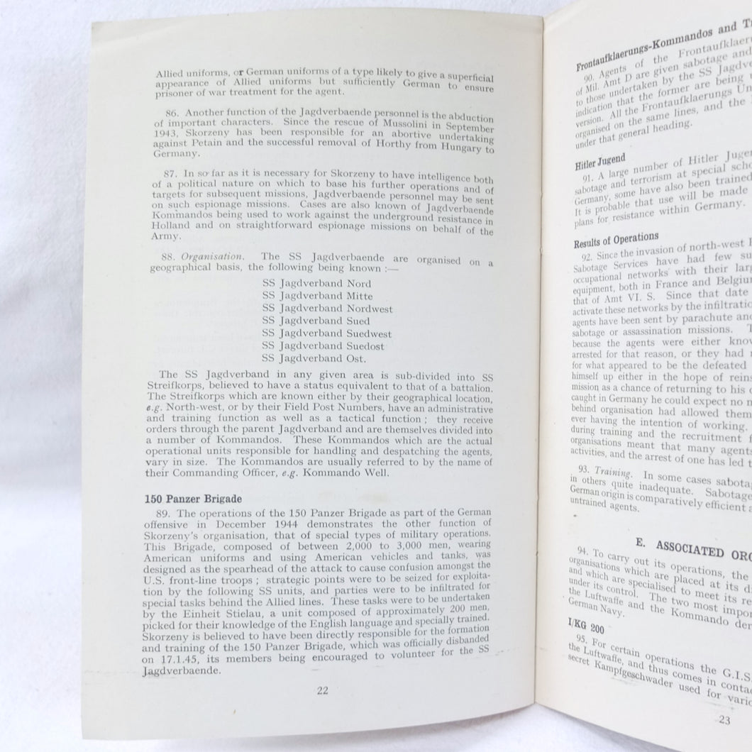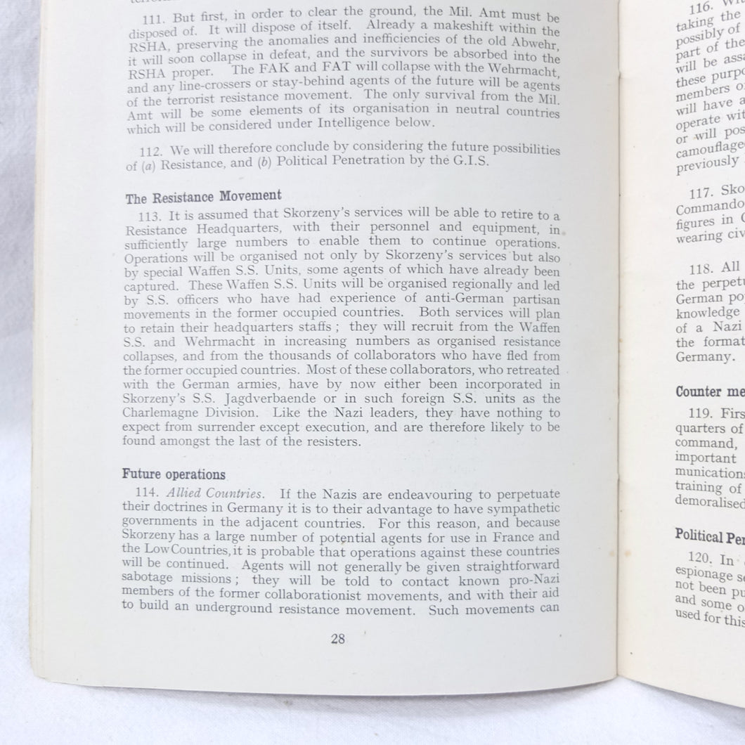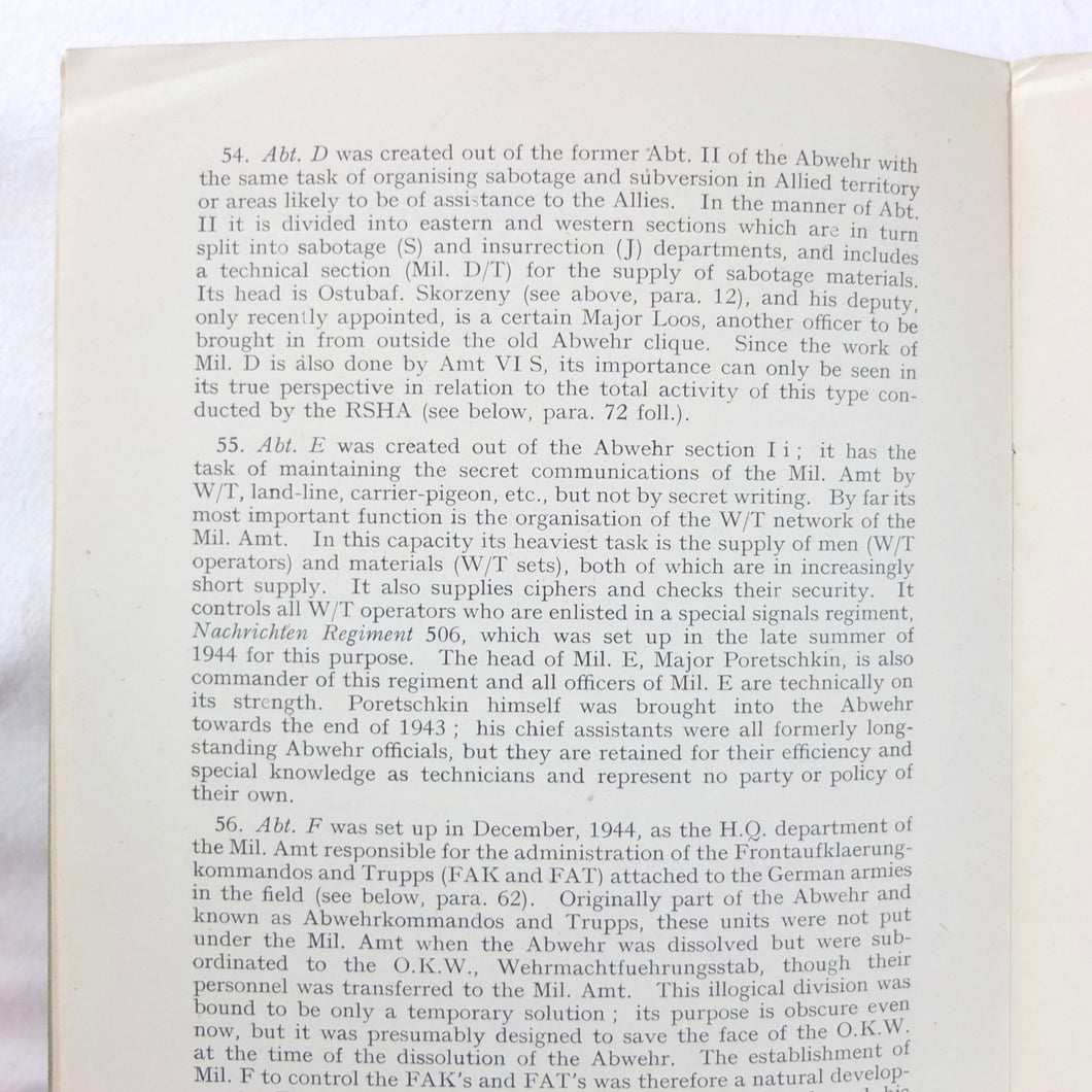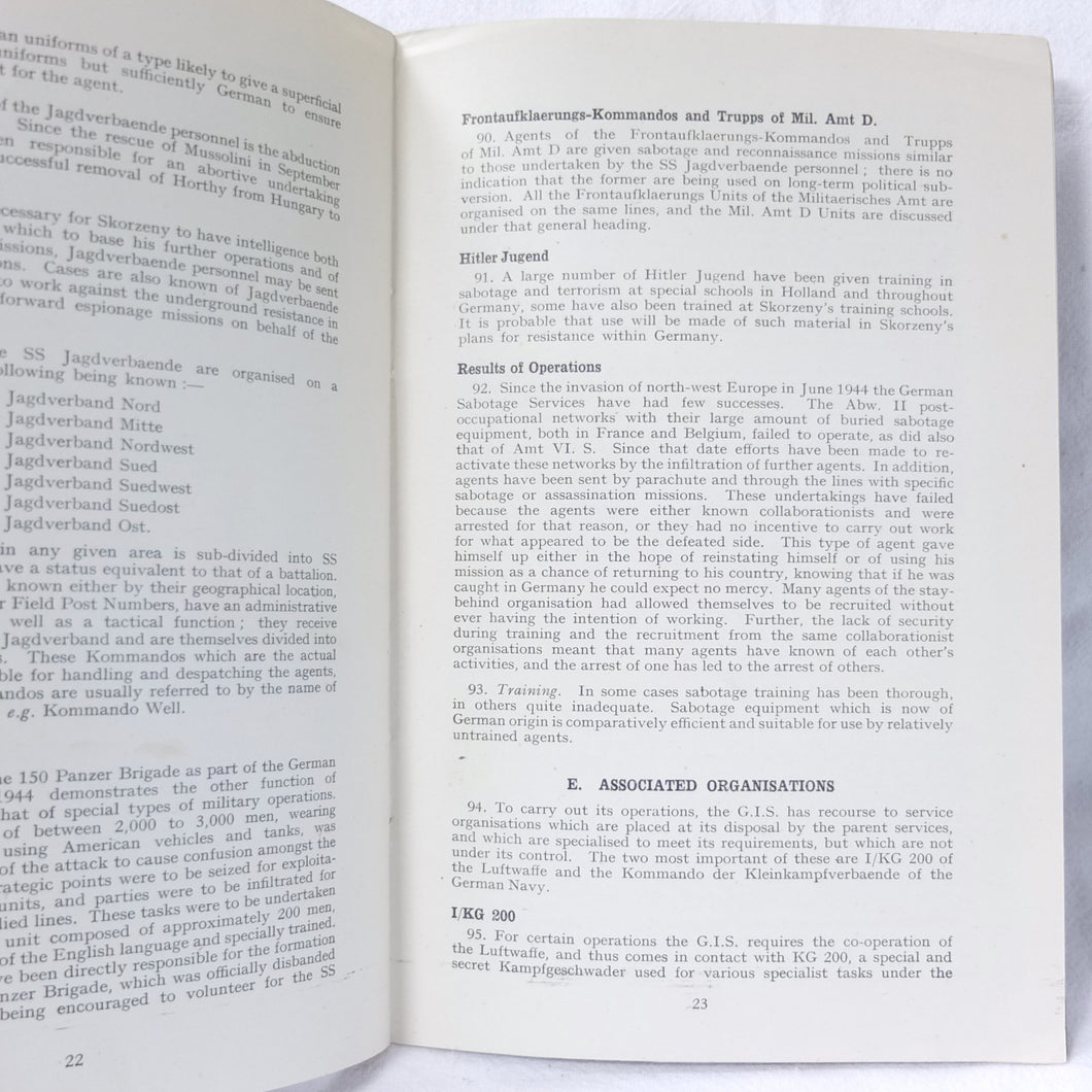 The German Intelligence Service provides an overview of the Third Reich's intelligence services. It would have been based on the work of M.I. 14, the British wartime department that specialised in intelligence about Germany. Also known as 'Section 14', M.I. 14 was a department of the British Directorate of Military Intelligence. M.I. 14 was closely associated with M.I.R.S. (Military Intelligence Research Section) which was a joint Anglo-American agency with offices in Washington DC and London, founded in 1943 under the supervision of M.I. 14 and G-2 (Counter Intelligence).