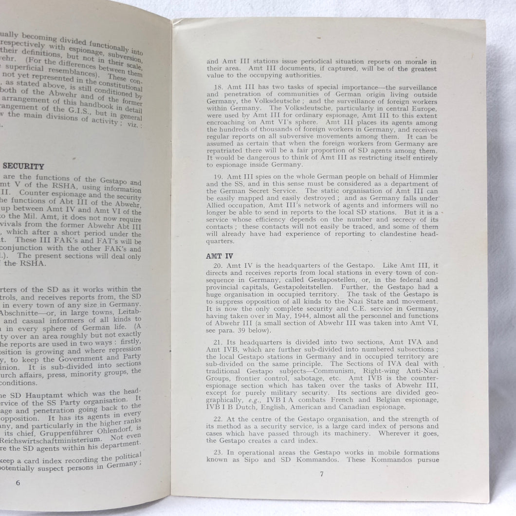 A very rare, original, WW2 Supreme Allied Forces HQ Counter-Intelligence Handbook, marked ‘Secret’, and produced by S.H.A.E.F. in April 1945. It was a document with a very restricted circulation, with only 1,000 copies printed, intended to be used by Allied intelligence officers serving in North Western Europe, in particular by those entering Germany during the final months of the war, in preparation for the impending defeat of Nazi Germany. It would have been a vital source of information on the German Intelligence Service.