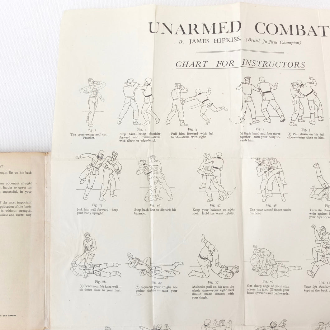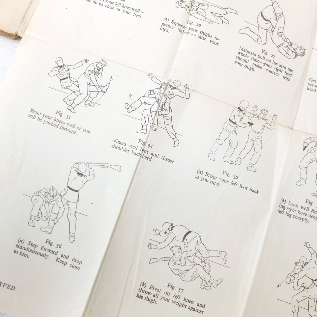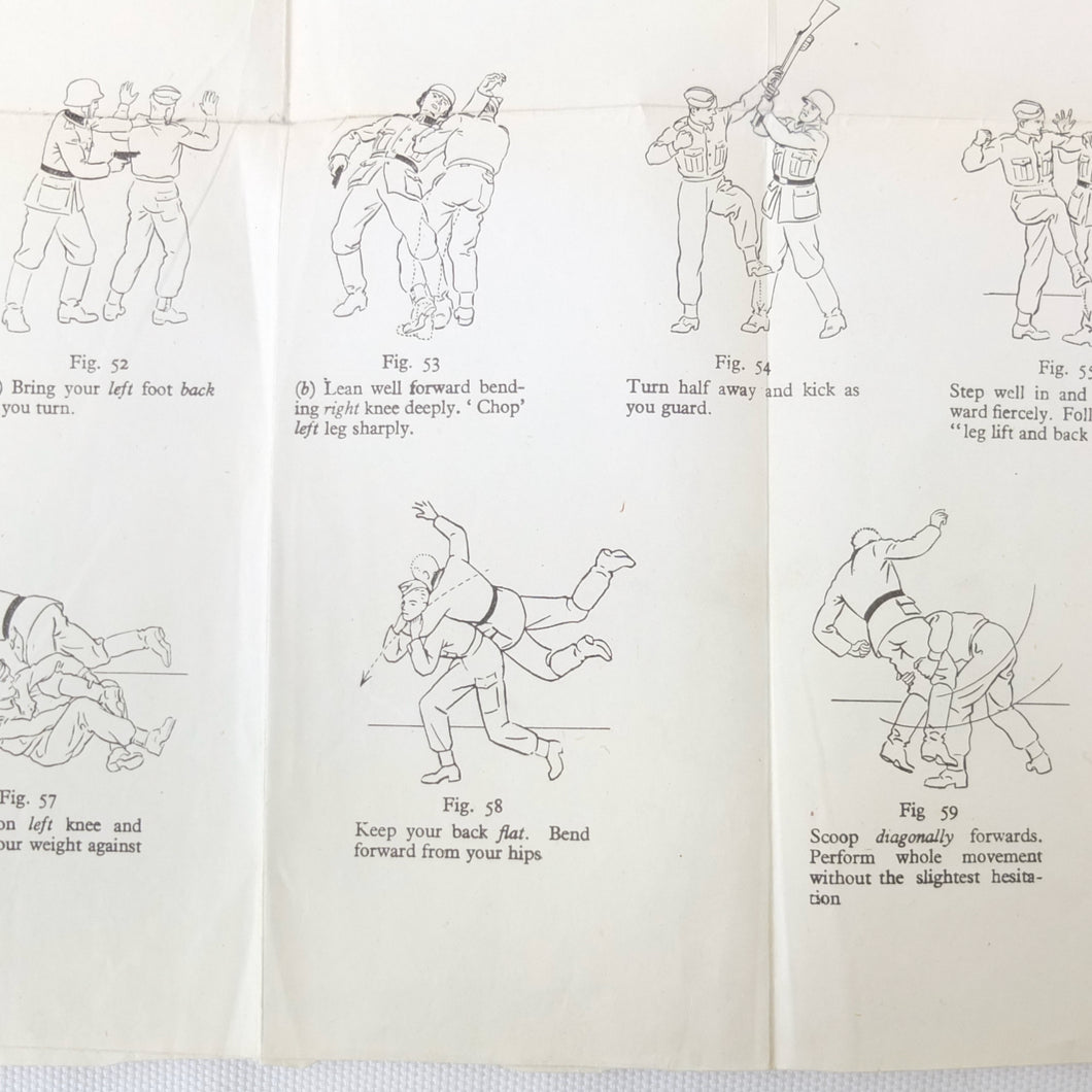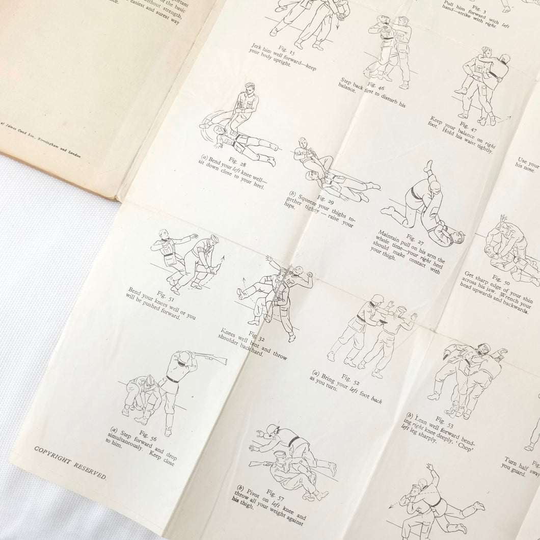A rare original WW2 Unarmed Combat manual, published by F. W. Bridges Ltd of London in 1941. Written by the British Ju-Jitsu champion, the book includes details of a wide variety of blows, holds, kicks, throws, strikes, and other self defence techniques. With instructions on how to deal with assailants armed with sticks, rifles, and pistols. The book is well illustrated with drawings of a British serviceman using the techniques against a jackbooted Nazi soldier. There is a large fold-out chart at the rear of the book showing a wide variety of techniques that could be used. The book was intended to be used by the regular army, the Home Guard, and civilians in the event of a German invasion.