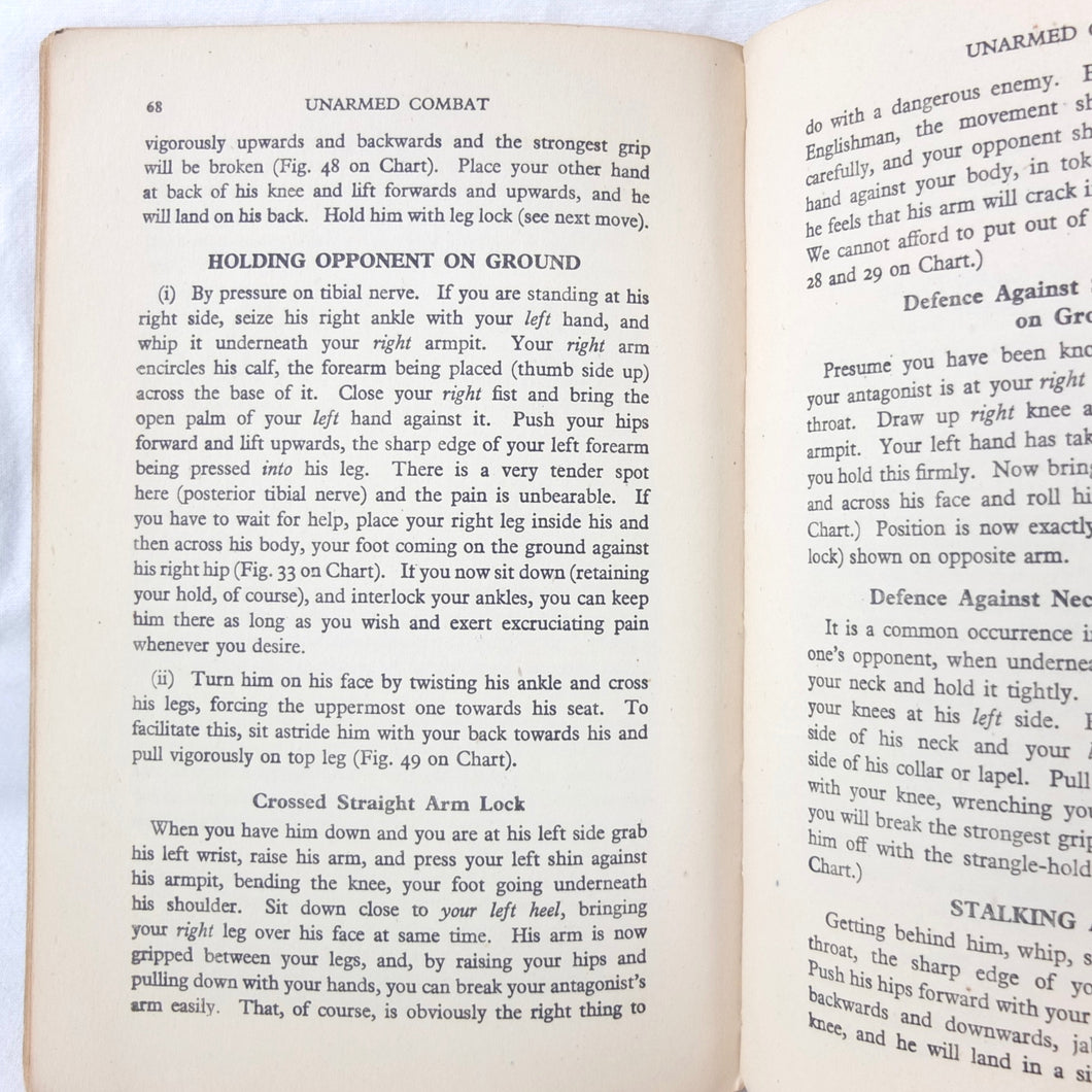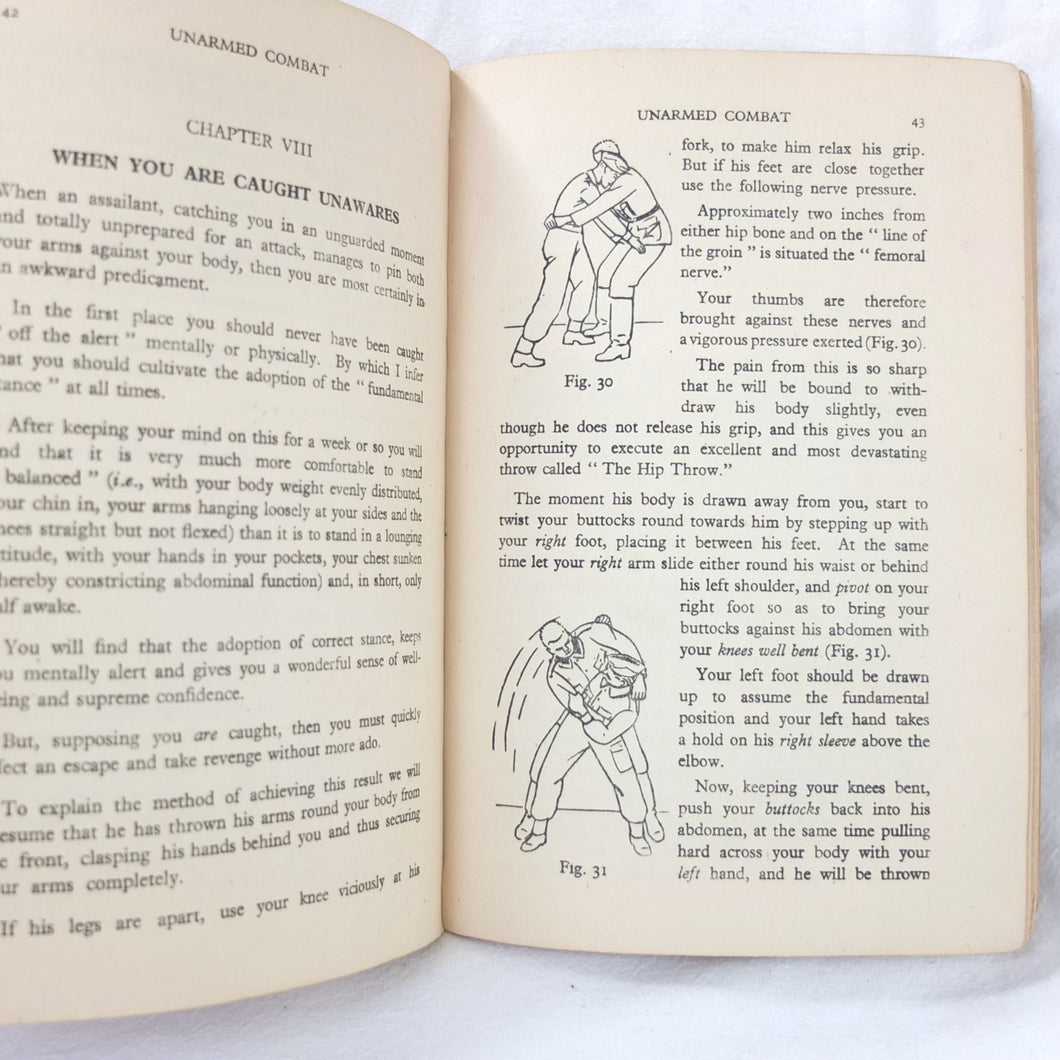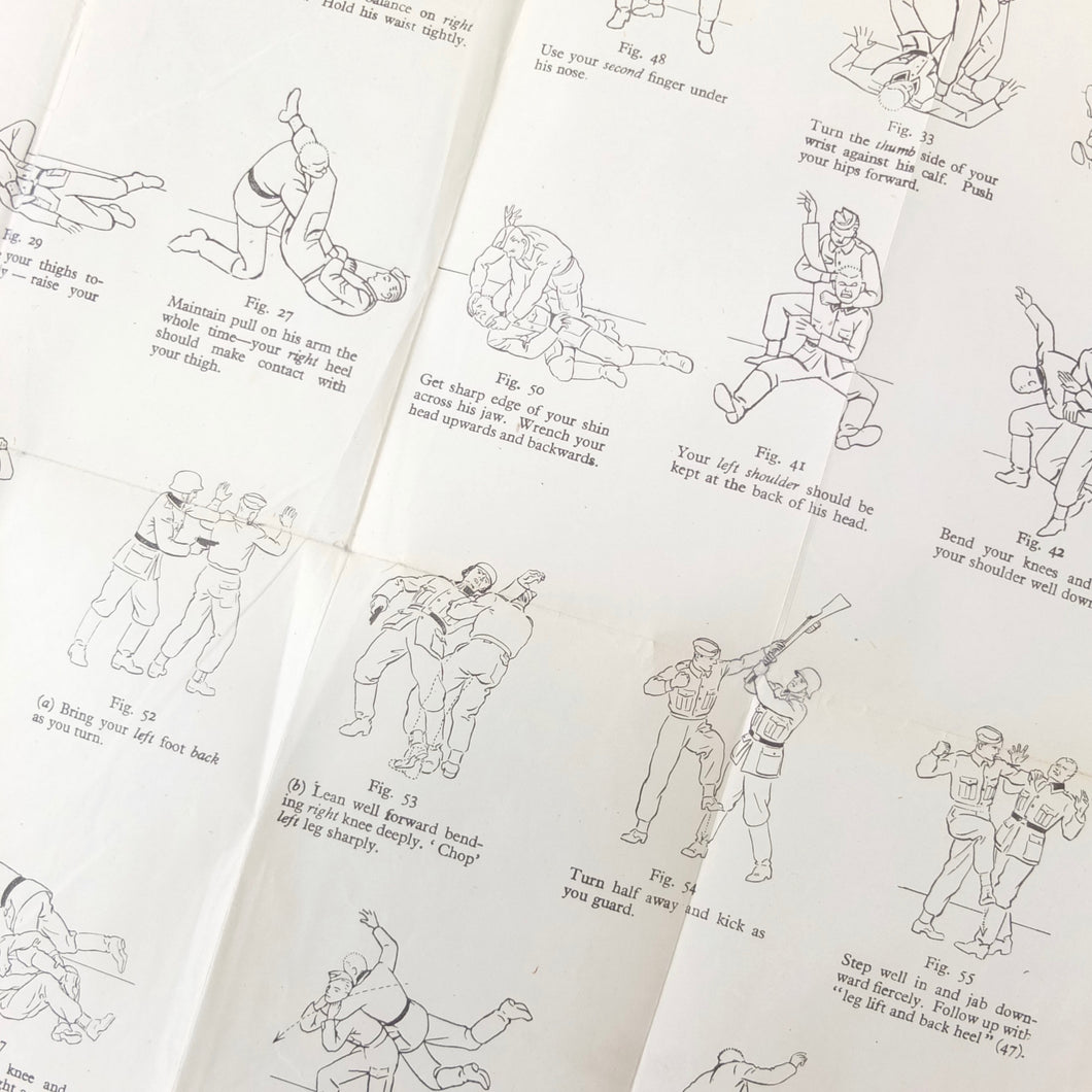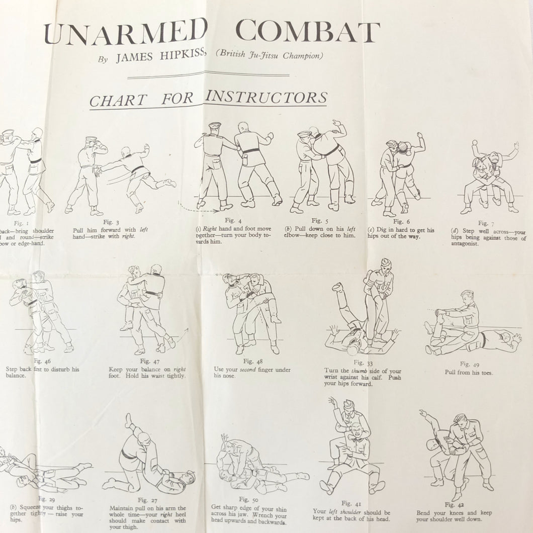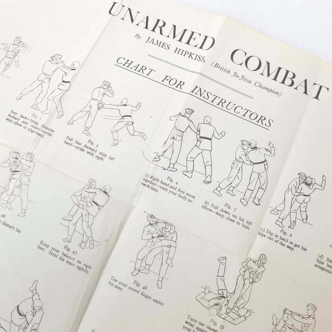 A rare original WW2 Unarmed Combat manual, published by F. W. Bridges Ltd of London in 1941. Written by the British Ju-Jitsu champion, the book includes details of a wide variety of blows, holds, kicks, throws, strikes, and other self defence techniques. With instructions on how to deal with assailants armed with sticks, rifles, and pistols. The book is well illustrated with drawings of a British serviceman using the techniques against a jackbooted Nazi soldier. There is a large fold-out chart at the rear of the book showing a wide variety of techniques that could be used. The book was intended to be used by the regular army, the Home Guard, and civilians in the event of a German invasion.