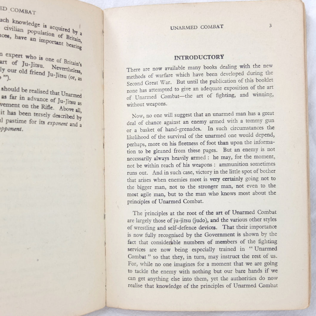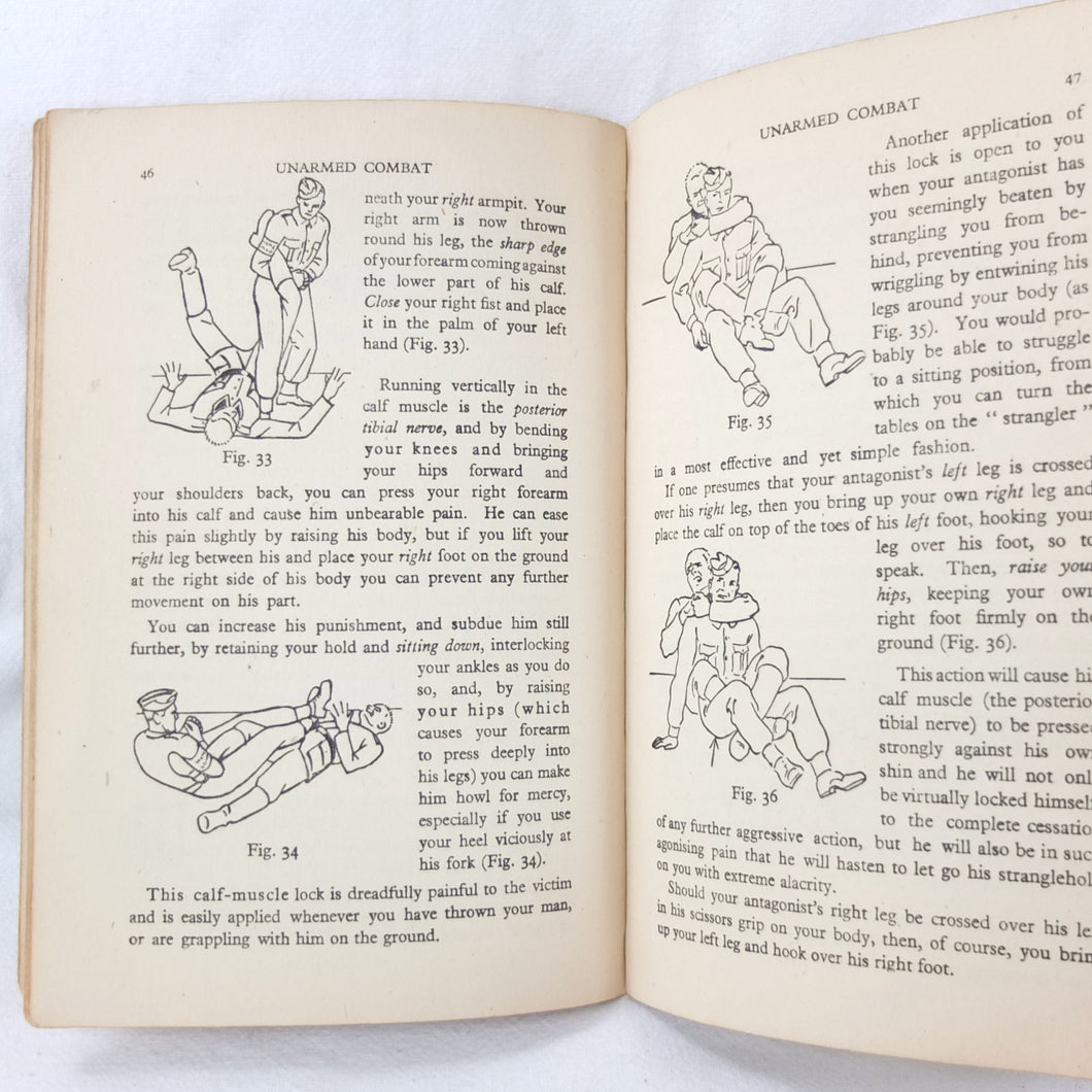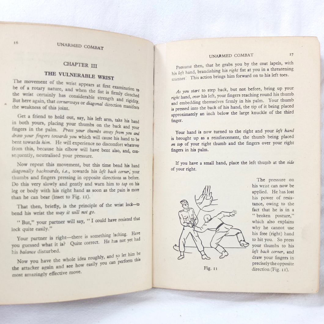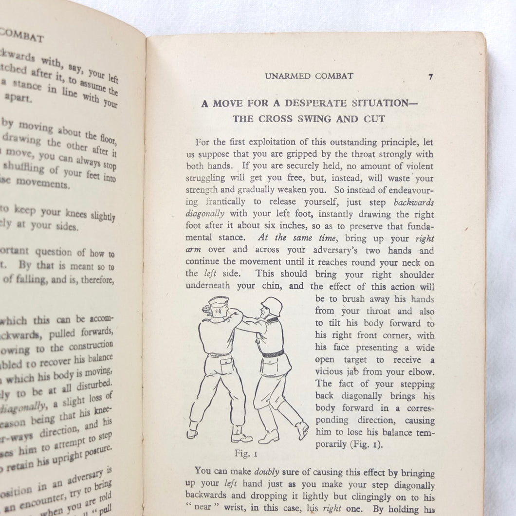 A rare original WW2 Unarmed Combat manual, published by F. W. Bridges Ltd of London in 1941. Written by the British Ju-Jitsu champion, the book includes details of a wide variety of blows, holds, kicks, throws, strikes, and other self defence techniques. With instructions on how to deal with assailants armed with sticks, rifles, and pistols. The book is well illustrated with drawings of a British serviceman using the techniques against a jackbooted Nazi soldier. There is a large fold-out chart at the rear of the book showing a wide variety of techniques that could be used. The book was intended to be used by the regular army, the Home Guard, and civilians in the event of a German invasion.