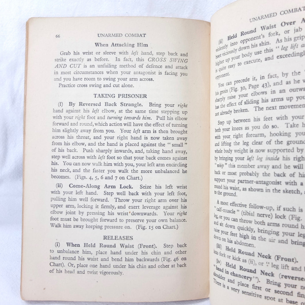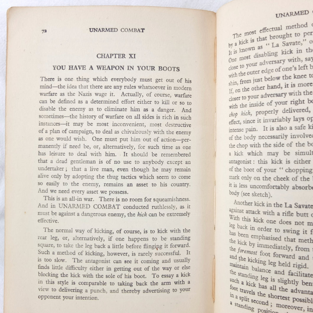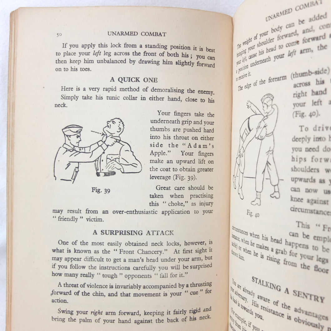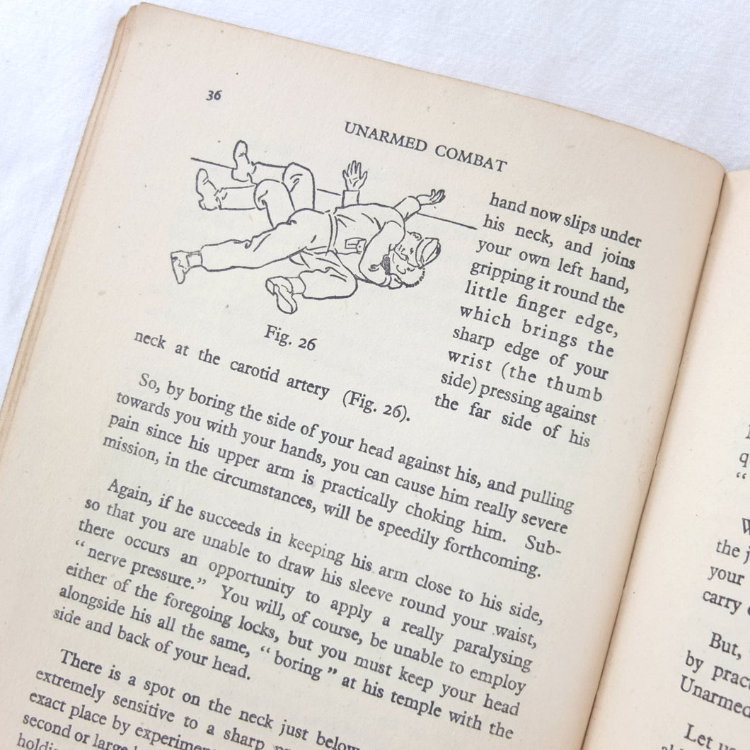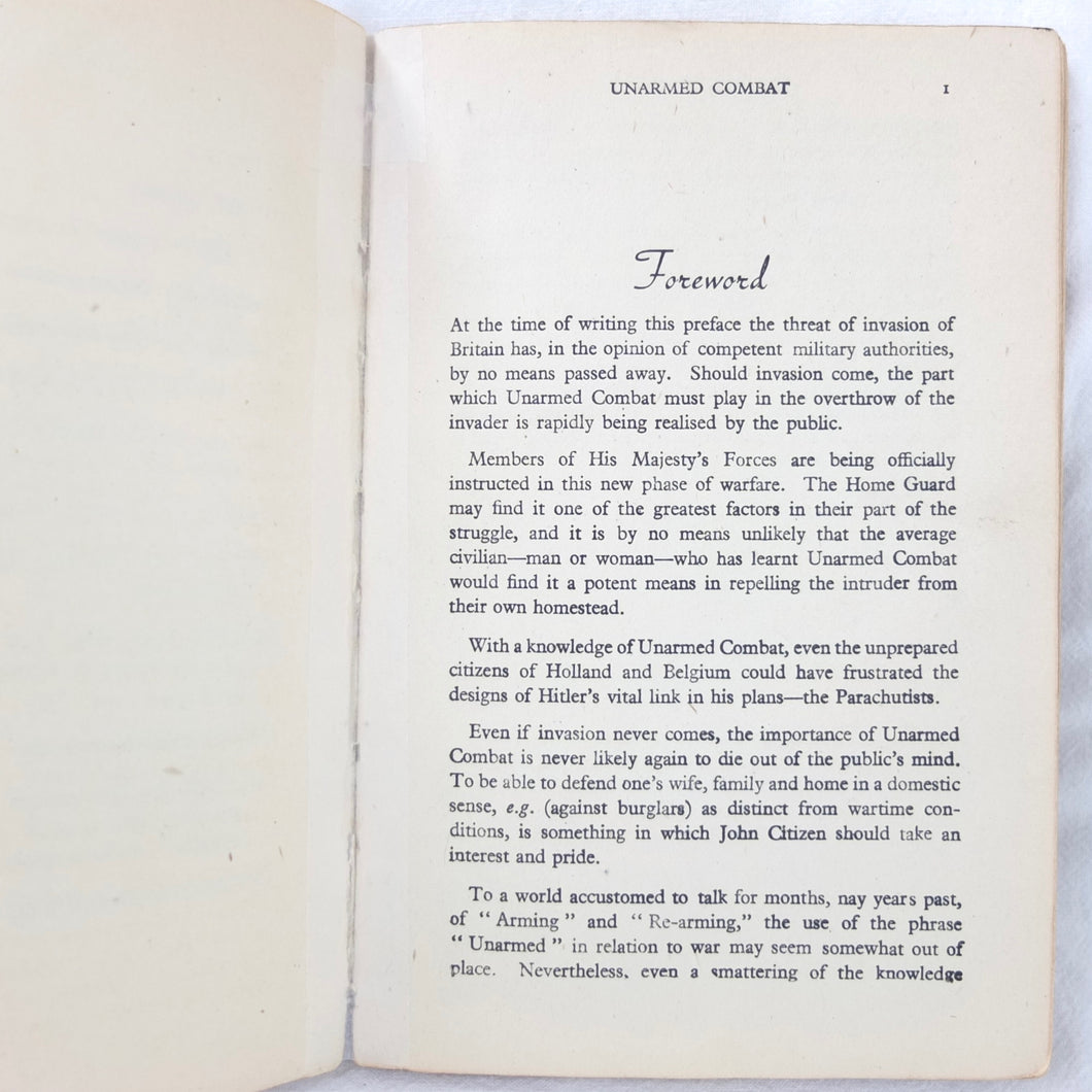 A rare original WW2 Unarmed Combat manual, published by F. W. Bridges Ltd of London in 1941. Written by the British Ju-Jitsu champion, the book includes details of a wide variety of blows, holds, kicks, throws, strikes, and other self defence techniques. With instructions on how to deal with assailants armed with sticks, rifles, and pistols. The book is well illustrated with drawings of a British serviceman using the techniques against a jackbooted Nazi soldier. There is a large fold-out chart at the rear of the book showing a wide variety of techniques that could be used. The book was intended to be used by the regular army, the Home Guard, and civilians in the event of a German invasion.