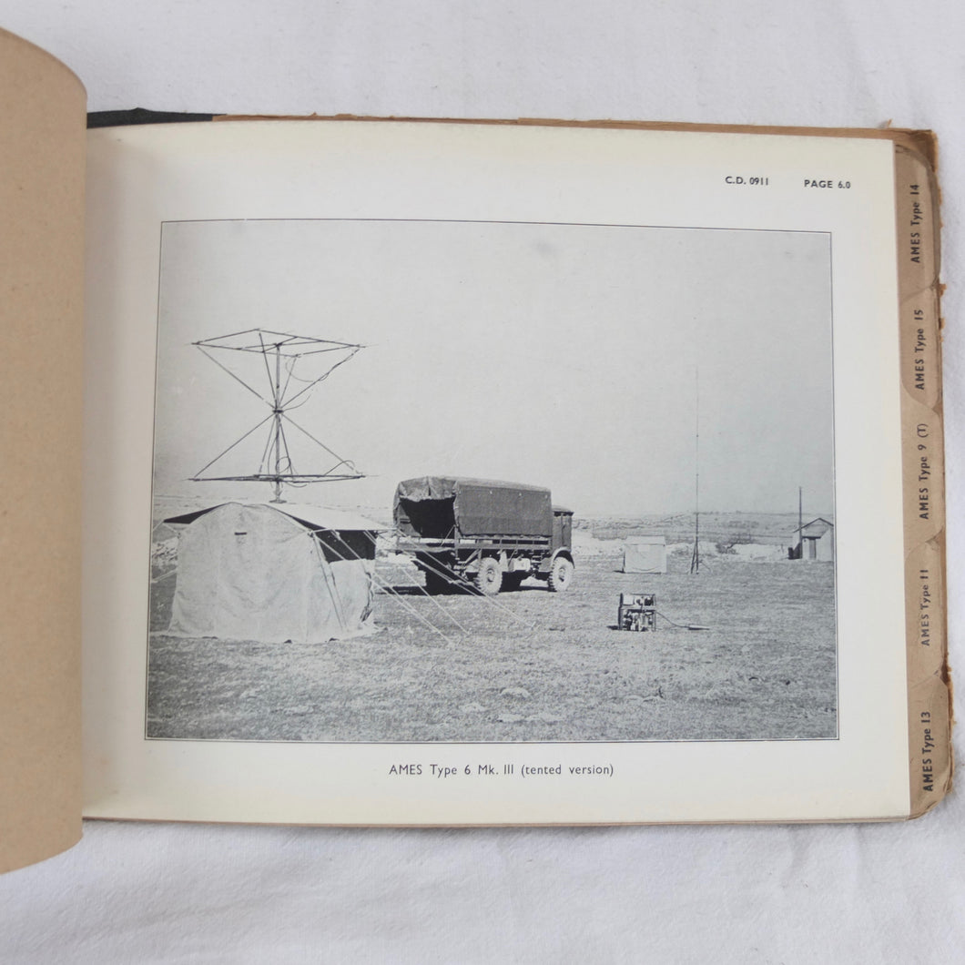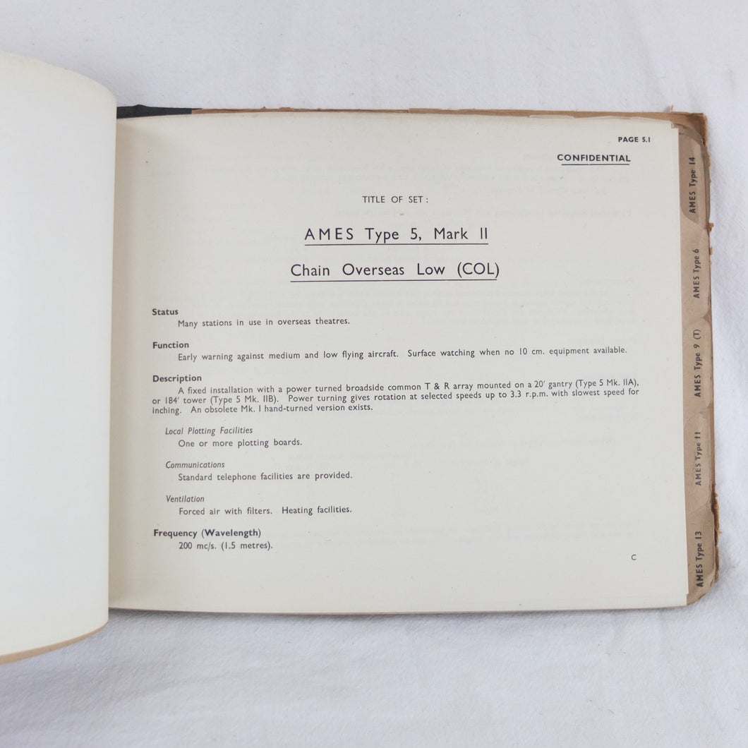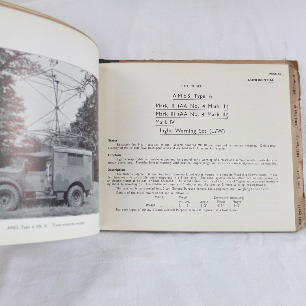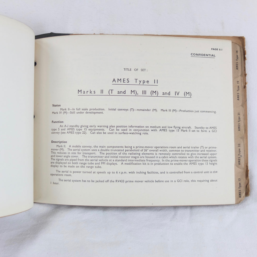 An extremely rare confidential WW2 Air Ministry Radar manual, published in October 1944. The book is a detailed and very well illustrated summary of information about the various types of A.M.E.S. (Air Ministry Experimental Stations) land based and mobile radar equipment in use by British armed forces in 1944. AMES was originally the name given to the Air Ministry's development team at Bawdsey Manor immediately before the outbreak of WW2. The AMES acronym became the basis for naming RAF radar systems throughout the war. This manual includes details of the many AMES Types, from 5 MK II to 57, as well as Anti-Aircraft and Coastal Artillery Radar equipment. It was clearly an important and top secret document at the time, and is marked 'Restricted', and 'Confidential', with additional warnings relating to the Official Secrets Act on the front cover. Illustrated throughout with numerous photographs, this book would be an invaluable resource and reference work for anyone interested in British radar operations and equipment during WW2.