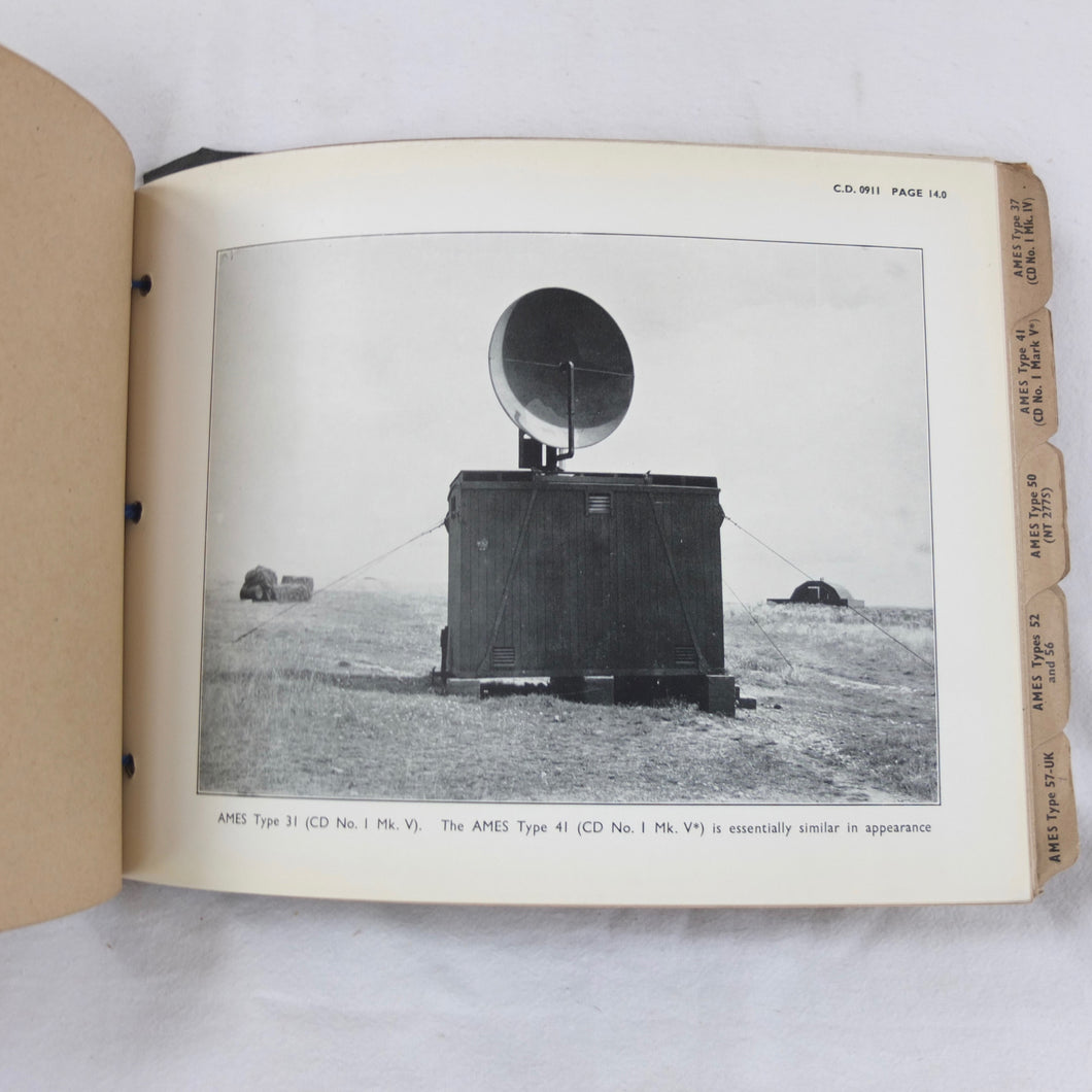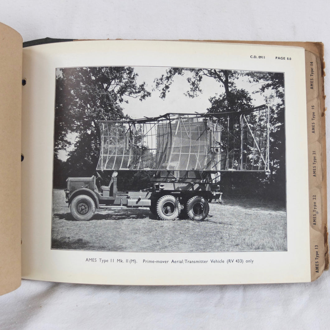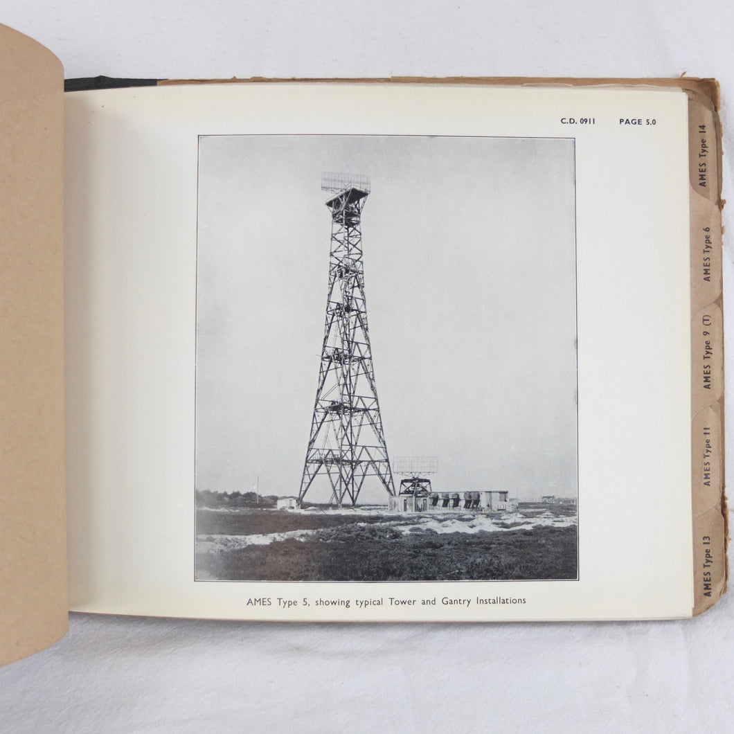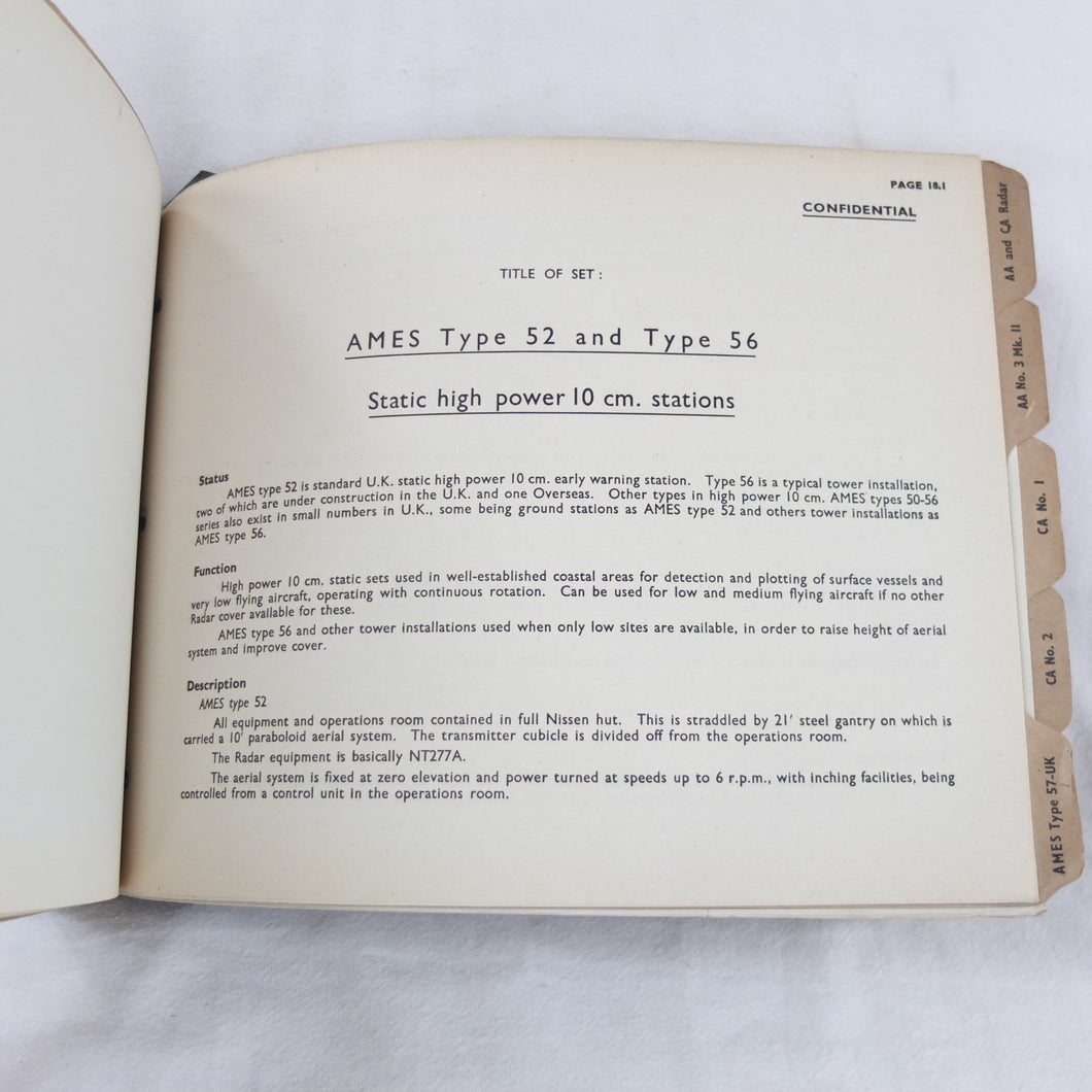 An extremely rare confidential WW2 Air Ministry Radar manual, published in October 1944. The book is a detailed and very well illustrated summary of information about the various types of A.M.E.S. (Air Ministry Experimental Stations) land based and mobile radar equipment in use by British armed forces in 1944. AMES was originally the name given to the Air Ministry's development team at Bawdsey Manor immediately before the outbreak of WW2. The AMES acronym became the basis for naming RAF radar systems throughout the war. This manual includes details of the many AMES Types, from 5 MK II to 57, as well as Anti-Aircraft and Coastal Artillery Radar equipment. It was clearly an important and top secret document at the time, and is marked 'Restricted', and 'Confidential', with additional warnings relating to the Official Secrets Act on the front cover. Illustrated throughout with numerous photographs, this book would be an invaluable resource and reference work for anyone interested in British radar operations and equipment during WW2.