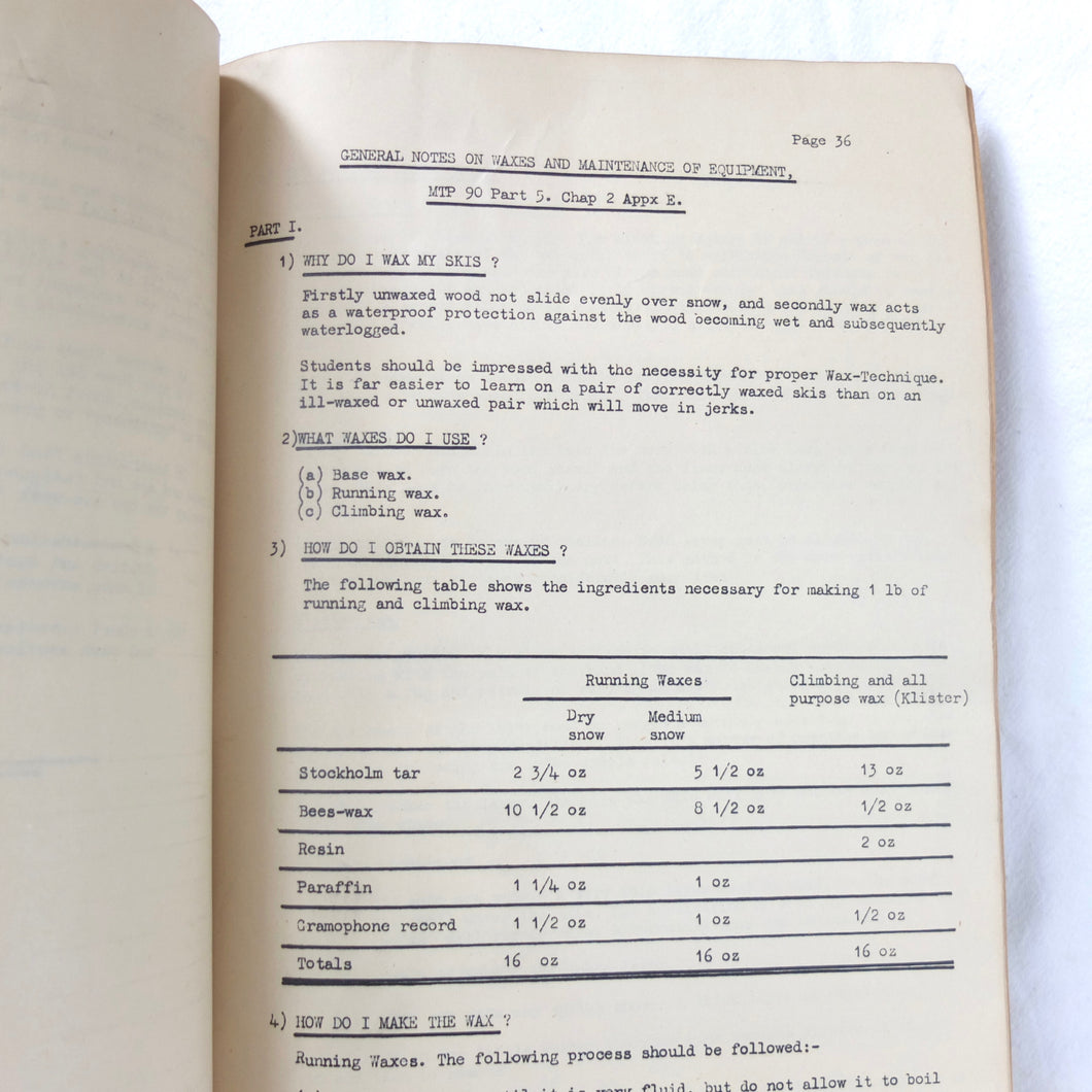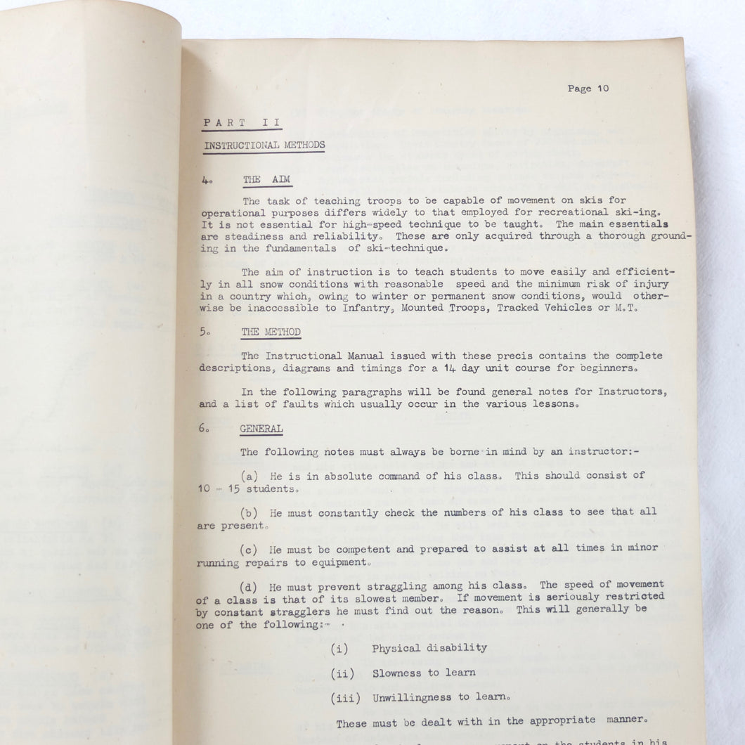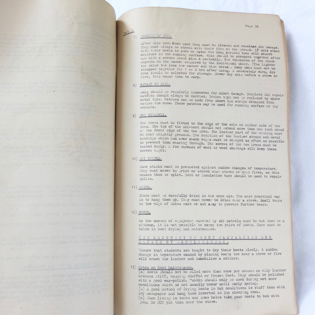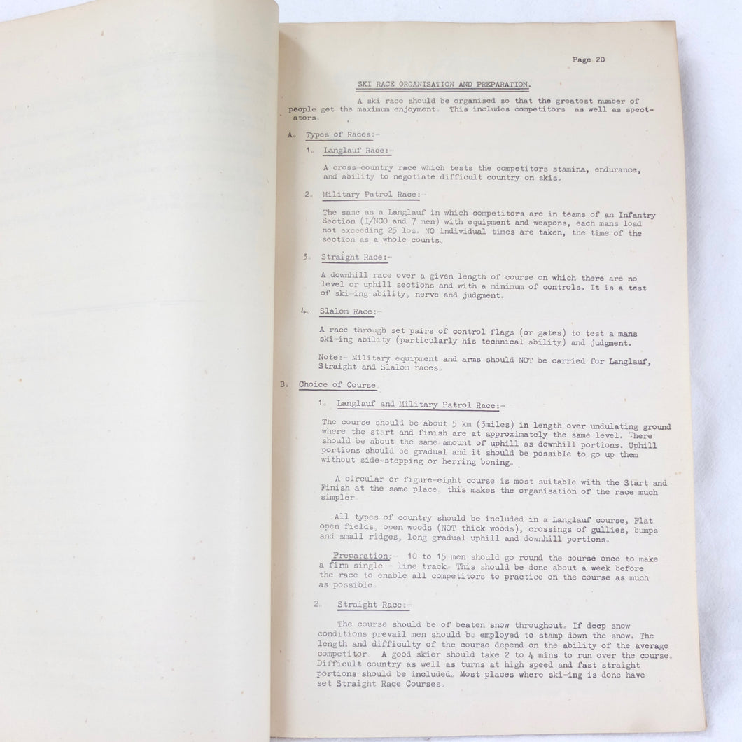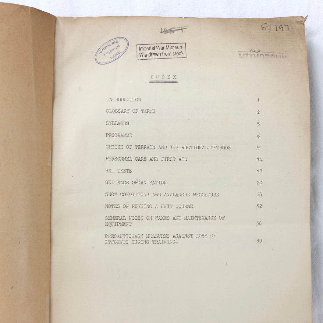 The manual Includes advice and information on skiing terms, the course syllabus, terrain, instructional methods, personnel care, first aid, ski tests, ski race organisation, snow conditions, avalanches, course management, ski waxes, maintenance of equipment, and safety precautions. For anyone interested in British Army winter warfare training and ski instruction just after WW2, this book would be an invaluable reference work.