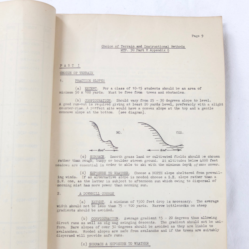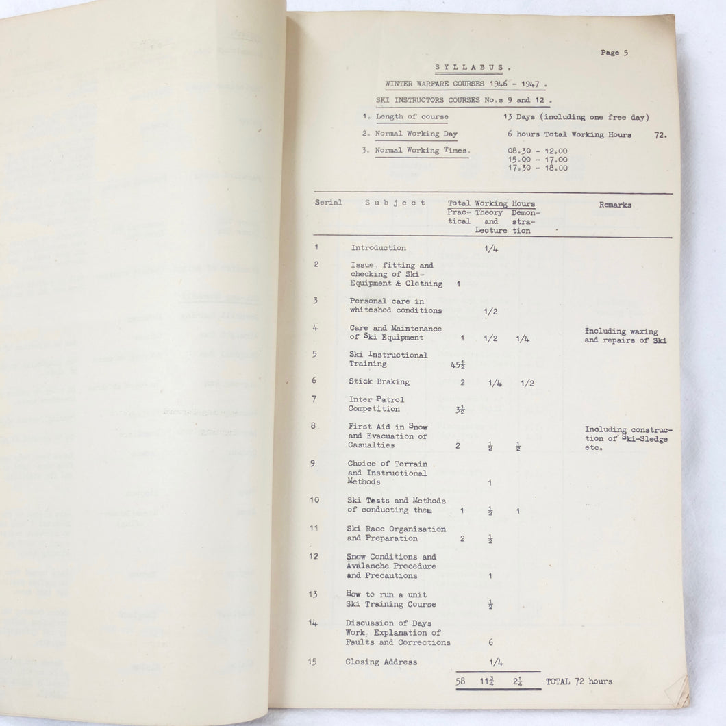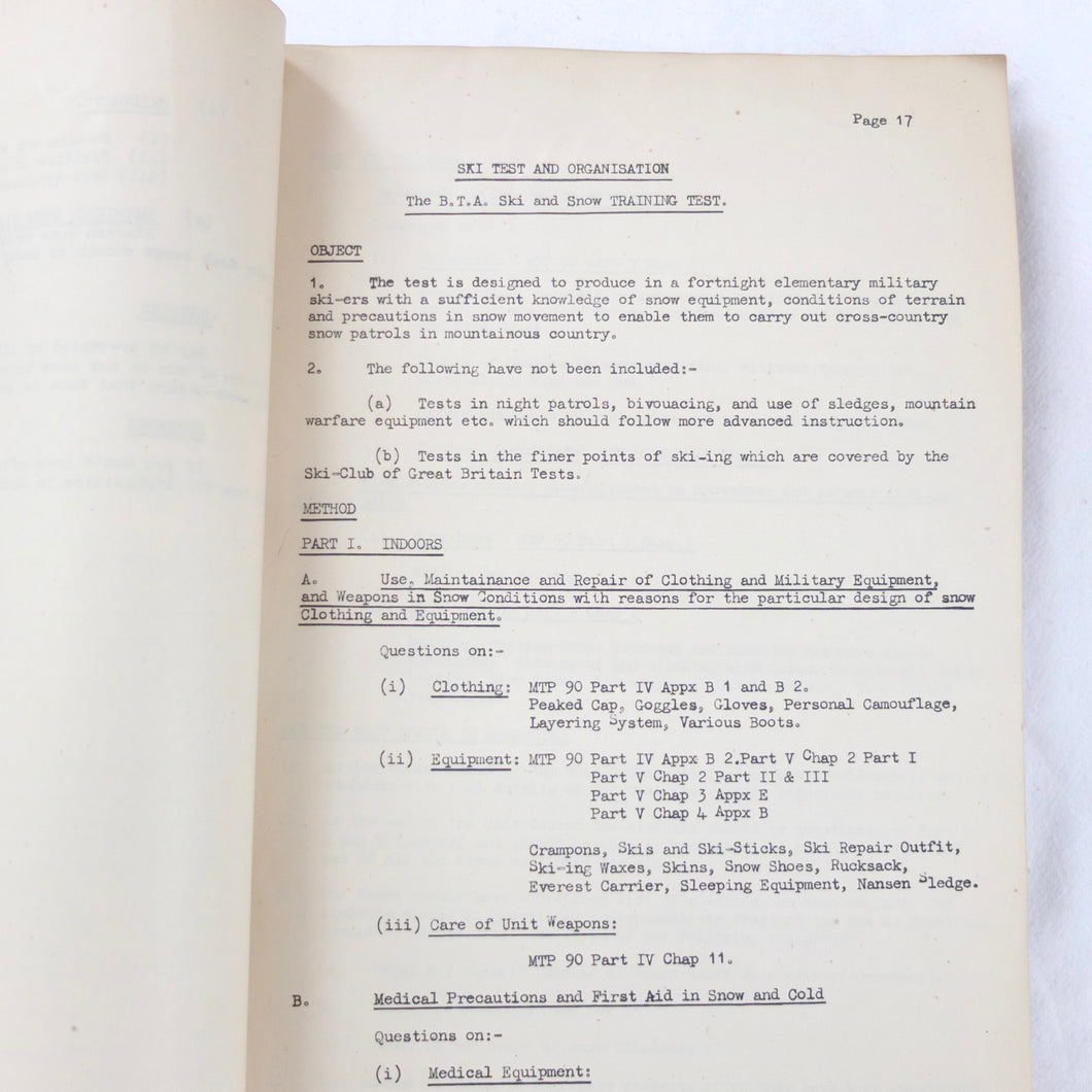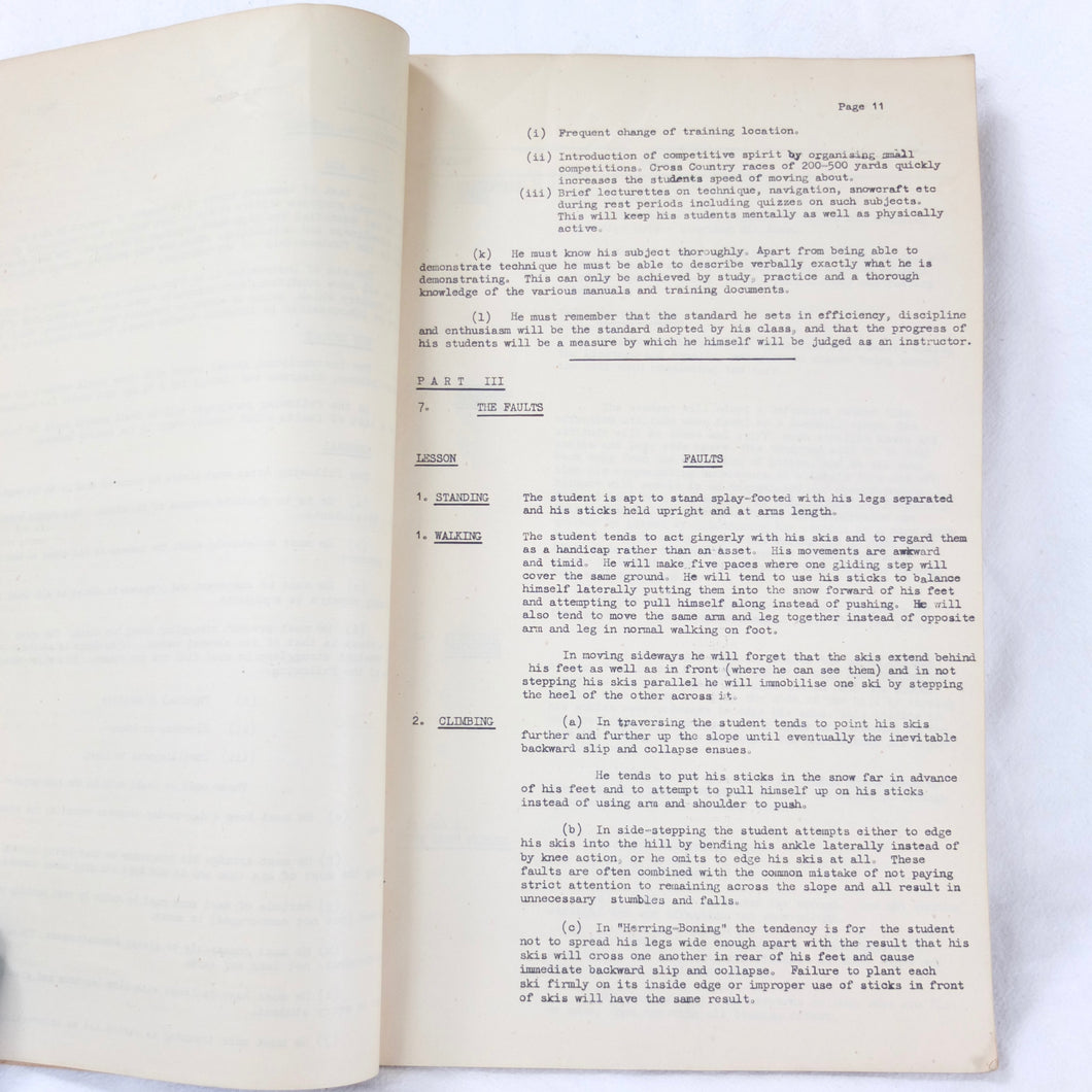 The manual Includes advice and information on skiing terms, the course syllabus, terrain, instructional methods, personnel care, first aid, ski tests, ski race organisation, snow conditions, avalanches, course management, ski waxes, maintenance of equipment, and safety precautions. For anyone interested in British Army winter warfare training and ski instruction just after WW2, this book would be an invaluable reference work.