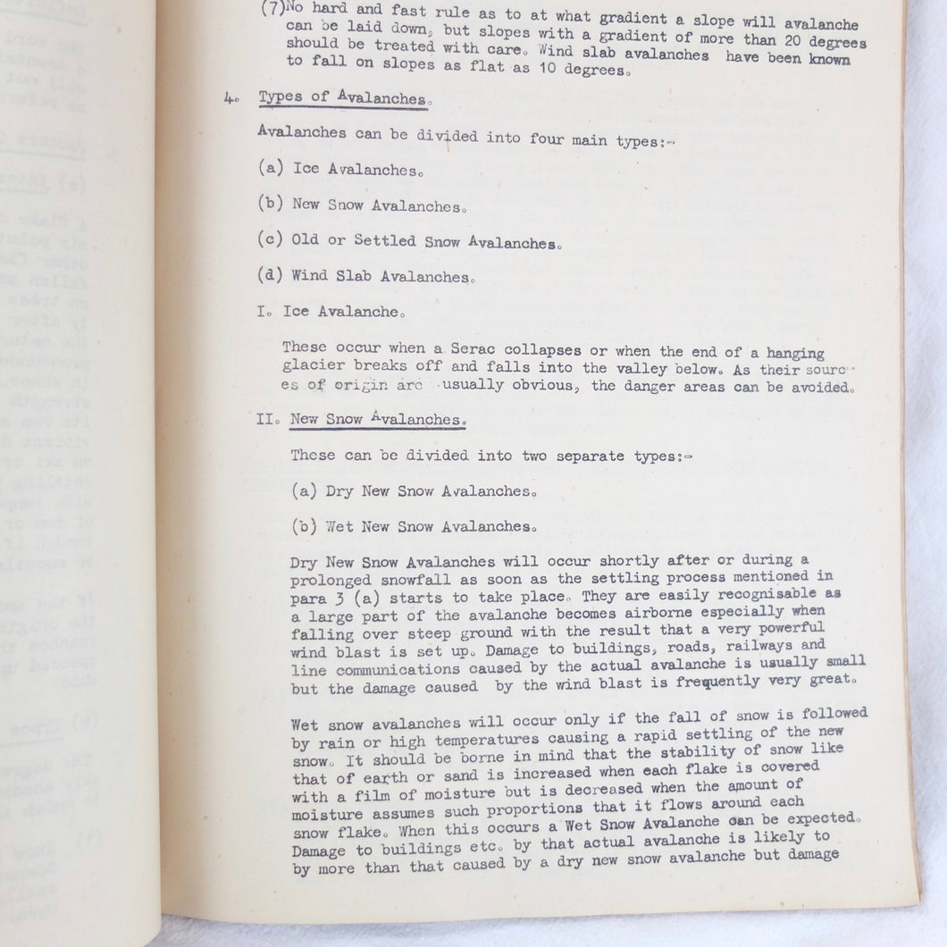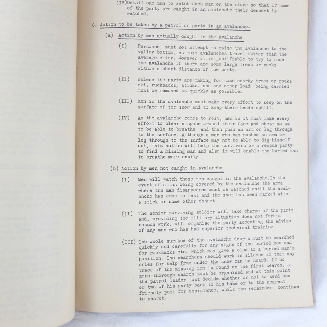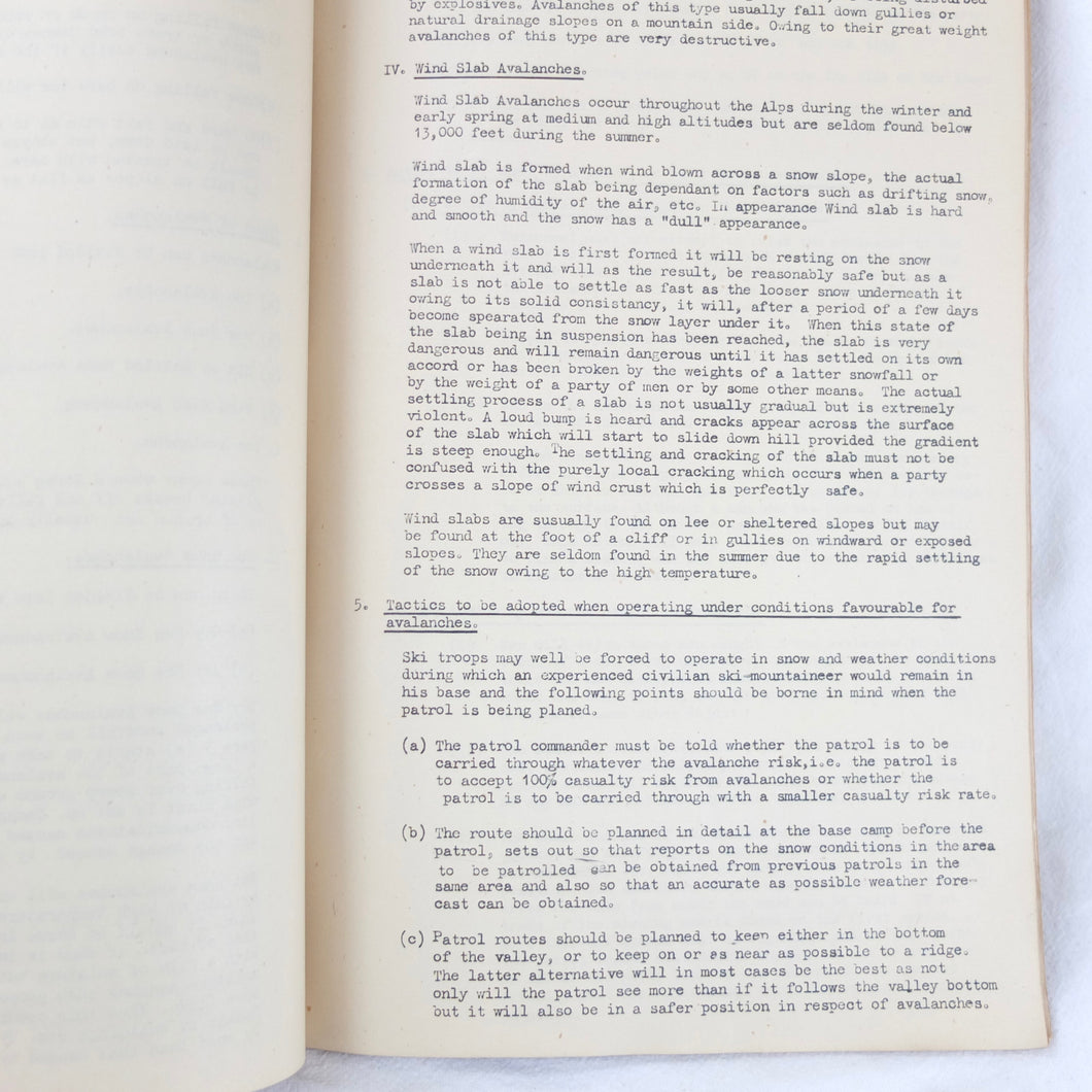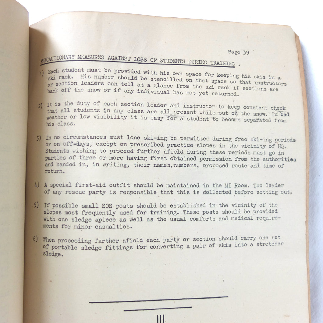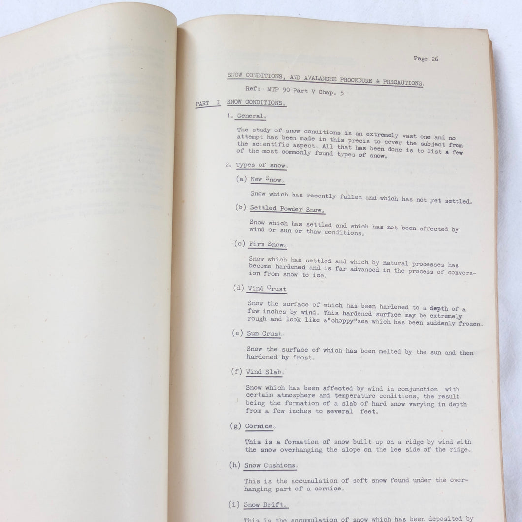The manual Includes advice and information on skiing terms, the course syllabus, terrain, instructional methods, personnel care, first aid, ski tests, ski race organisation, snow conditions, avalanches, course management, ski waxes, maintenance of equipment, and safety precautions. For anyone interested in British Army winter warfare training and ski instruction just after WW2, this book would be an invaluable reference work.