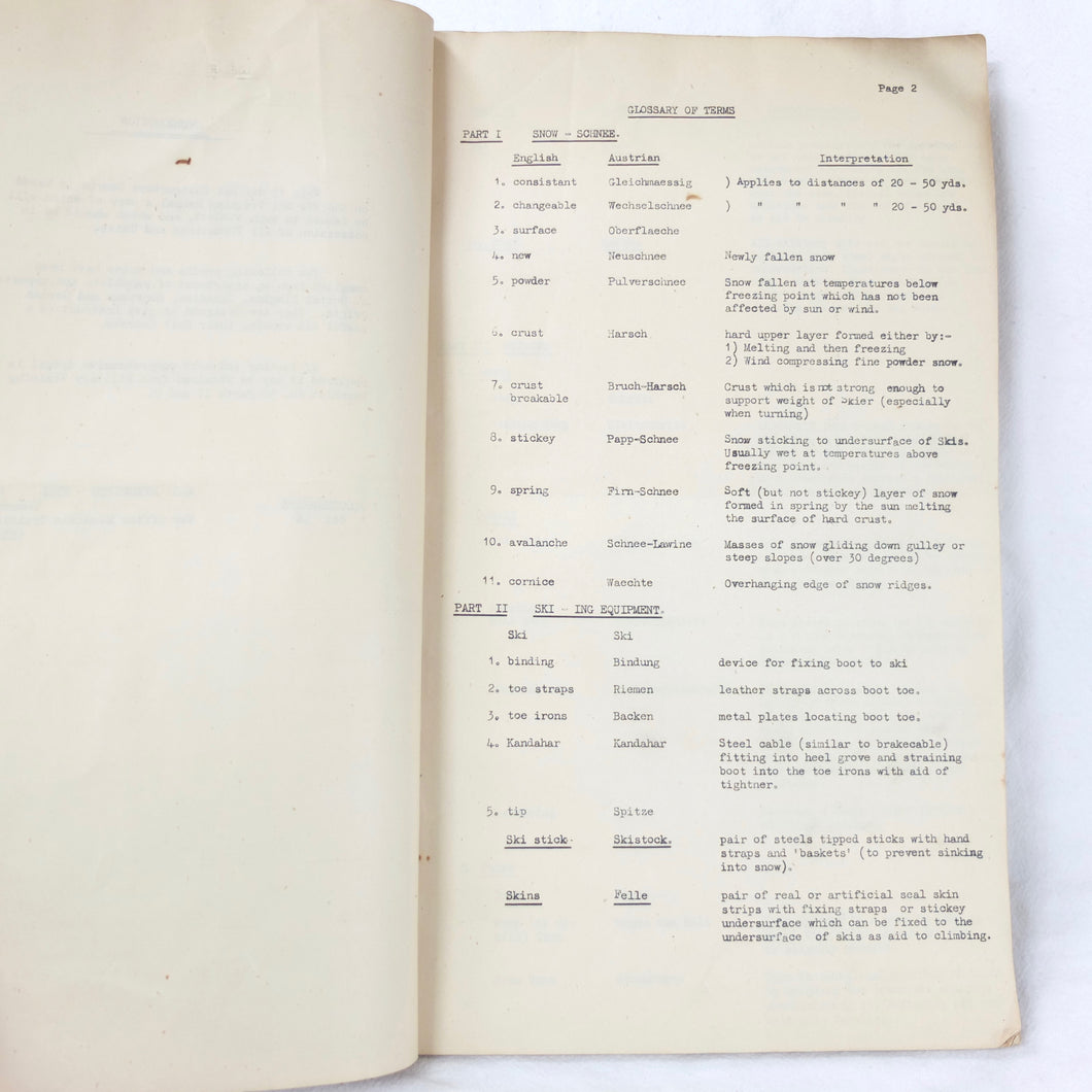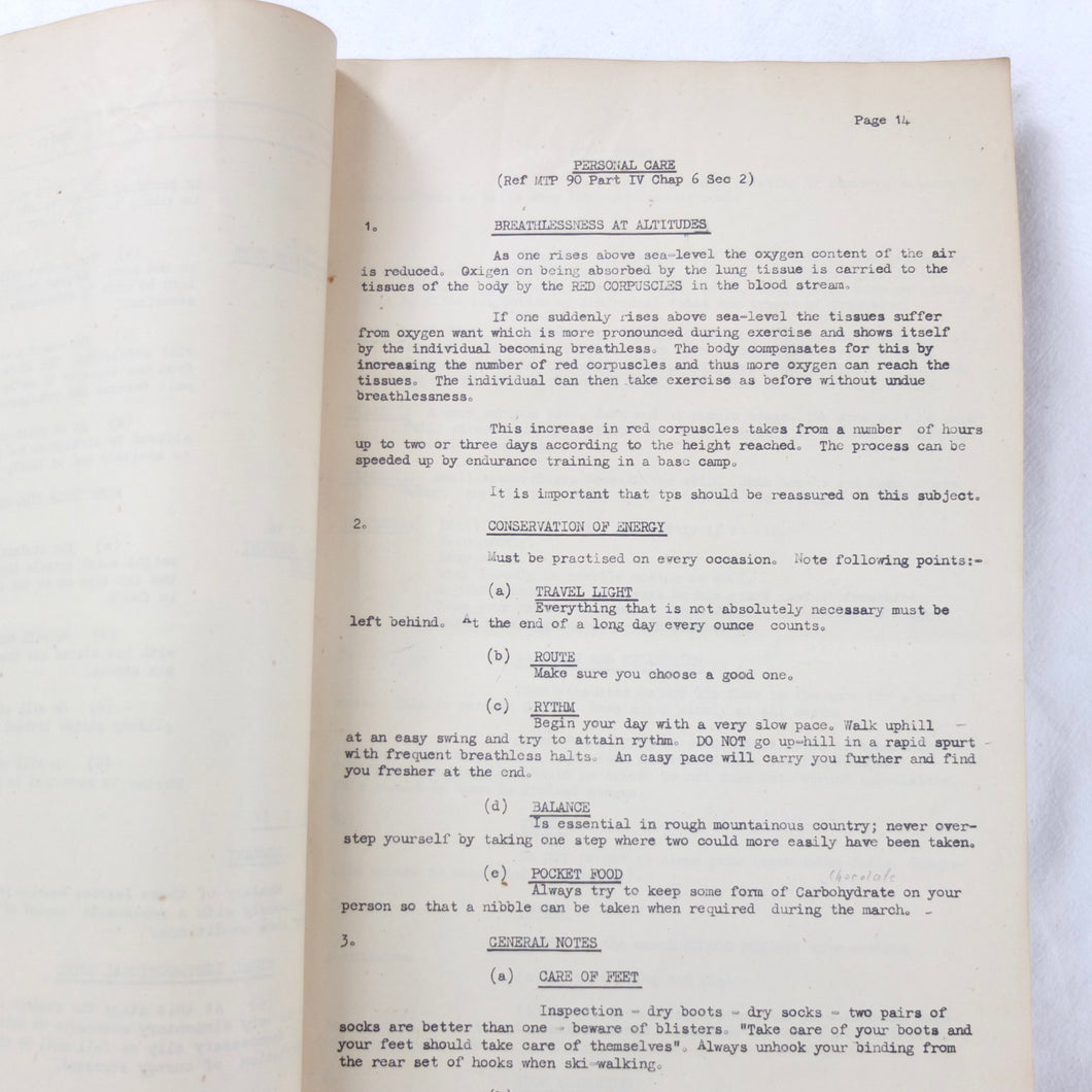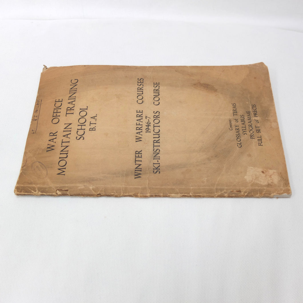 A very rare, original British Army Mountain Warfare Training manual, produced for the War Office Mountain Training School course at Glocknerhaus in Austria in October 1946. This manual was intended solely for the use of British officers attending the Ski Instructors Winter Warfare courses at Glocknerhaus just after the end of WW2 and would have been produced in very limited numbers. The commandant of the Mountain Training School at the time was Major A. G. Ryshworth-Hill M.C., a regular army officer who served with the South Lancashire Regiment during WW2 and went on to have a long career in the army, becoming Colonel of the regiment in the 1960s.