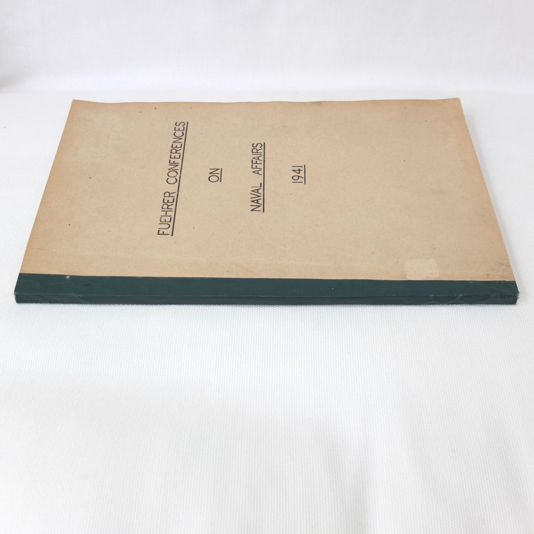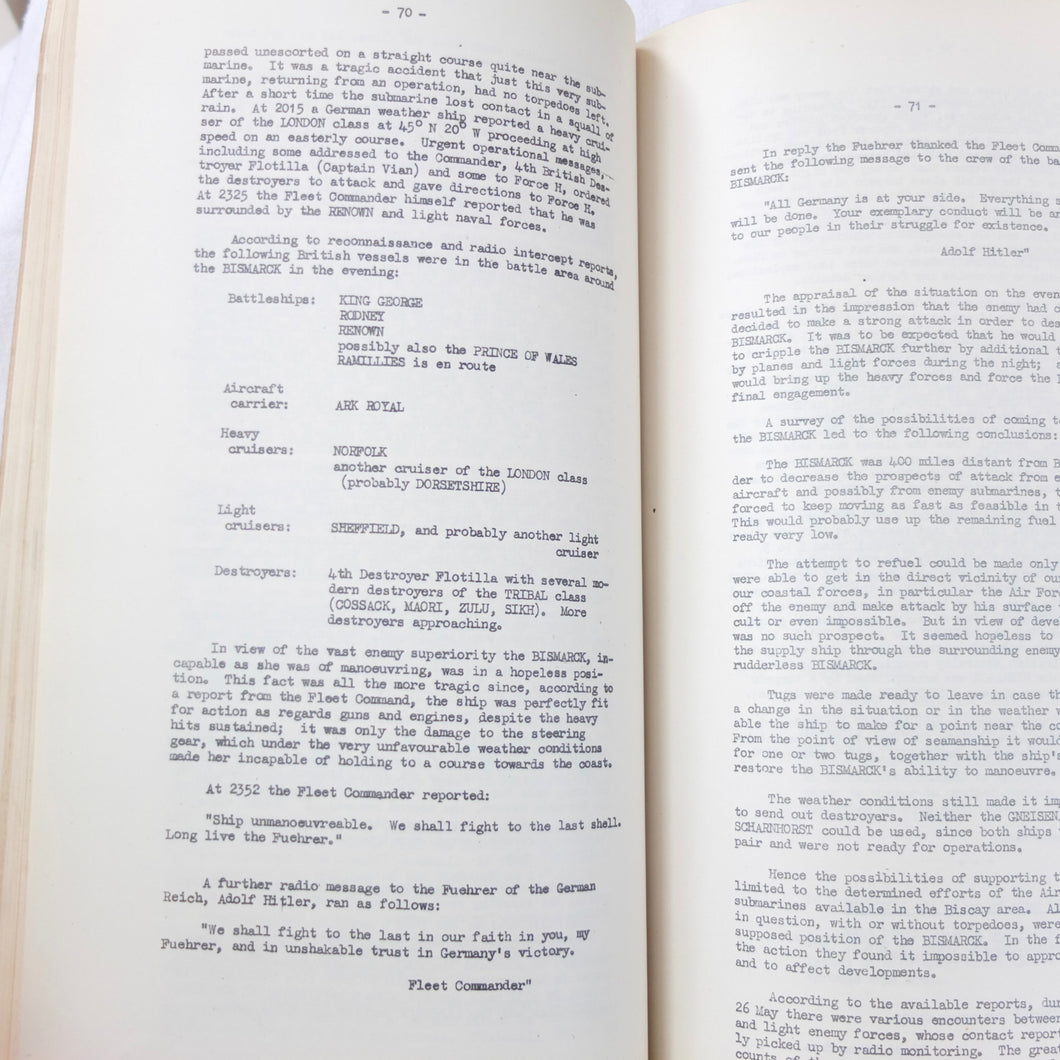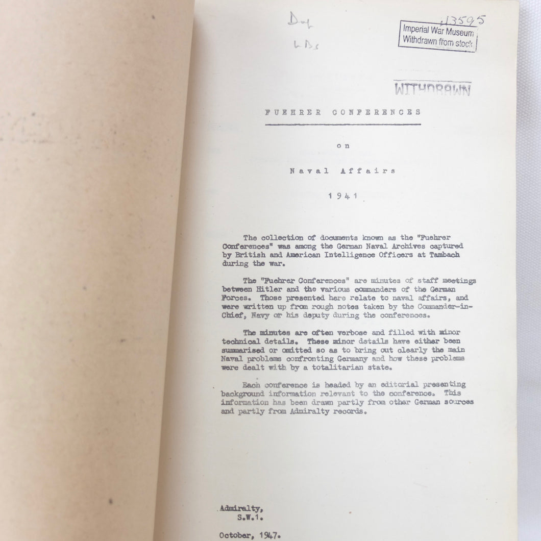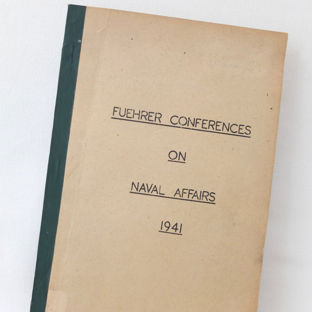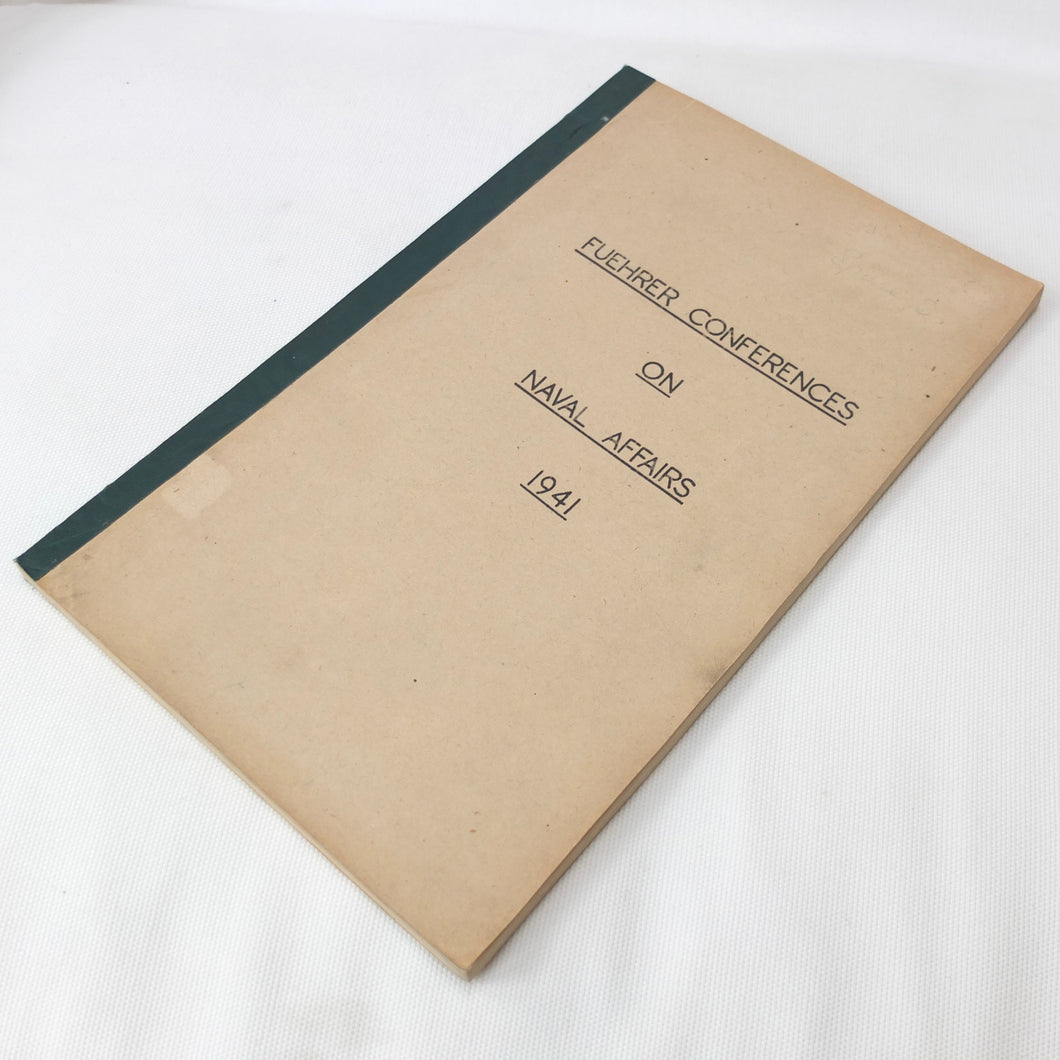 A rare original British Admiralty publication, produced in 1947 from the German archive documents captured by British and American Intelligence Officers during the war. The Fuehrer Conferences were produced as a detailed and comprehensive seven volume set, each volume covering one year of the war. This is the volume covering the events of 1941, including exceptionally interesting details and eye witness accounts of the sinking of the Bismarck in May 1941. All the signals to and from the Bismarck are included. These are some of the last ones sent: