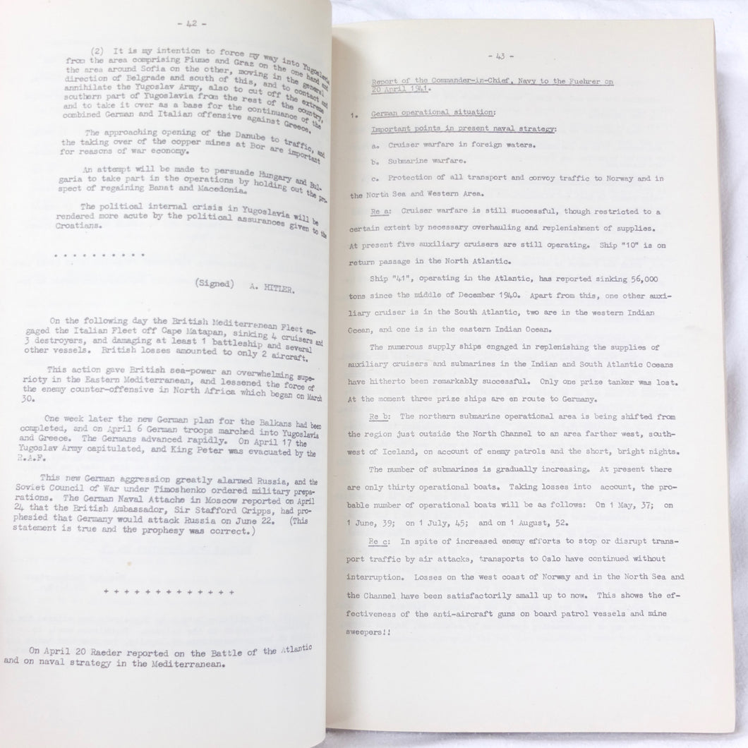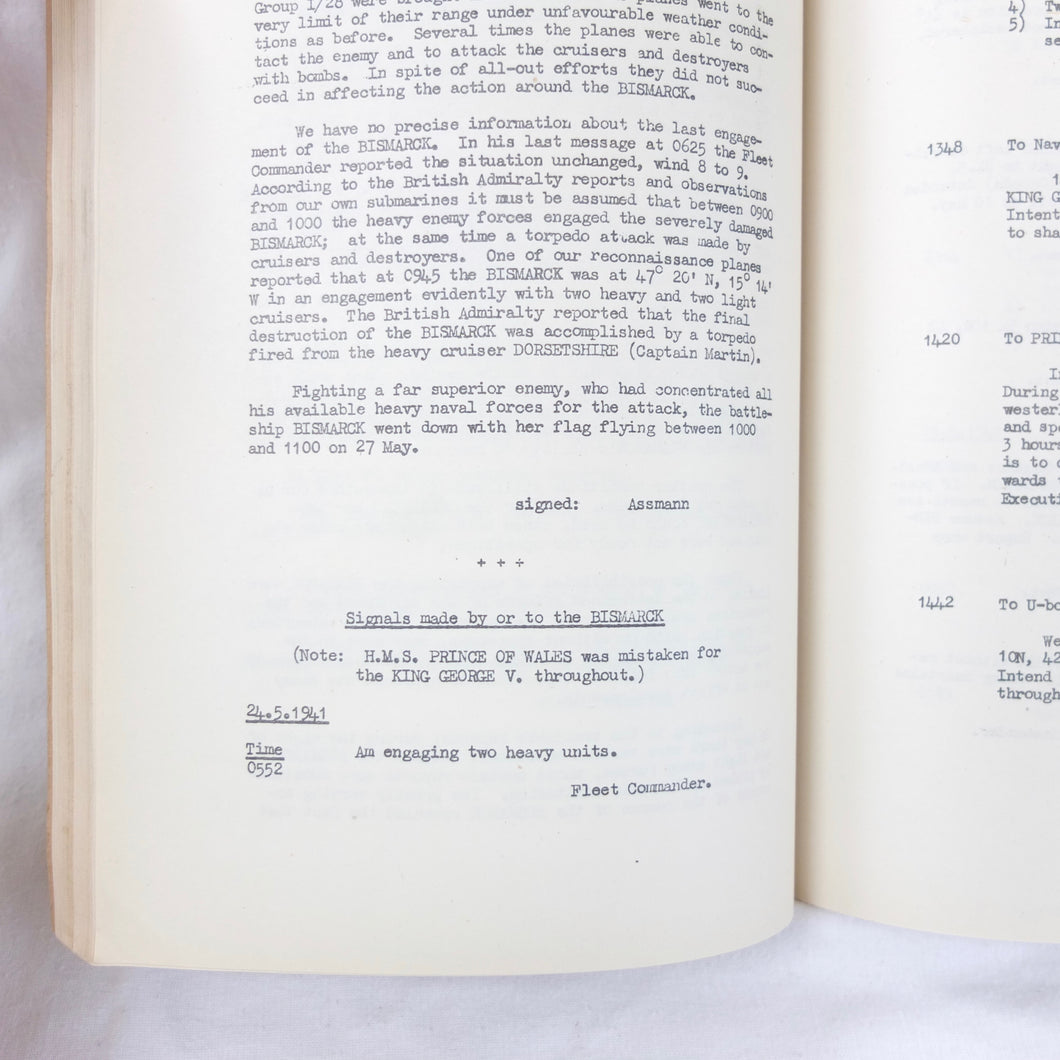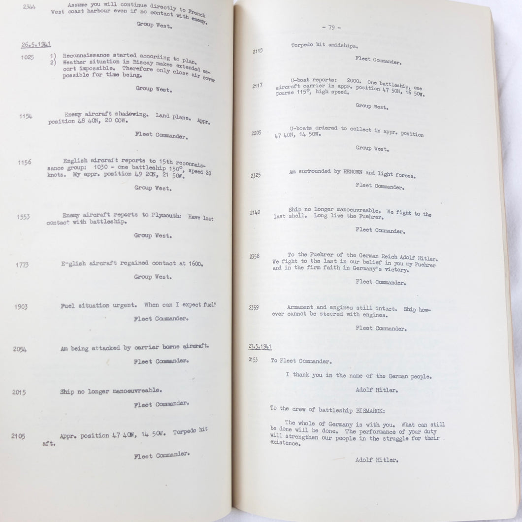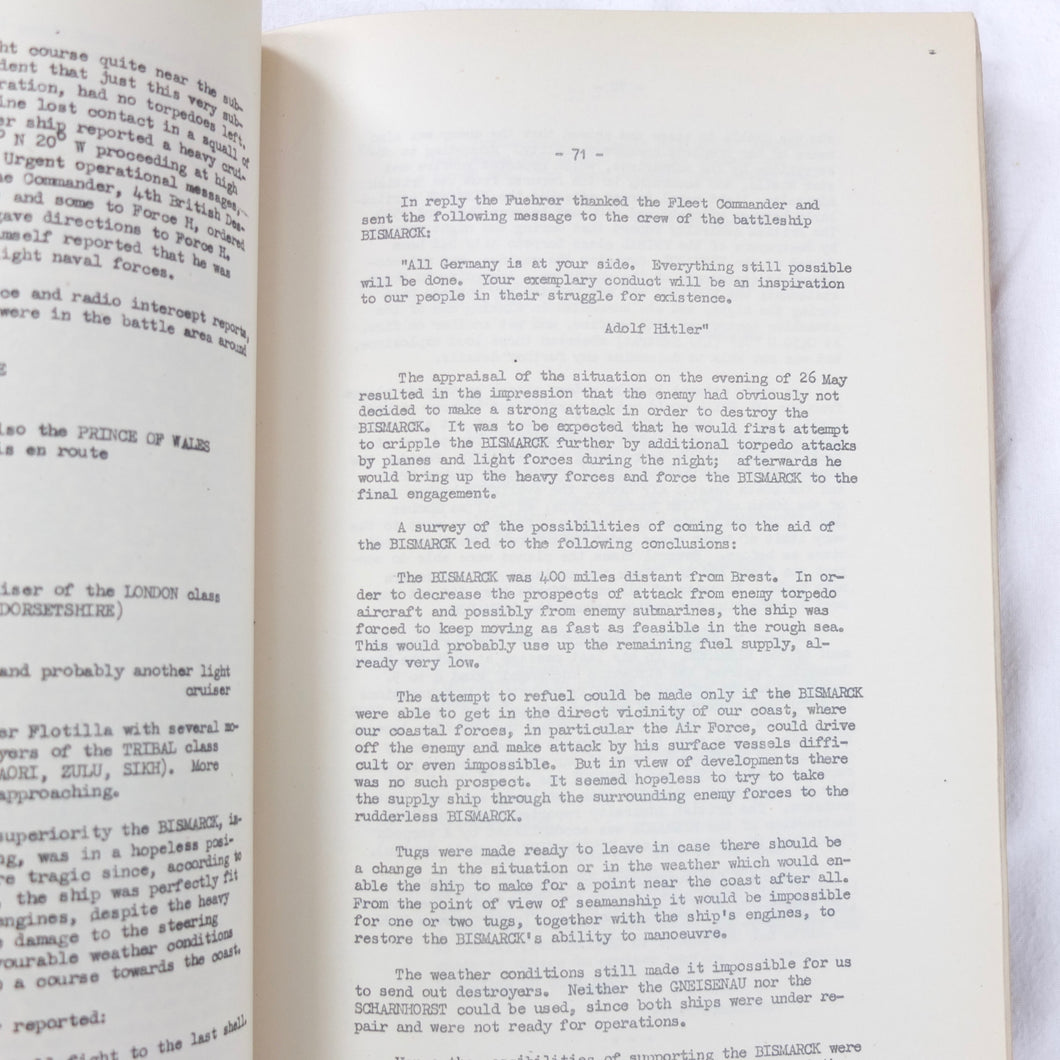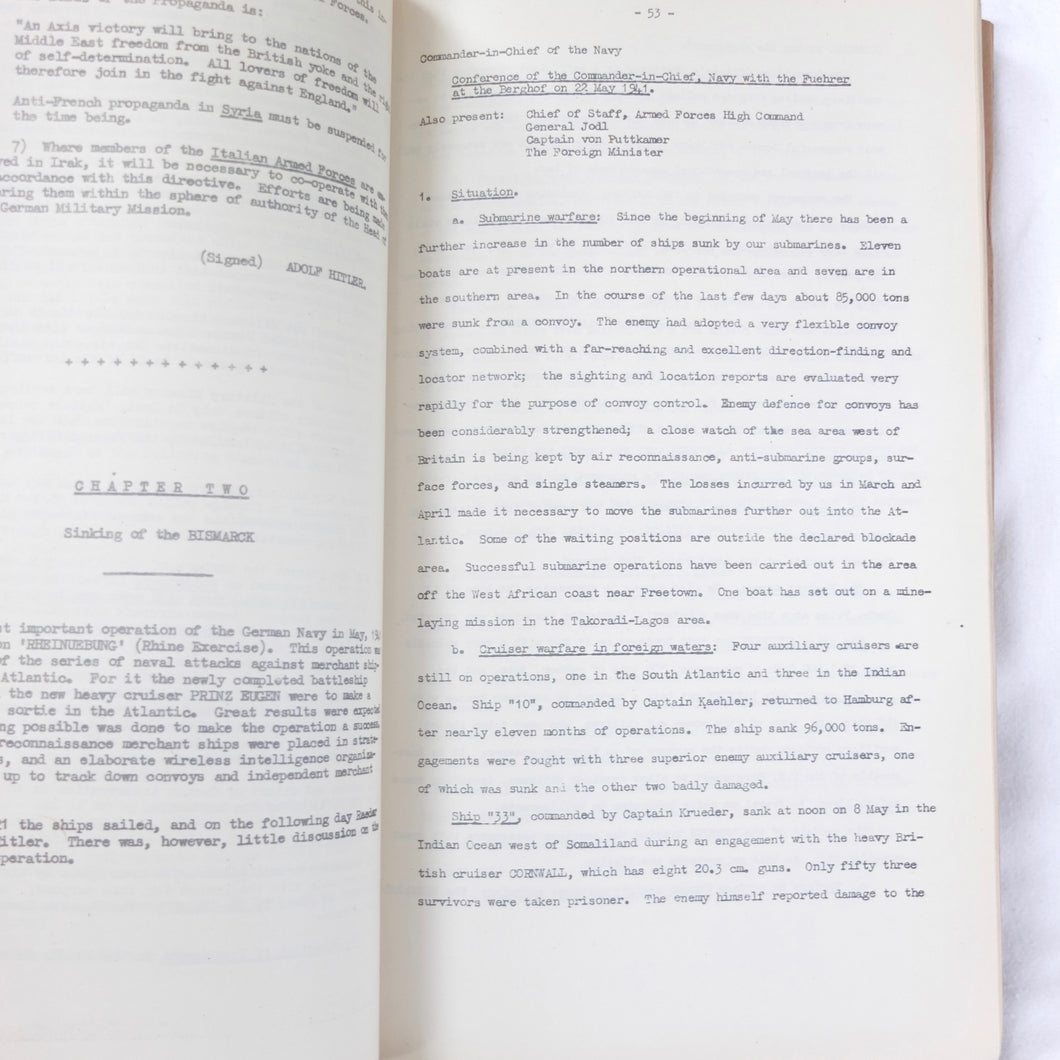 A rare original British Admiralty publication, produced in 1947 from the German archive documents captured by British and American Intelligence Officers during the war. The Fuehrer Conferences were produced as a detailed and comprehensive seven volume set, each volume covering one year of the war. This is the volume covering the events of 1941, including exceptionally interesting details and eye witness accounts of the sinking of the Bismarck in May 1941. All the signals to and from the Bismarck are included. These are some of the last ones sent: