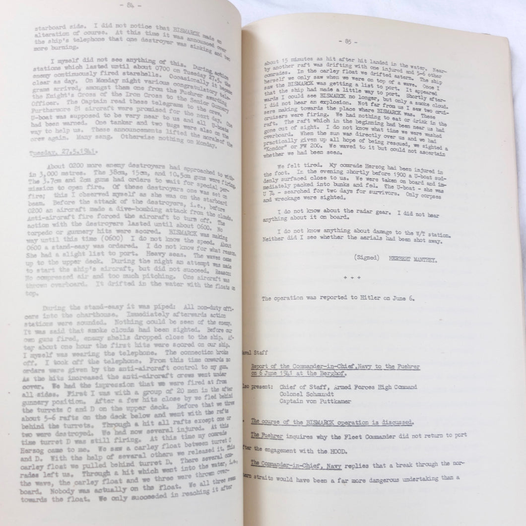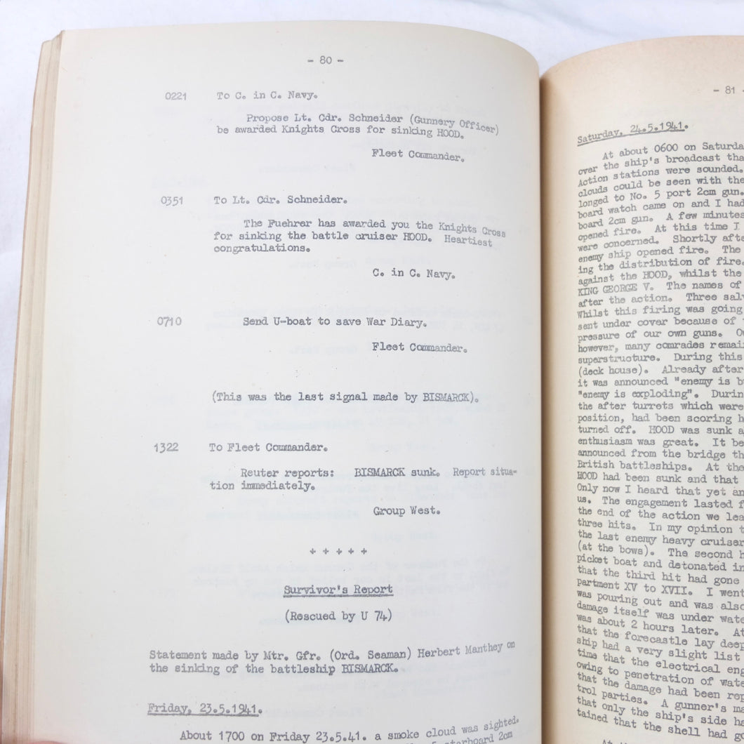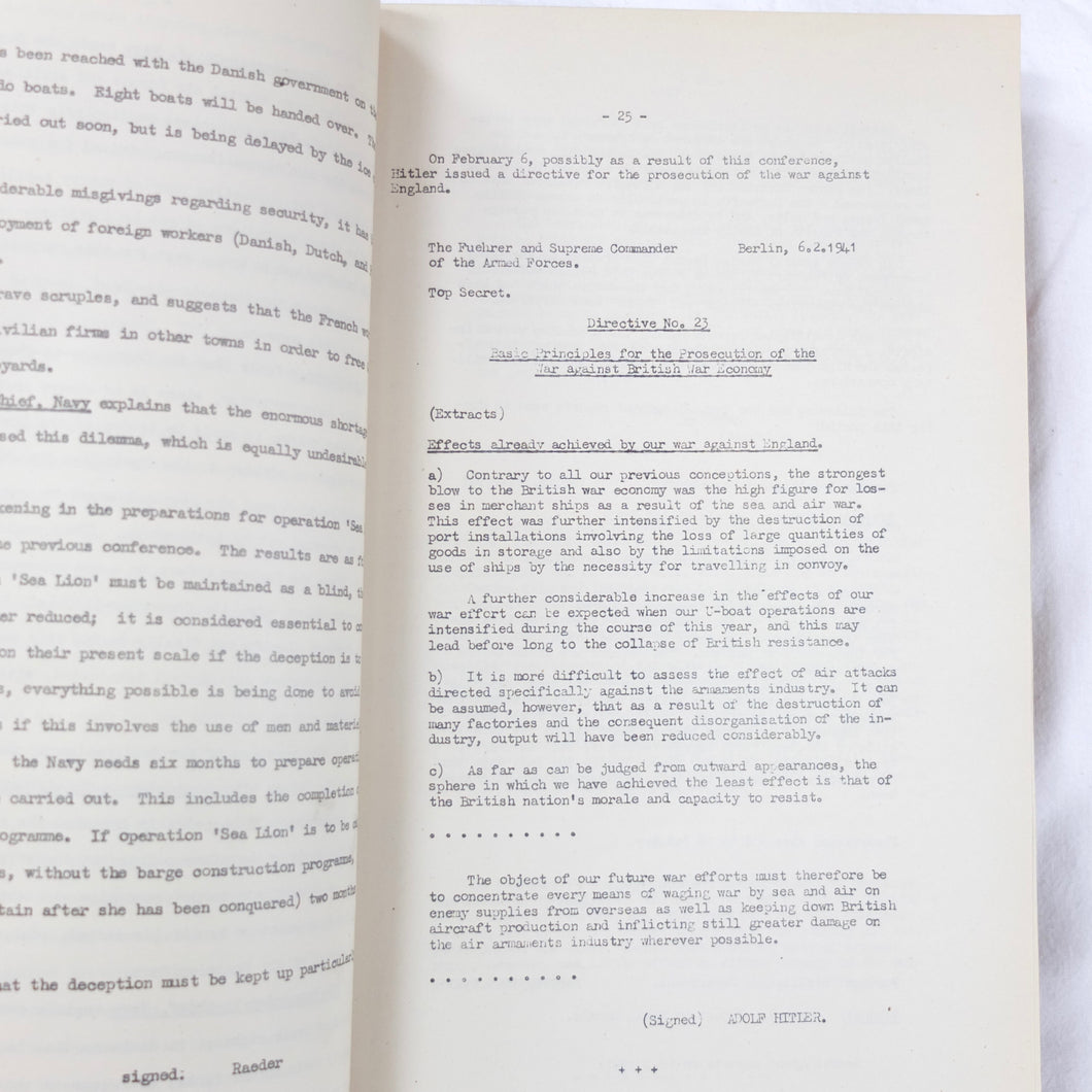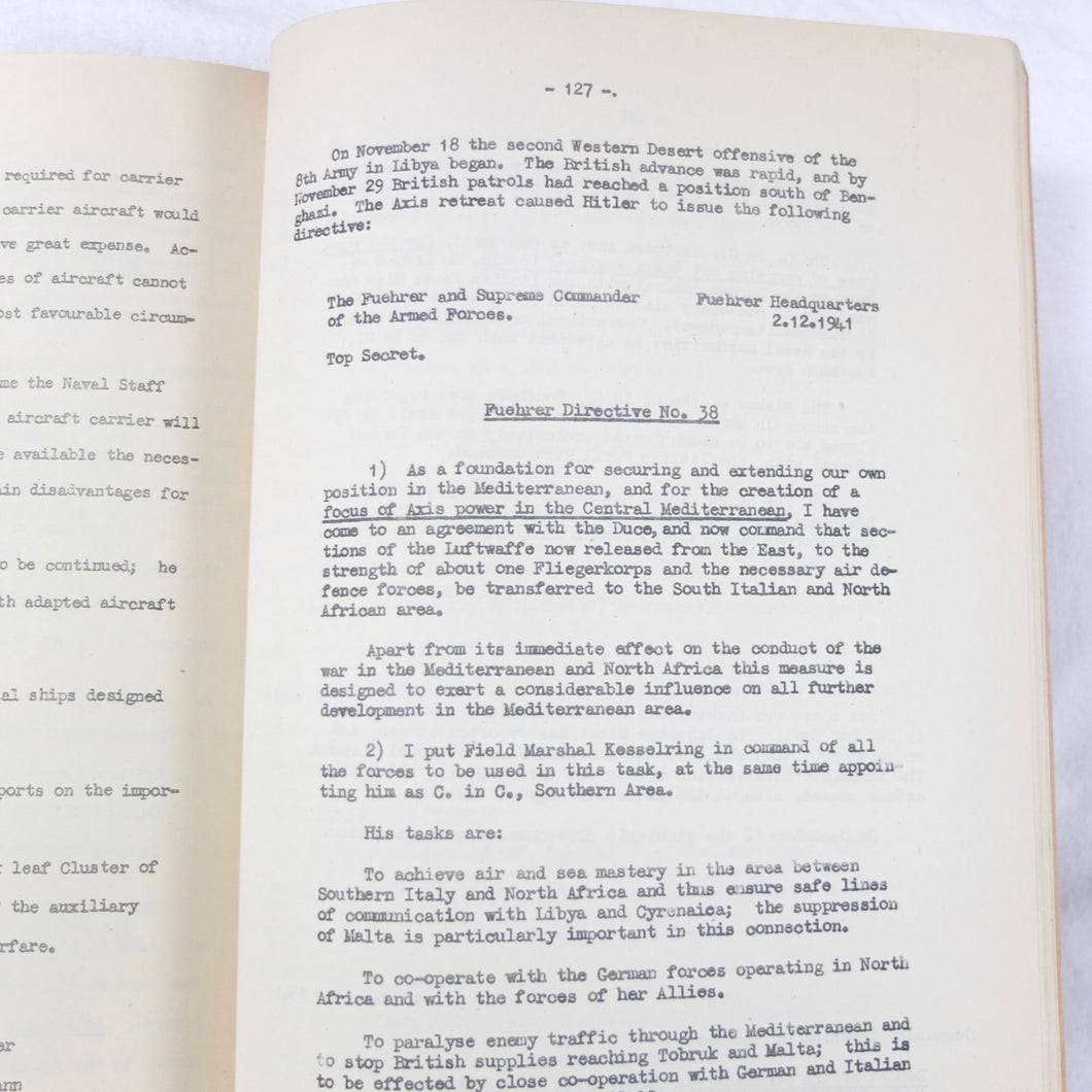 A rare original British Admiralty publication, produced in 1947 from the German archive documents captured by British and American Intelligence Officers during the war. The Fuehrer Conferences were produced as a detailed and comprehensive seven volume set, each volume covering one year of the war. This is the volume covering the events of 1941, including exceptionally interesting details and eye witness accounts of the sinking of the Bismarck in May 1941. All the signals to and from the Bismarck are included. These are some of the last ones sent: