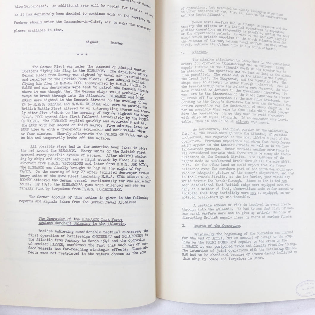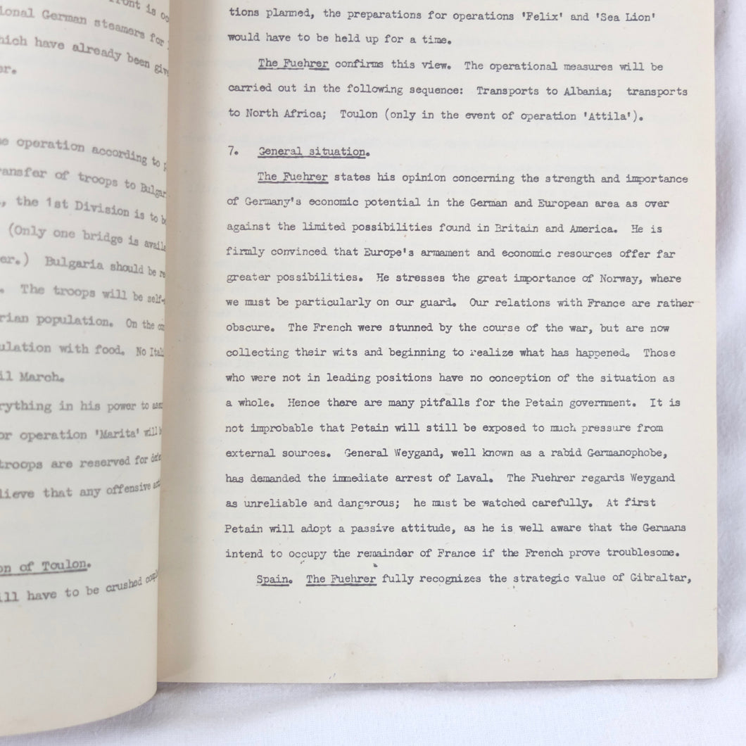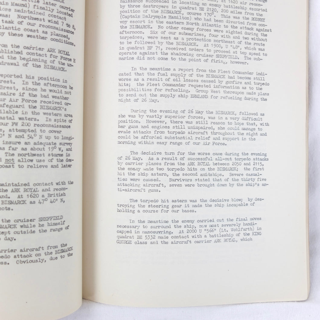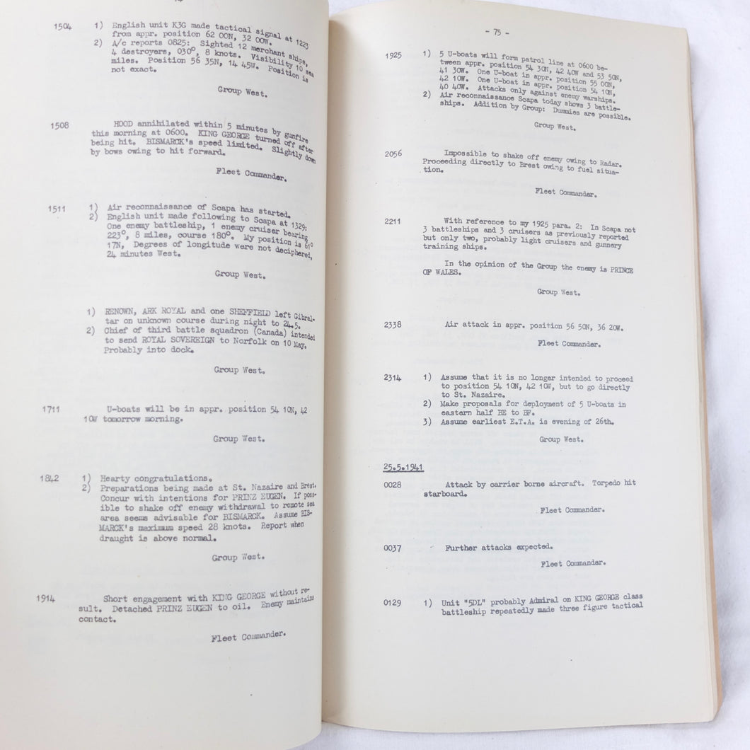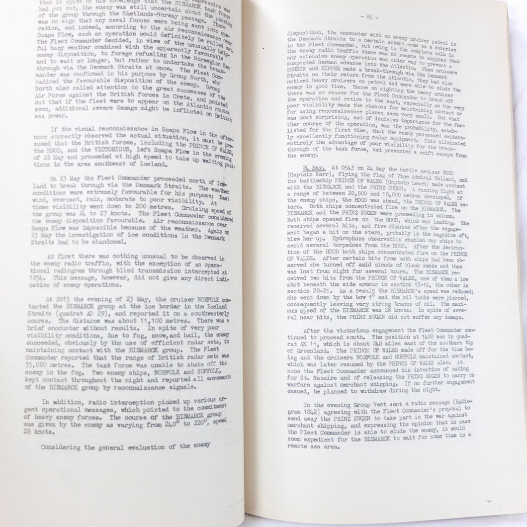 A rare original British Admiralty publication, produced in 1947 from the German archive documents captured by British and American Intelligence Officers during the war. The Fuehrer Conferences were produced as a detailed and comprehensive seven volume set, each volume covering one year of the war. This is the volume covering the events of 1941, including exceptionally interesting details and eye witness accounts of the sinking of the Bismarck in May 1941. All the signals to and from the Bismarck are included. These are some of the last ones sent: