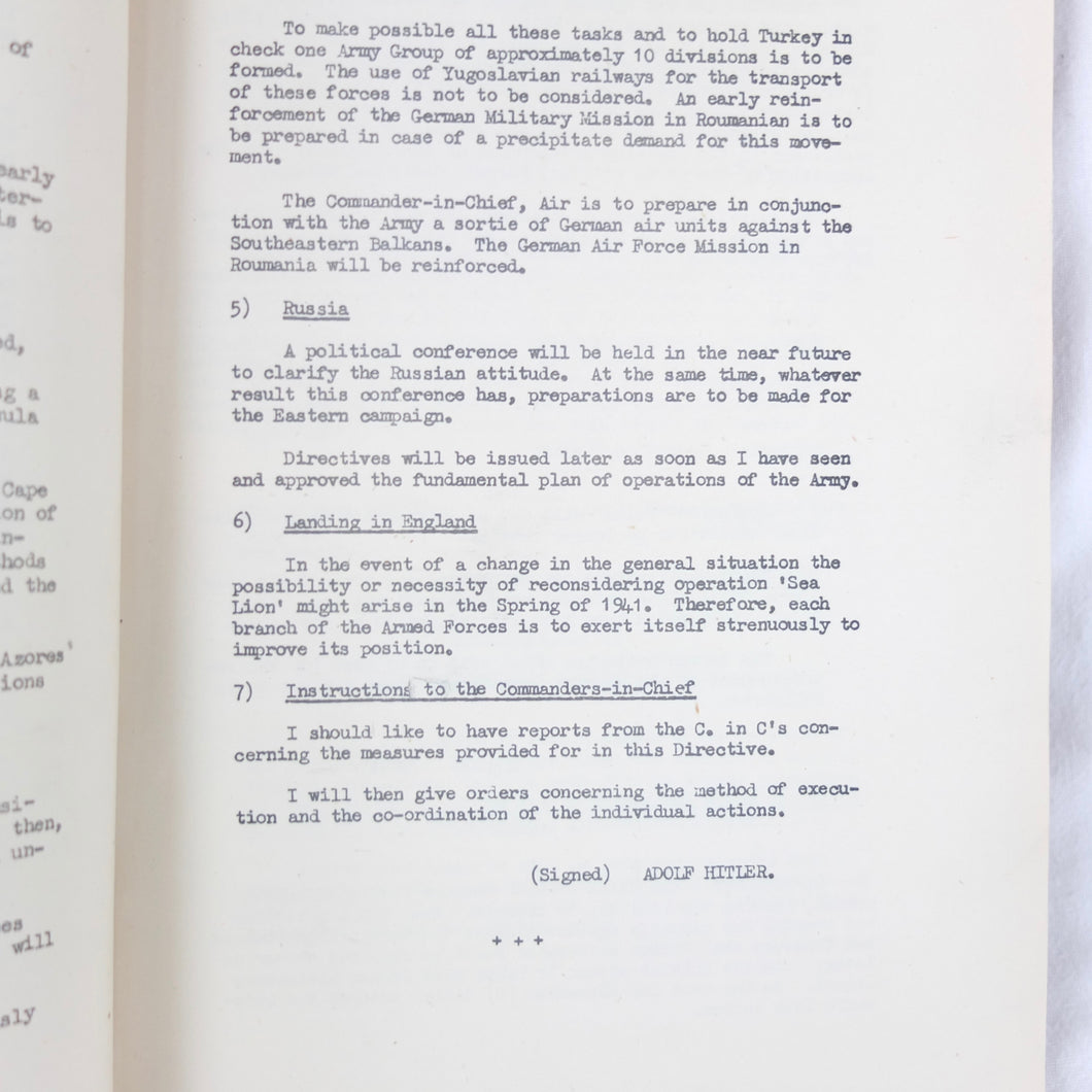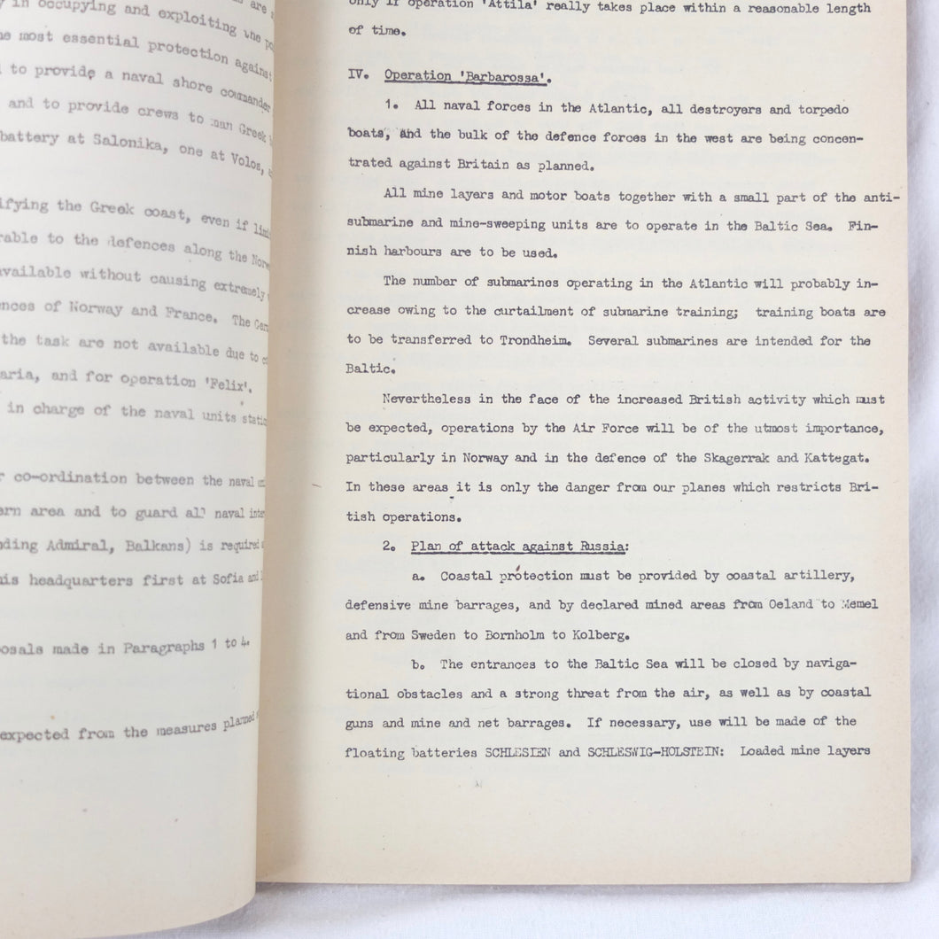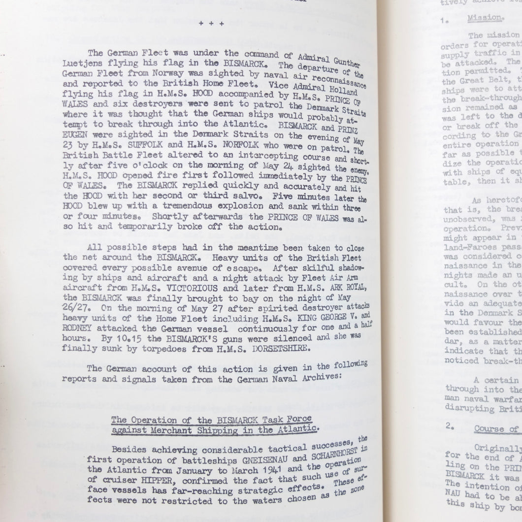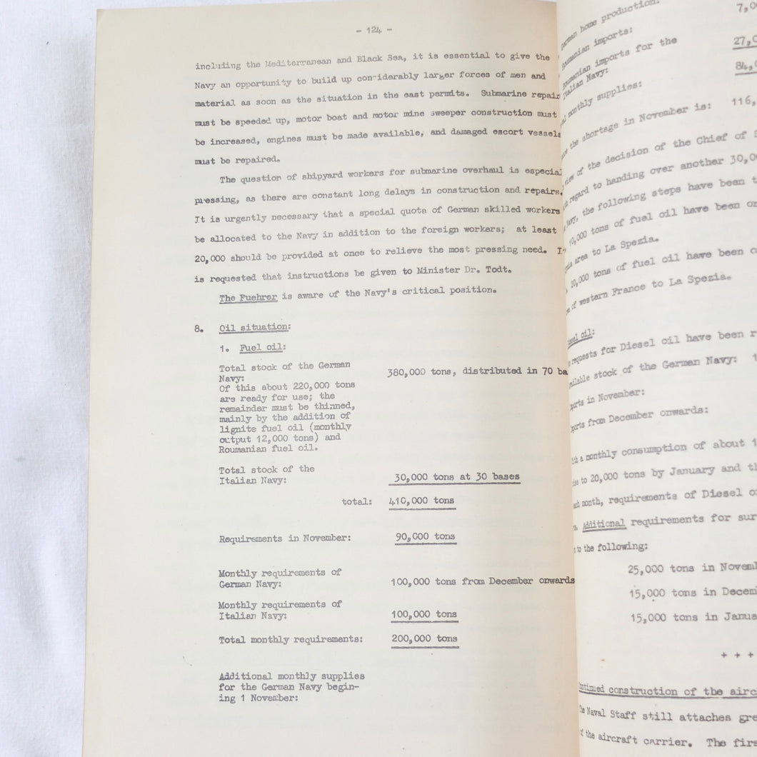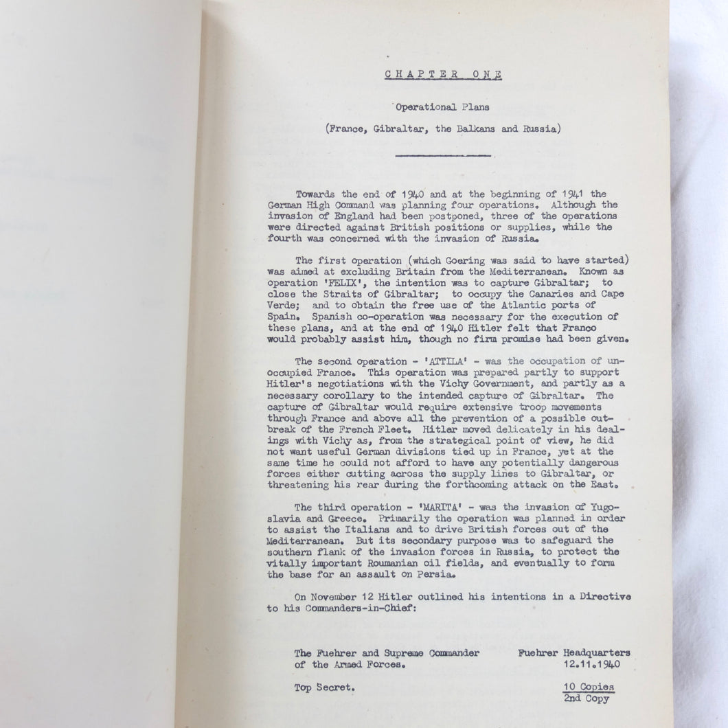 A rare original British Admiralty publication, produced in 1947 from the German archive documents captured by British and American Intelligence Officers during the war. The Fuehrer Conferences were produced as a detailed and comprehensive seven volume set, each volume covering one year of the war. This is the volume covering the events of 1941, including exceptionally interesting details and eye witness accounts of the sinking of the Bismarck in May 1941. All the signals to and from the Bismarck are included. These are some of the last ones sent: