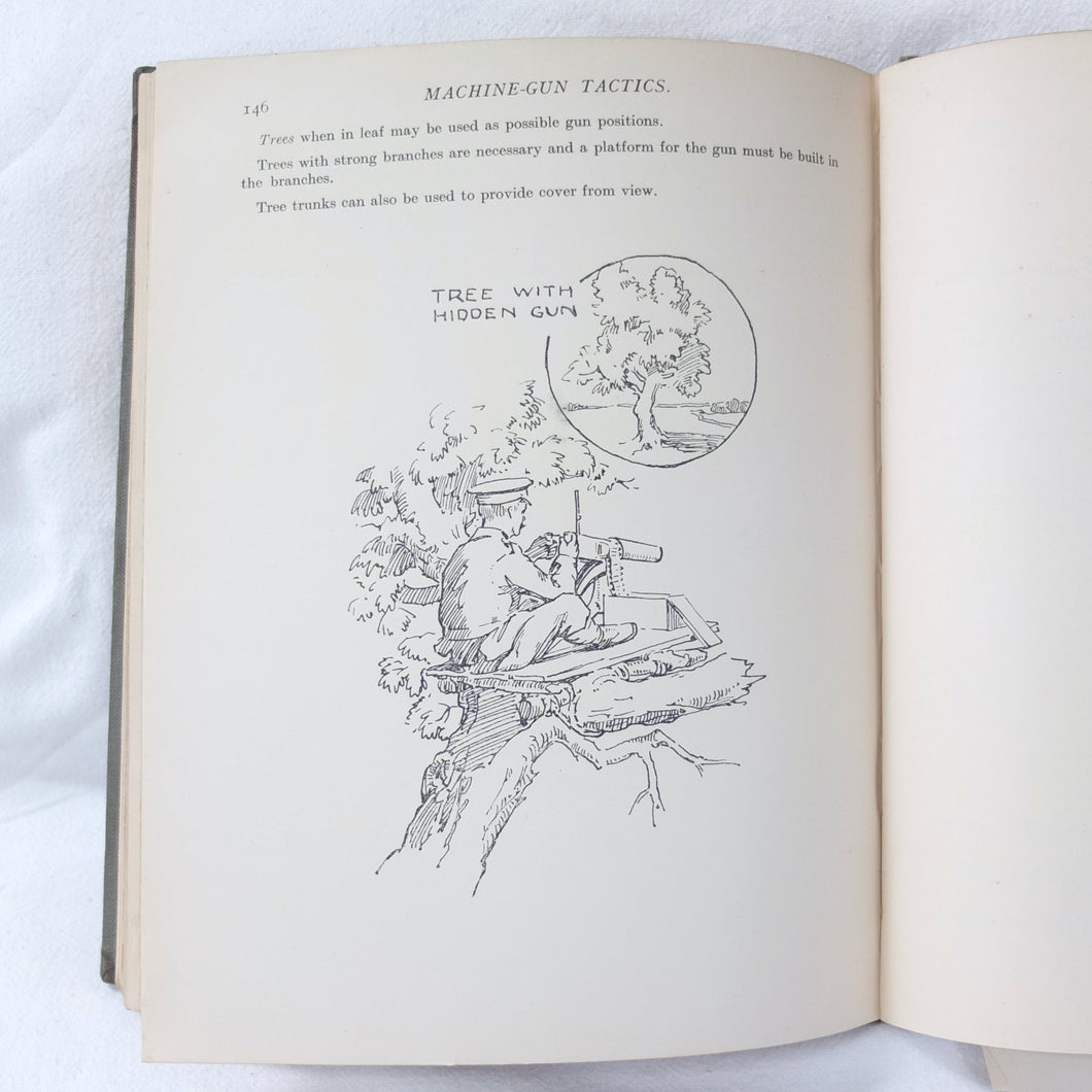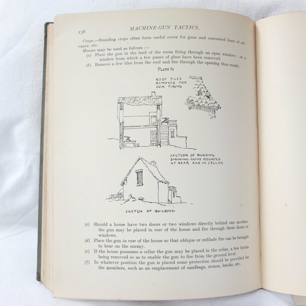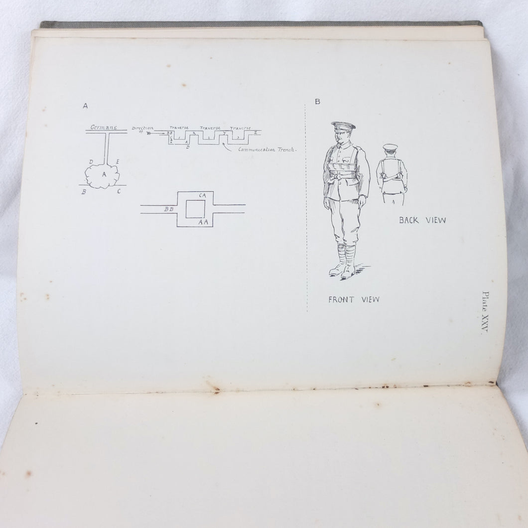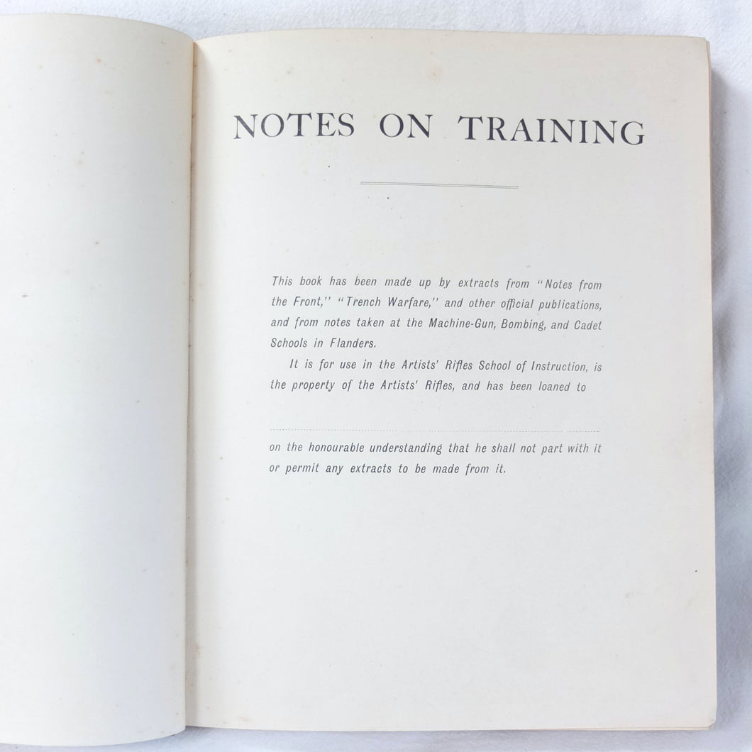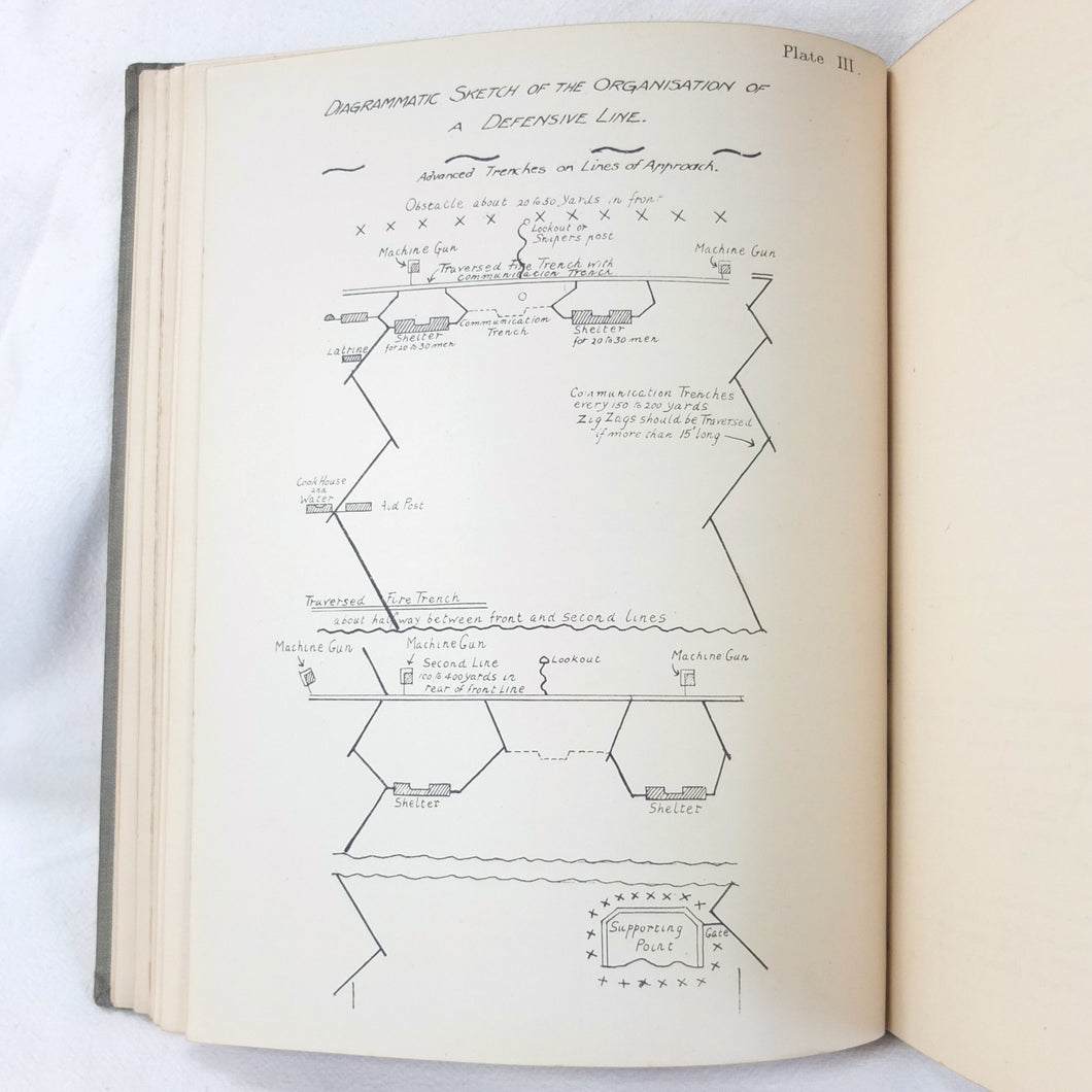 Notes on Training covers a wide range of subjects which would have formed an essential part of the training of a junior officer in 1915-16. These include: enemy tactics, trenches, rifles, bayonets, artillery, attack and defence, communication, intelligence, supplies, marching, kit, reconnaissance, defensive positions, sniping, bombing, loopholes, German field defences, machine gun tactics, machine gun posts, and general information on machine gun warfare. The book is very well illustrated with sketch maps, diagrams, and line drawings, including weapons, trenches, defensive positions, loopholes, and machine gun posts.