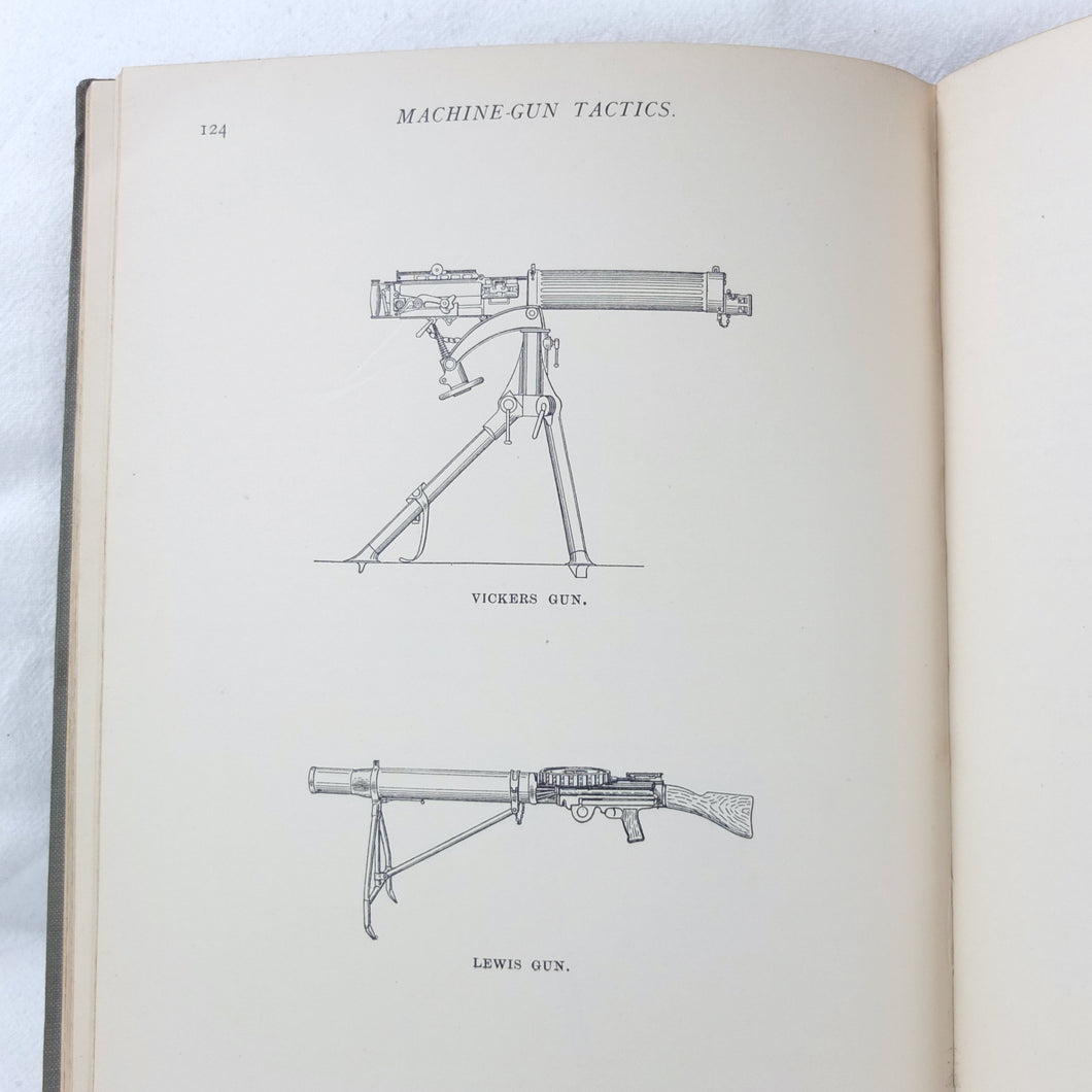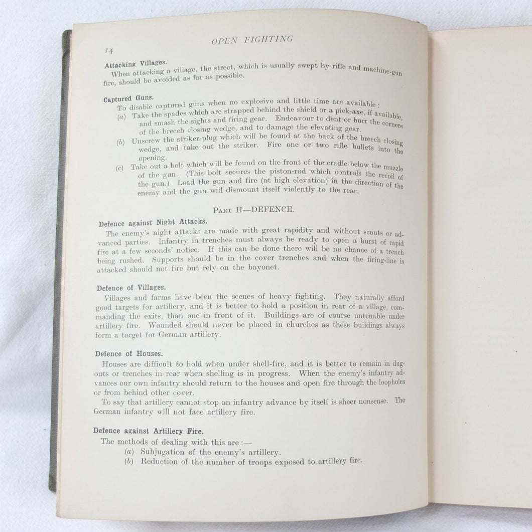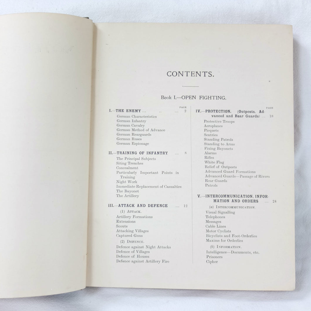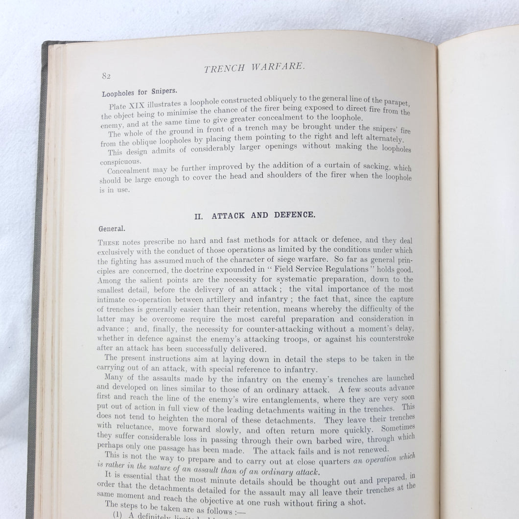 Notes on Training covers a wide range of subjects which would have formed an essential part of the training of a junior officer in 1915-16. These include: enemy tactics, trenches, rifles, bayonets, artillery, attack and defence, communication, intelligence, supplies, marching, kit, reconnaissance, defensive positions, sniping, bombing, loopholes, German field defences, machine gun tactics, machine gun posts, and general information on machine gun warfare. The book is very well illustrated with sketch maps, diagrams, and line drawings, including weapons, trenches, defensive positions, loopholes, and machine gun posts.