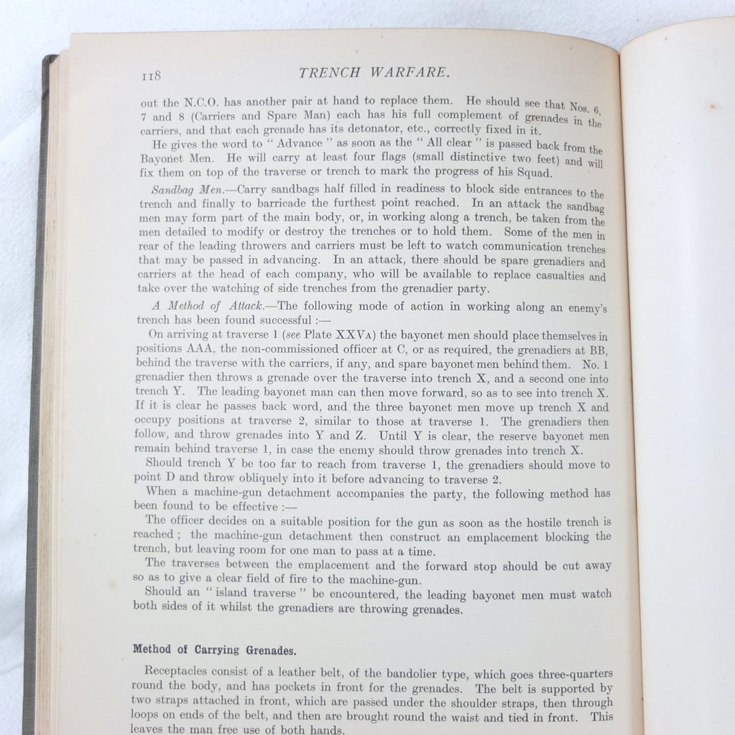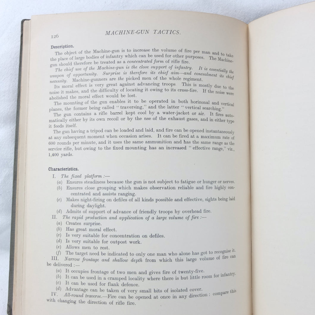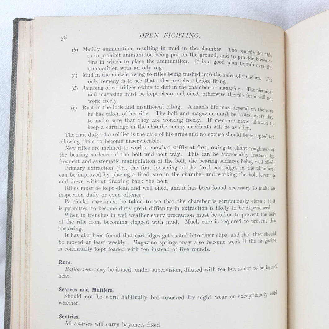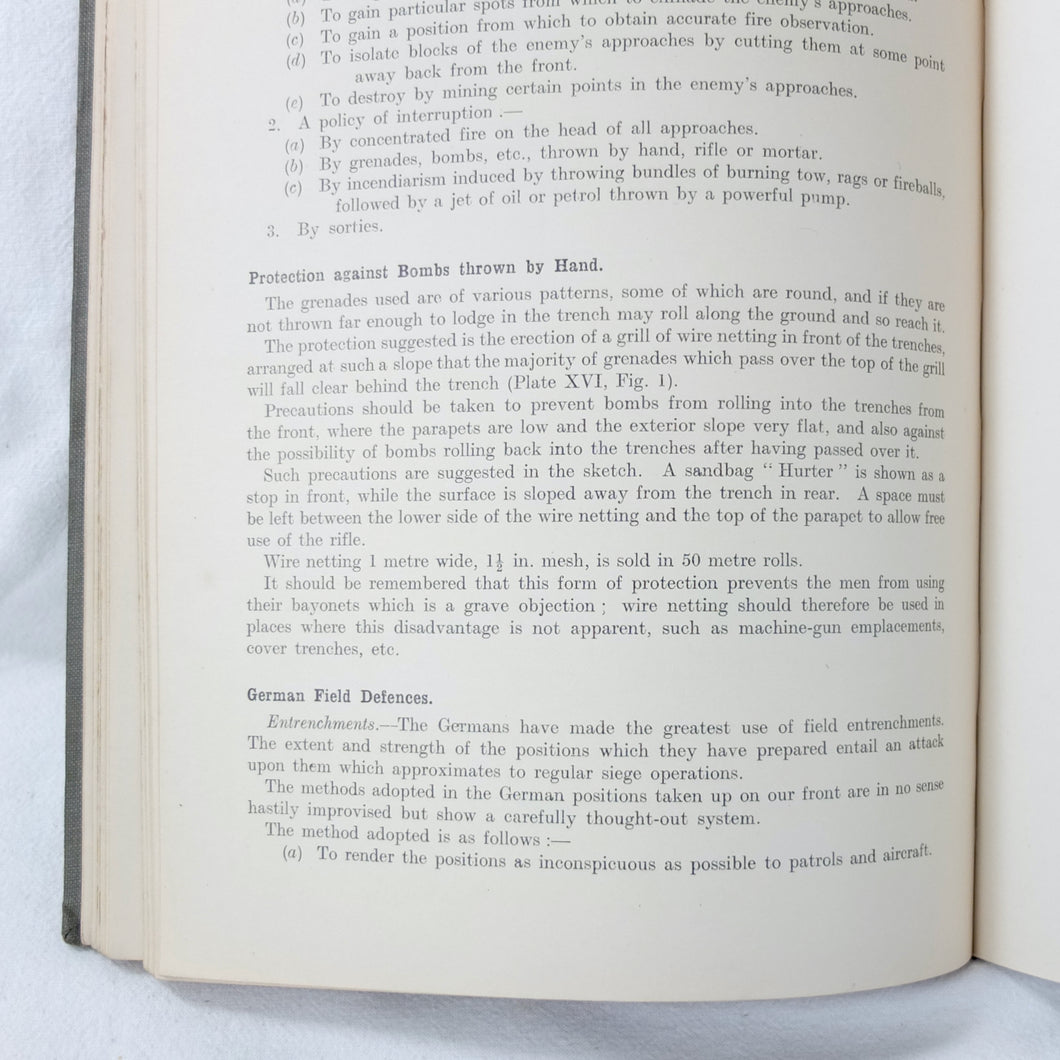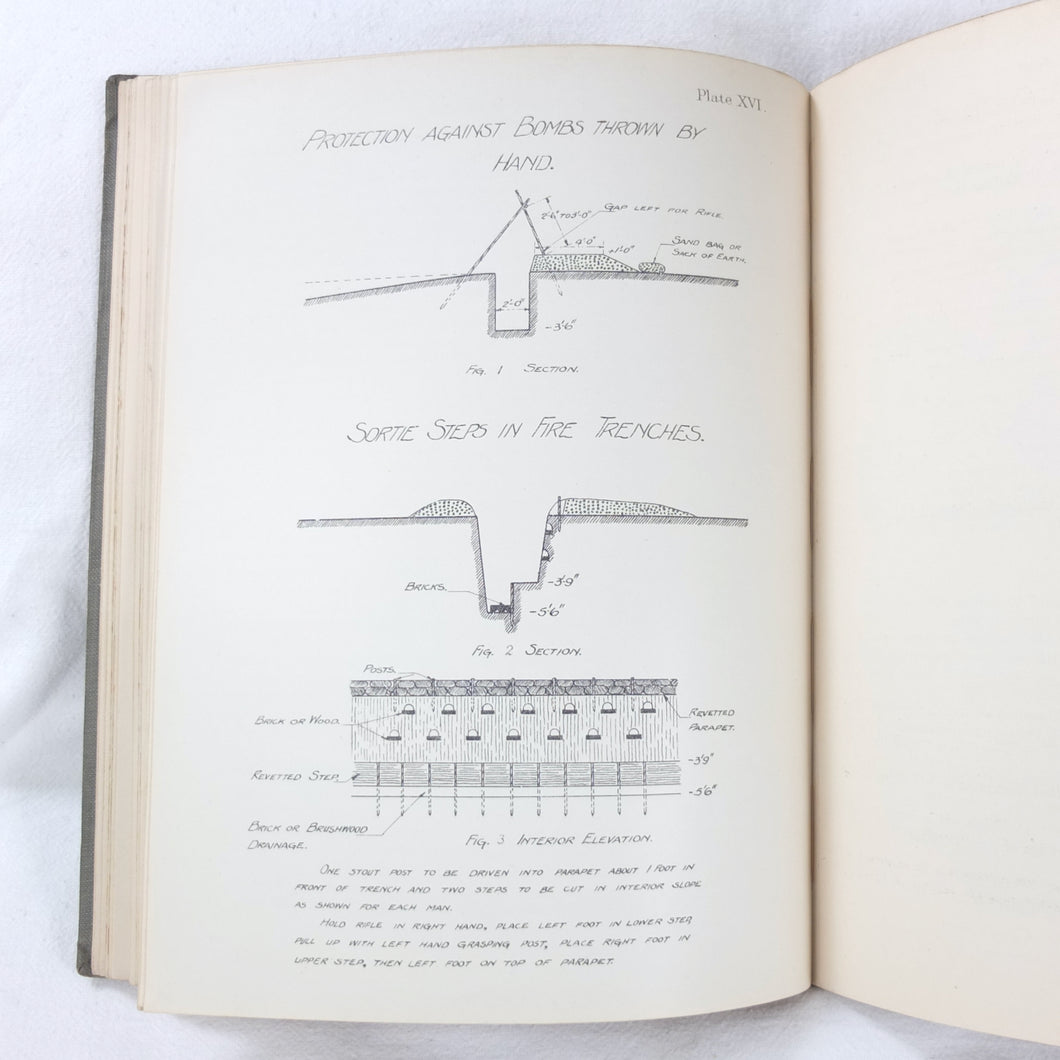 Notes on Training covers a wide range of subjects which would have formed an essential part of the training of a junior officer in 1915-16. These include: enemy tactics, trenches, rifles, bayonets, artillery, attack and defence, communication, intelligence, supplies, marching, kit, reconnaissance, defensive positions, sniping, bombing, loopholes, German field defences, machine gun tactics, machine gun posts, and general information on machine gun warfare. The book is very well illustrated with sketch maps, diagrams, and line drawings, including weapons, trenches, defensive positions, loopholes, and machine gun posts.