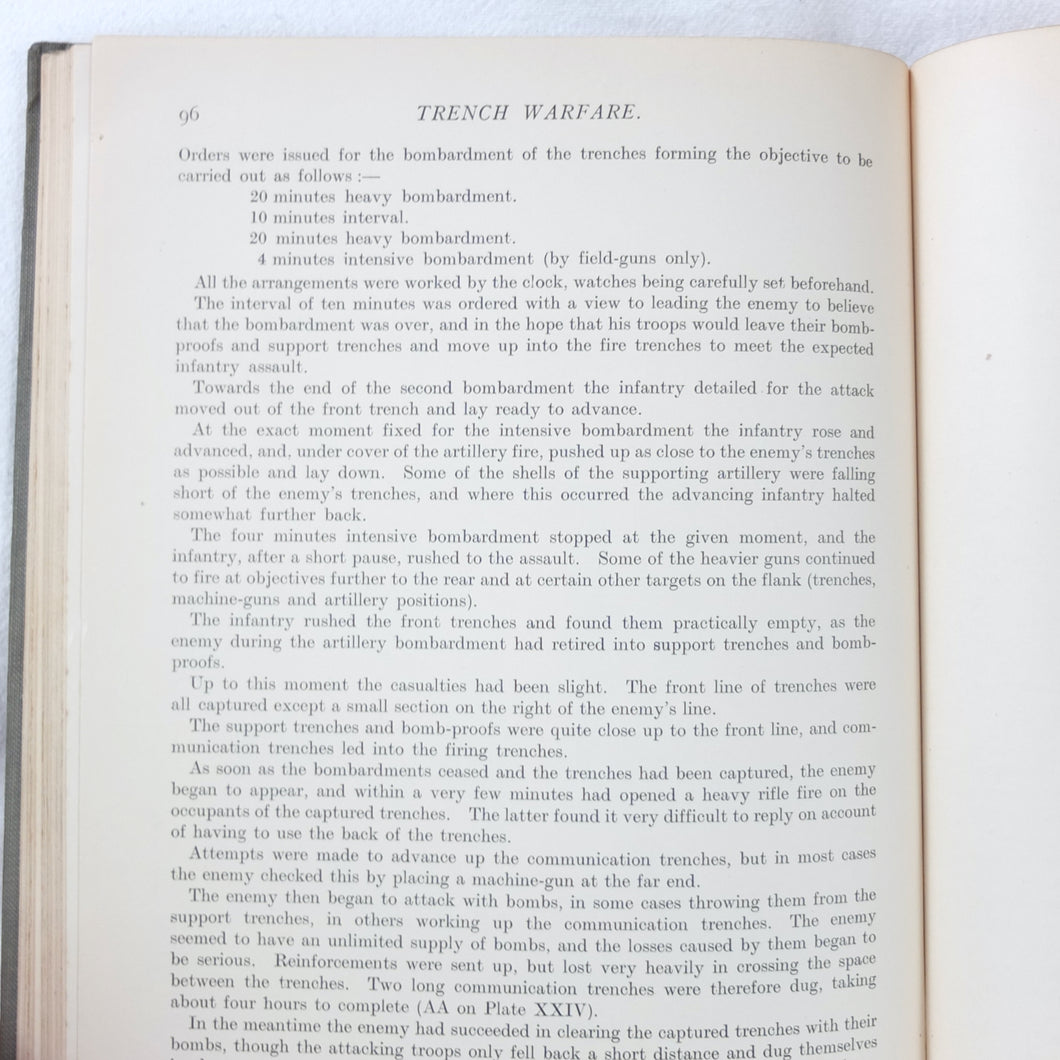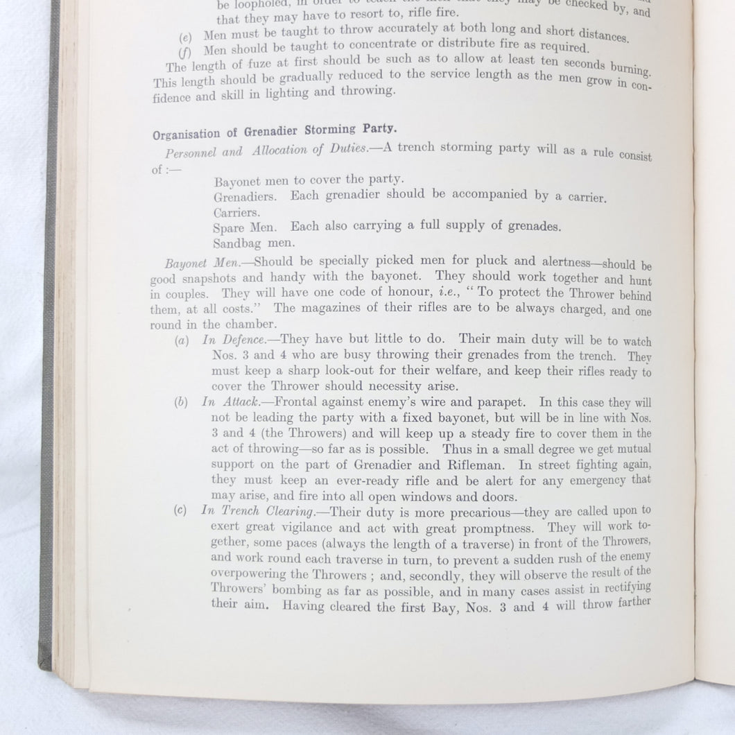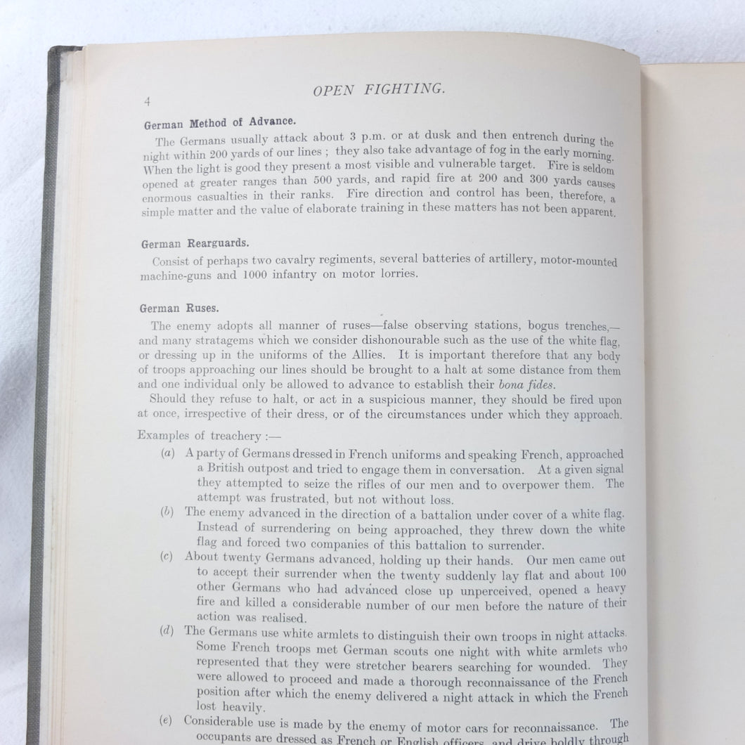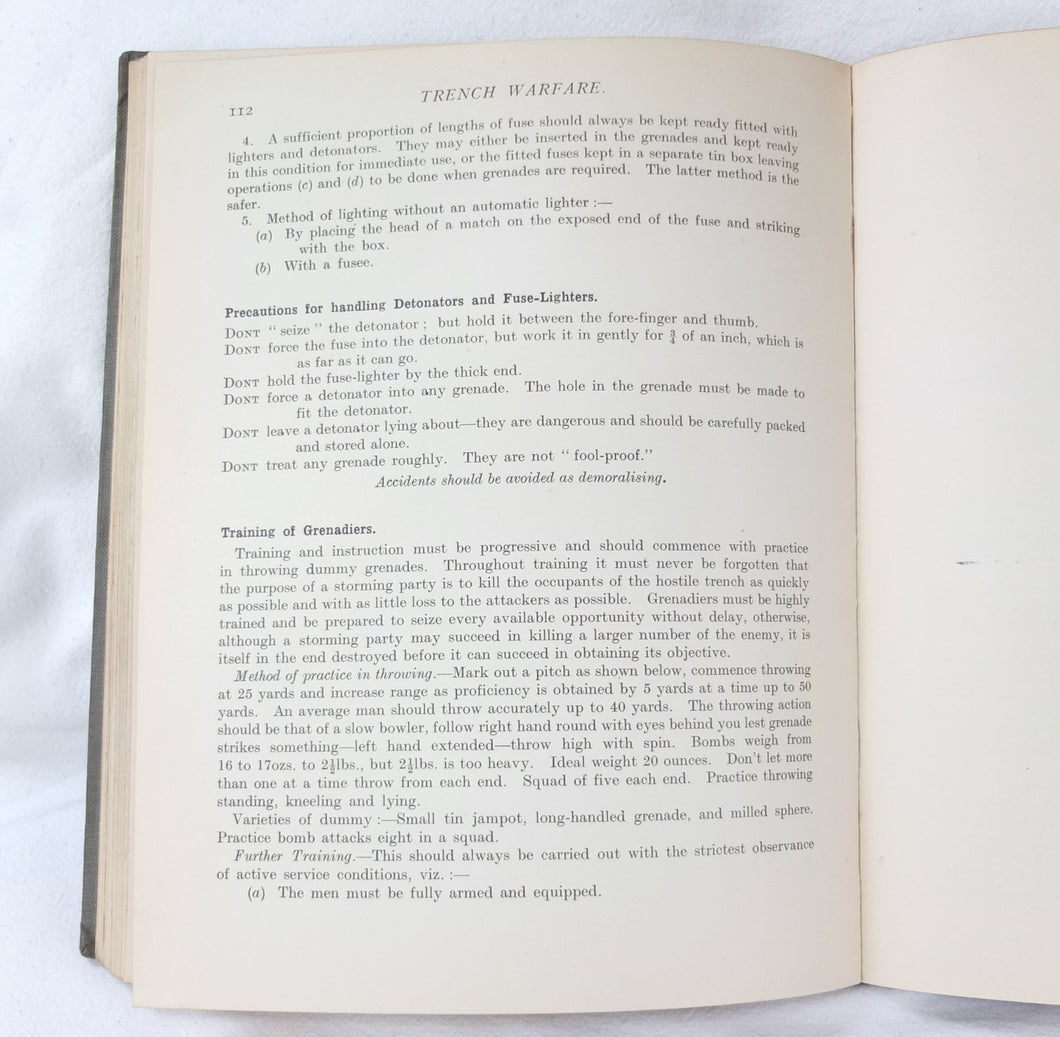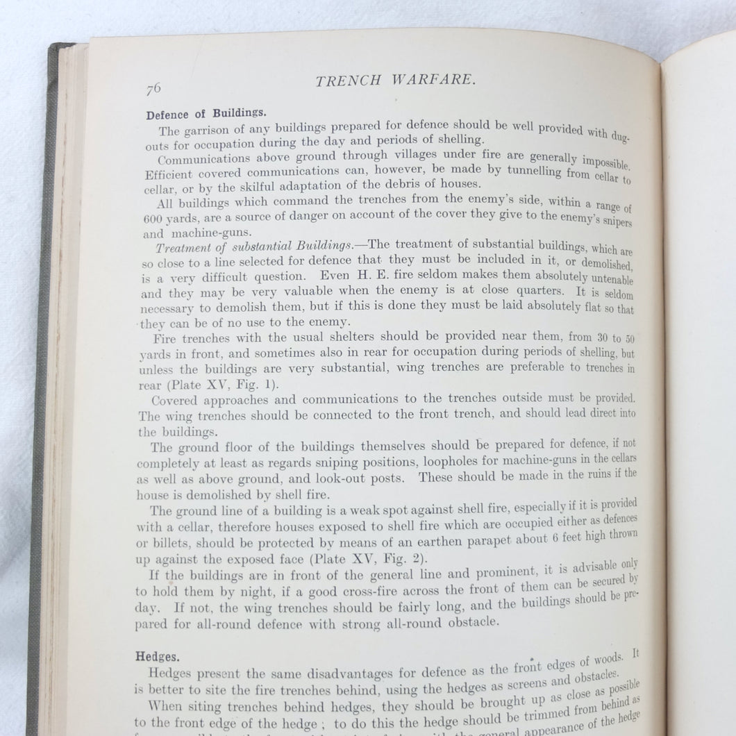 Notes on Training covers a wide range of subjects which would have formed an essential part of the training of a junior officer in 1915-16. These include: enemy tactics, trenches, rifles, bayonets, artillery, attack and defence, communication, intelligence, supplies, marching, kit, reconnaissance, defensive positions, sniping, bombing, loopholes, German field defences, machine gun tactics, machine gun posts, and general information on machine gun warfare. The book is very well illustrated with sketch maps, diagrams, and line drawings, including weapons, trenches, defensive positions, loopholes, and machine gun posts.