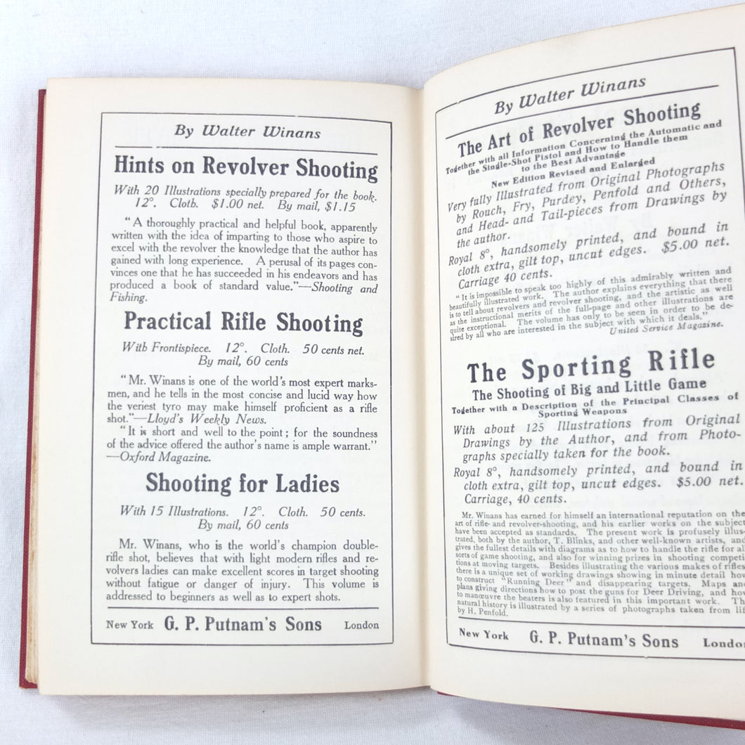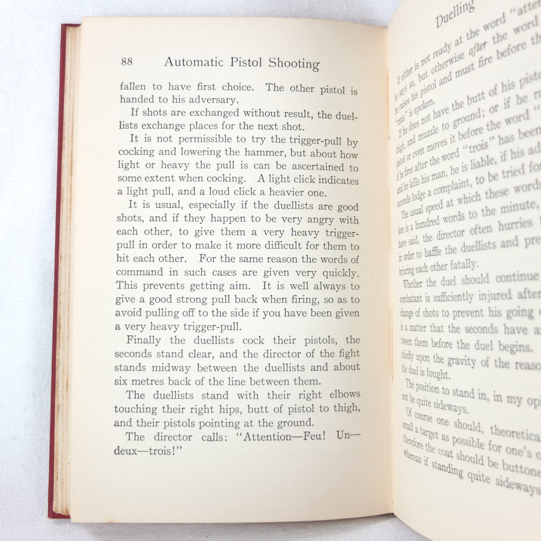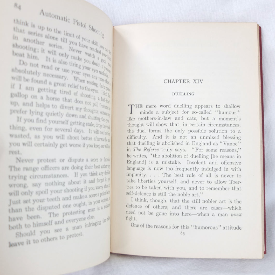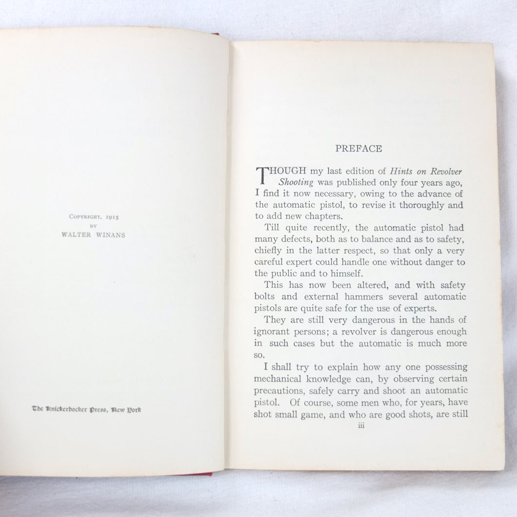A classic automatic pistol manual published in 1915, written by the celebrated Olympic marksman, firearms expert and noted sculptor, Walter Winans. Automatic Pistol Shooting (1916) is a practical shooting manual covering the use of both the automatic pistol and the revolver. In Winan's opinion the automatic was the weapon of the future, although the revolver was by no means redundant in 1916. The book covers a wide range of topics, including selecting a pistol, cleaning, sights, rapid firing, target shooting, competion shooting, duelling and self defence. There are also sections on more unusual subjects such as stage shooting and trick shooting. The coverage of duelling now seems rather eccentric, at a time when the practice had been almost completely abandoned, and the automatic pistol was hardly a suitable weapon in such a contest. The pistols covered in the book include the 1911 Colt .45 Automatic, the Smith & Wesson revolver and the Savage .38 Automatic.