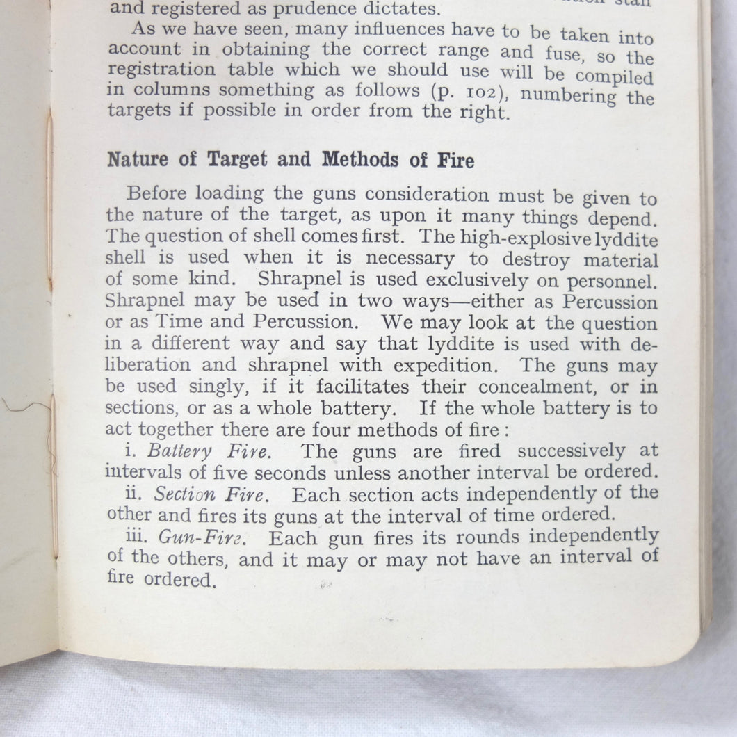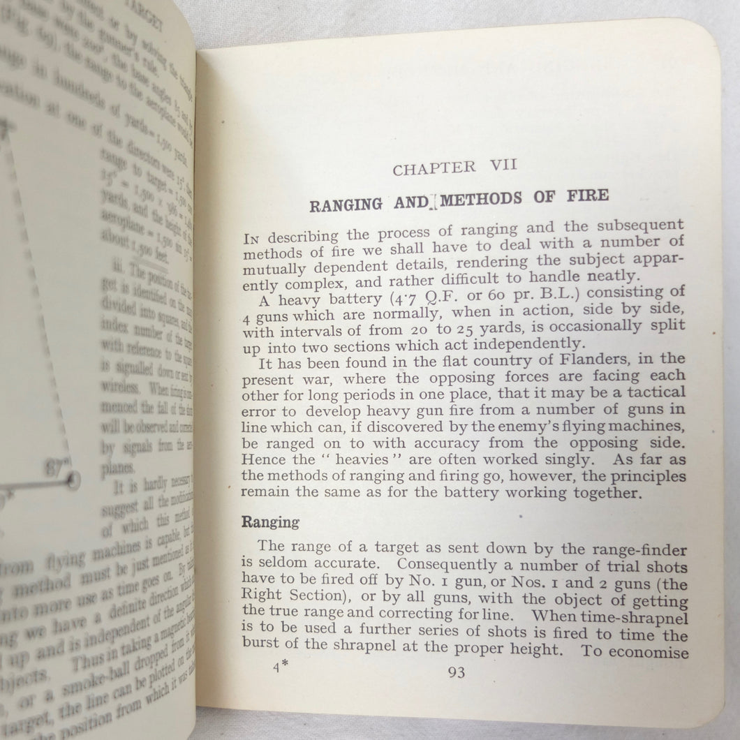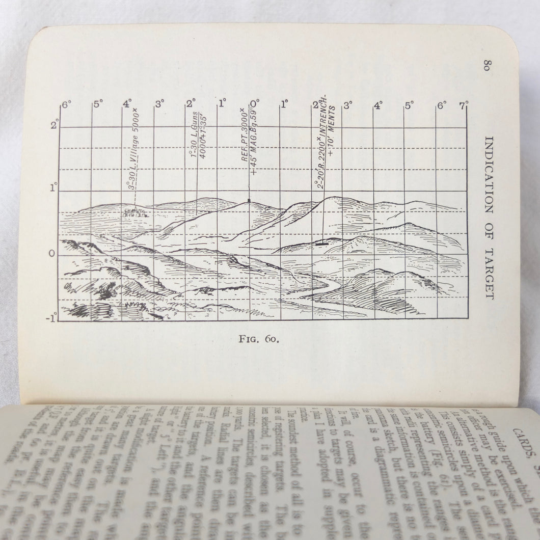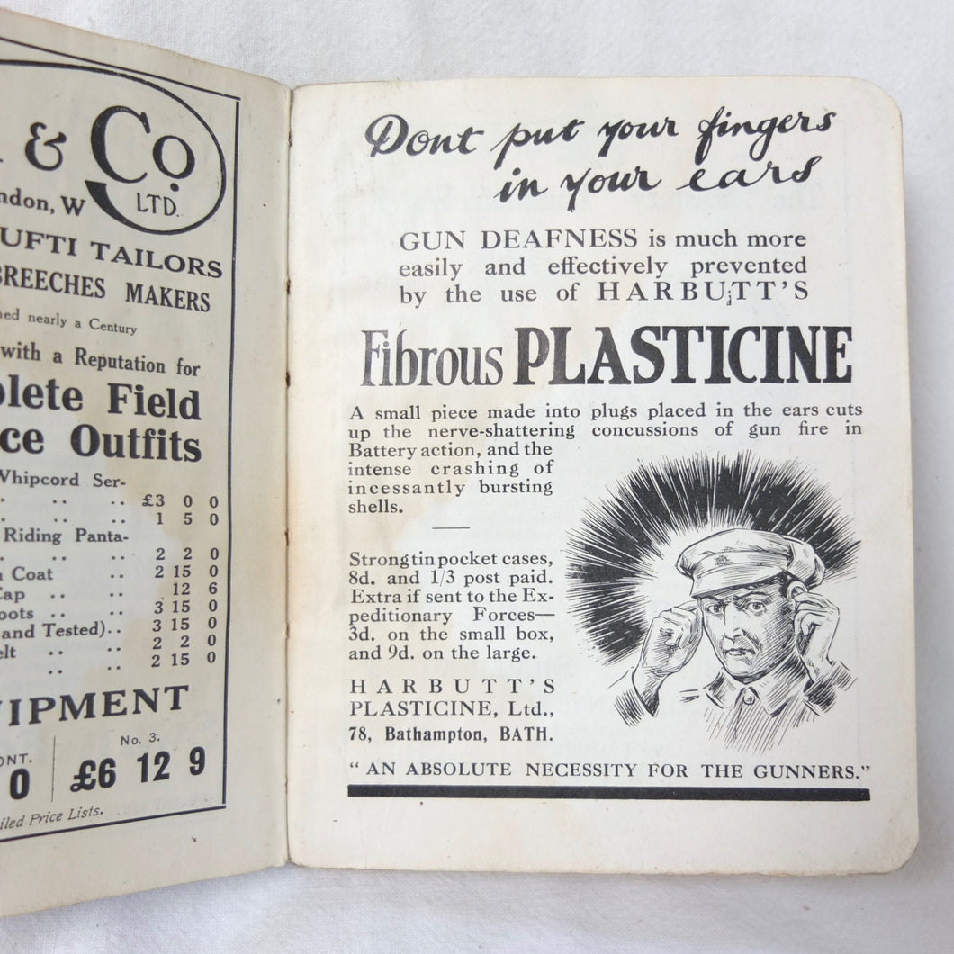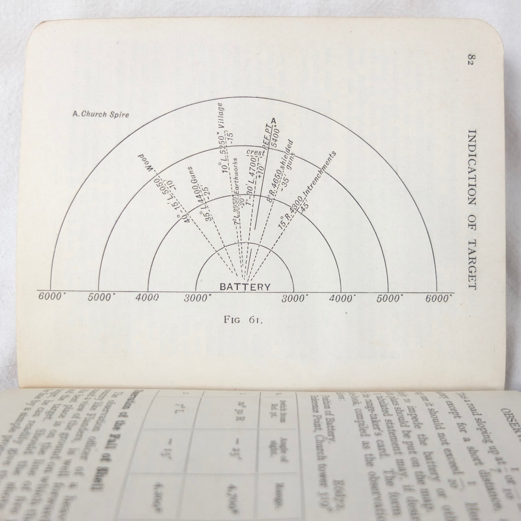 Field Gunnery includes comprehensive details of the effective use of artillery in trench warfare. Covering everything that an artillery officer or battery commander would need to know when bringing his guns into action: from positioning and ranging the guns, to the creeping barrage and the different types of shrapnel shell and fuse that might be used. The book is very well illustrated throughout, with diagrams and line drawings. There are also some interesting advertisements for officers trench equipment, with details of popular brands of officer's kit, ear protection ('Fibrous Plasticine: an absolute necessity for the gunners'), and luminous military watches.