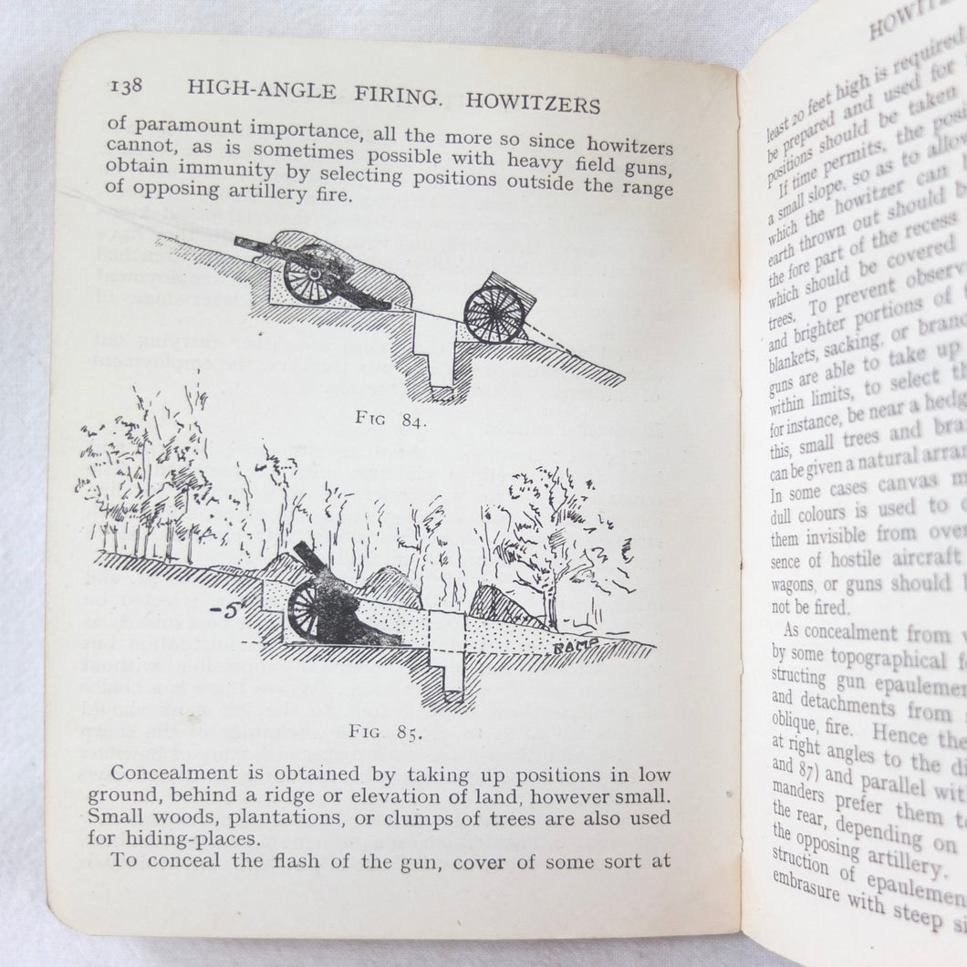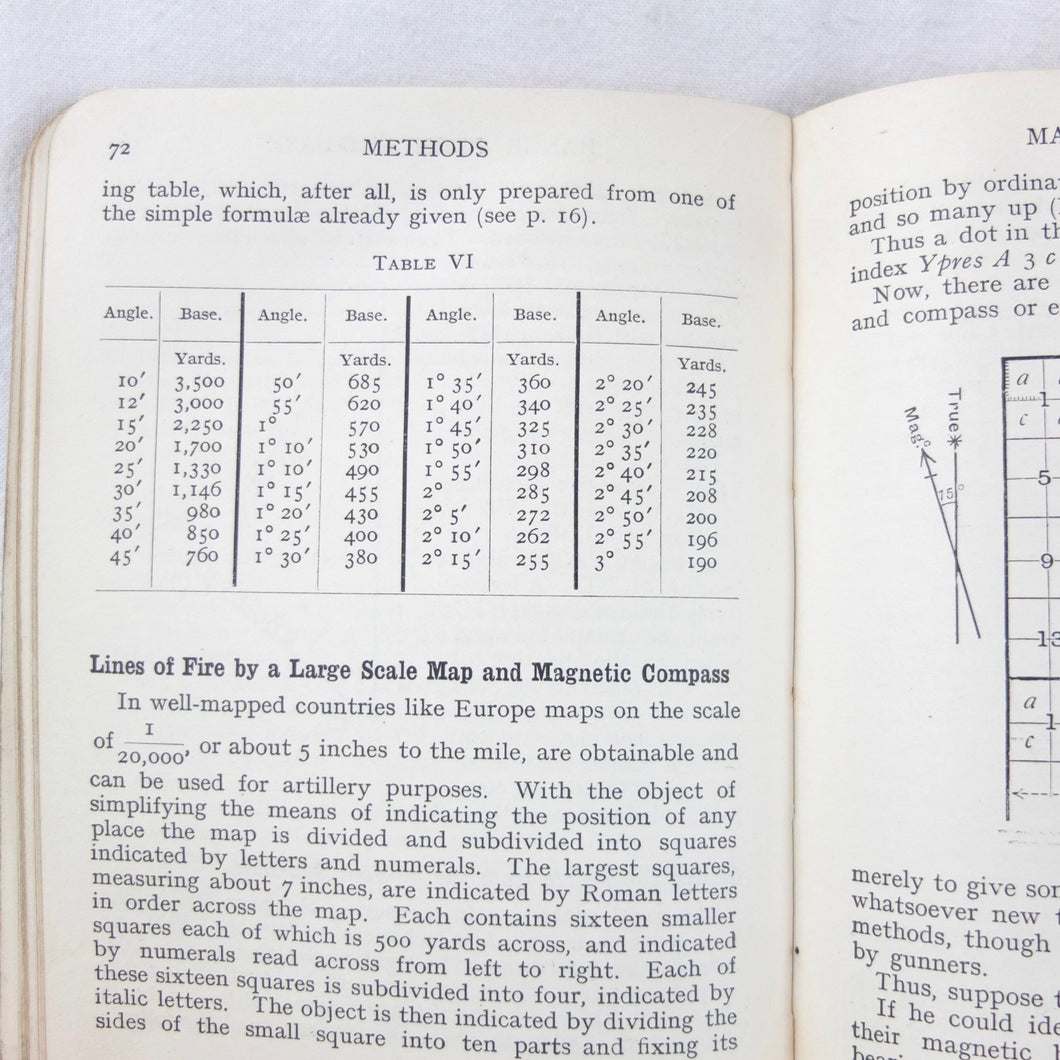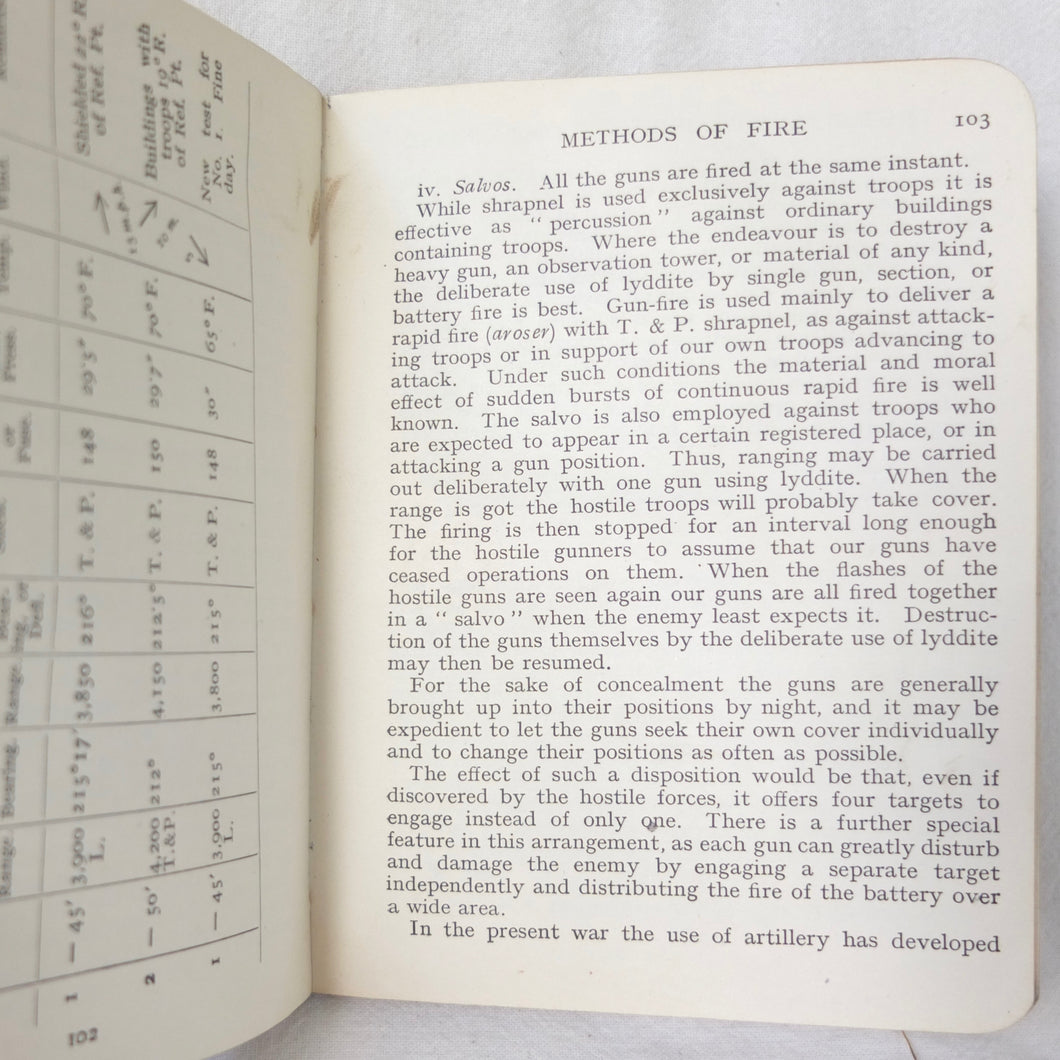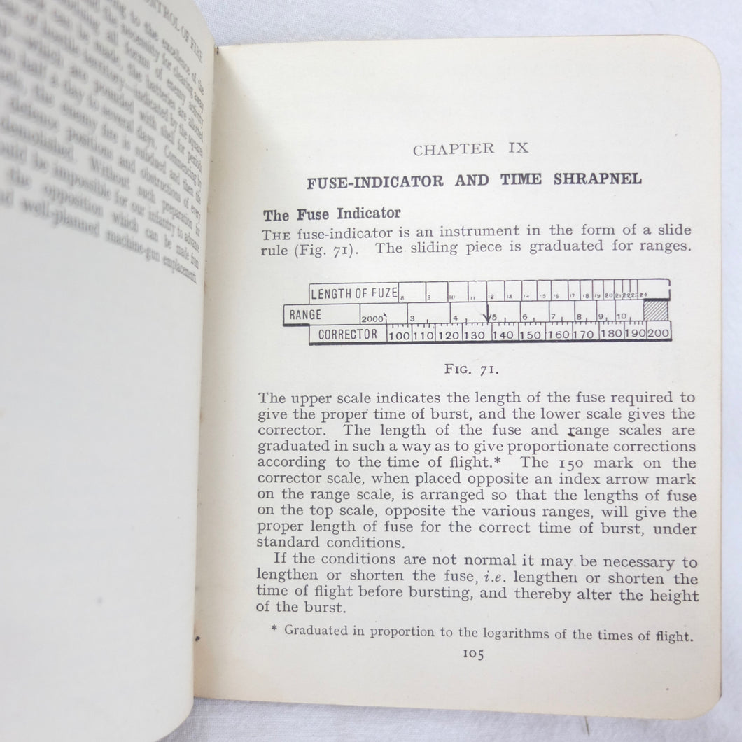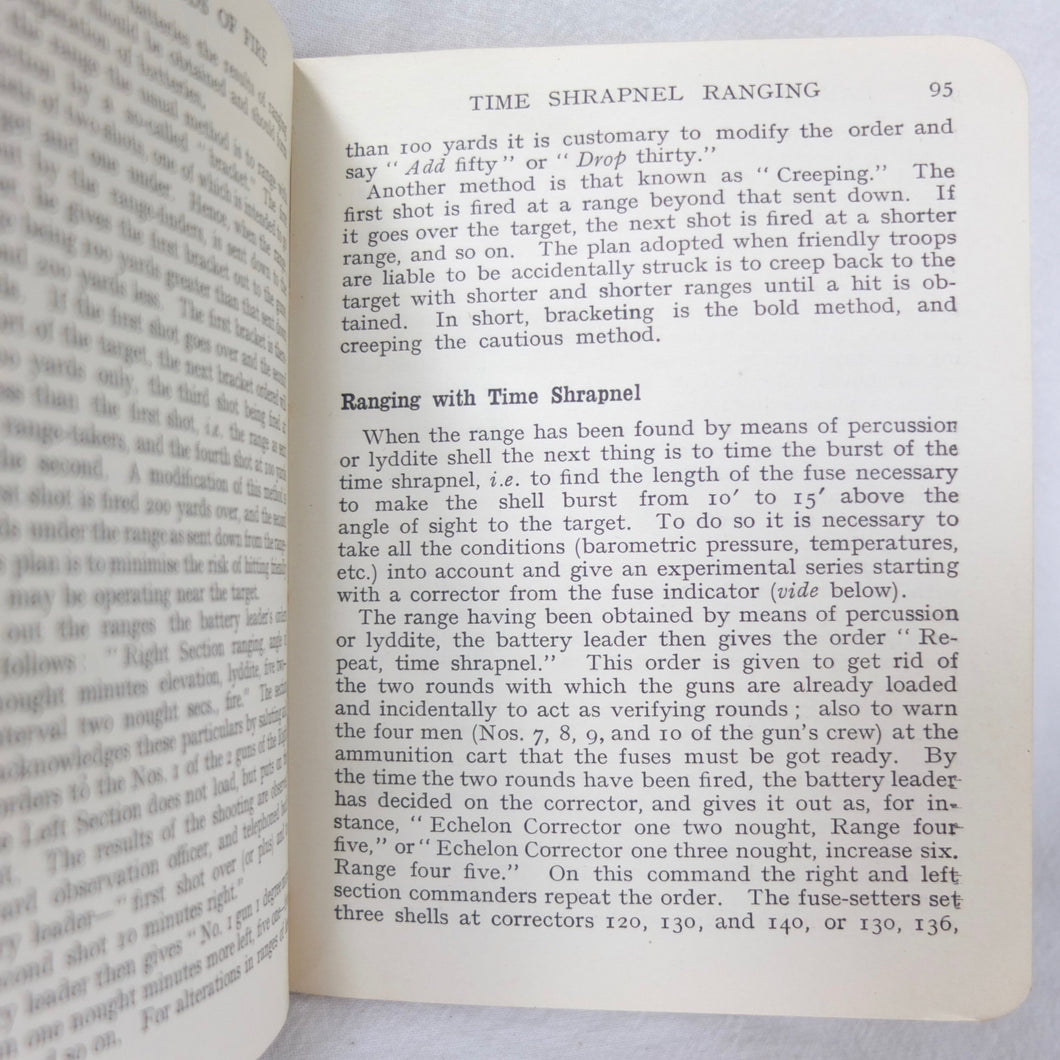 Field Gunnery includes comprehensive details of the effective use of artillery in trench warfare. Covering everything that an artillery officer or battery commander would need to know when bringing his guns into action: from positioning and ranging the guns, to the creeping barrage and the different types of shrapnel shell and fuse that might be used. The book is very well illustrated throughout, with diagrams and line drawings. There are also some interesting advertisements for officers trench equipment, with details of popular brands of officer's kit, ear protection ('Fibrous Plasticine: an absolute necessity for the gunners'), and luminous military watches.