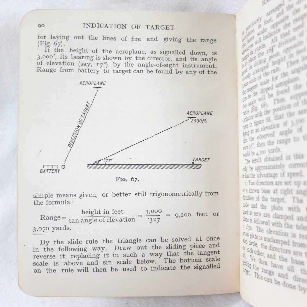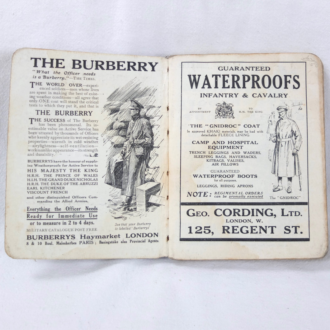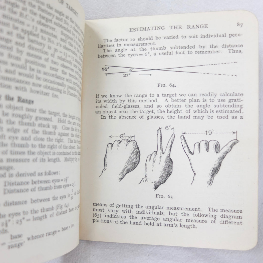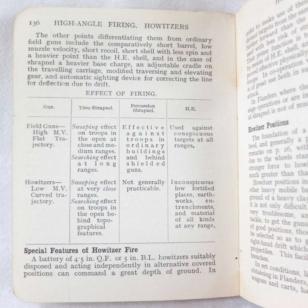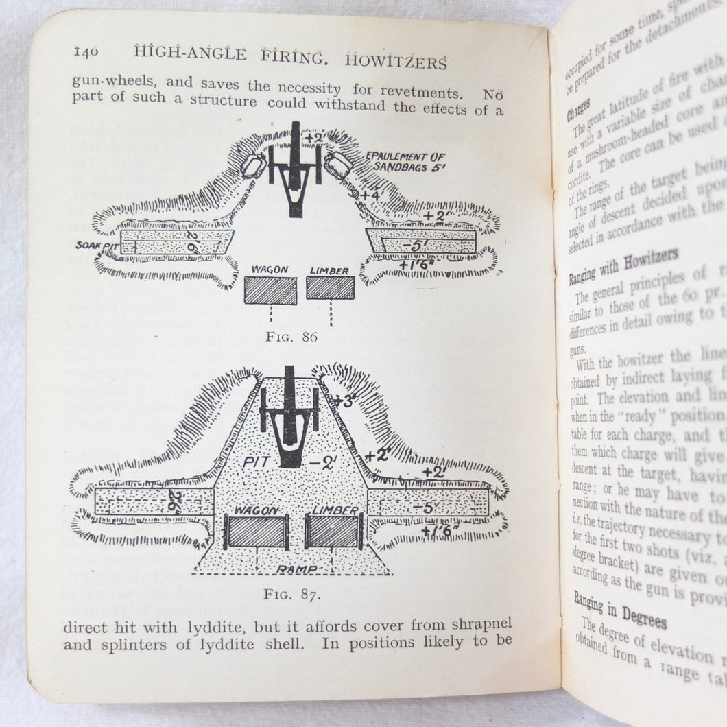 Field Gunnery includes comprehensive details of the effective use of artillery in trench warfare. Covering everything that an artillery officer or battery commander would need to know when bringing his guns into action: from positioning and ranging the guns, to the creeping barrage and the different types of shrapnel shell and fuse that might be used. The book is very well illustrated throughout, with diagrams and line drawings. There are also some interesting advertisements for officers trench equipment, with details of popular brands of officer's kit, ear protection ('Fibrous Plasticine: an absolute necessity for the gunners'), and luminous military watches.