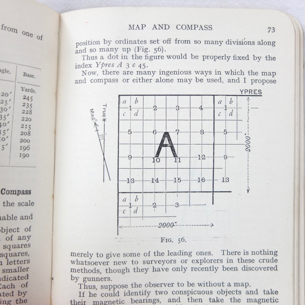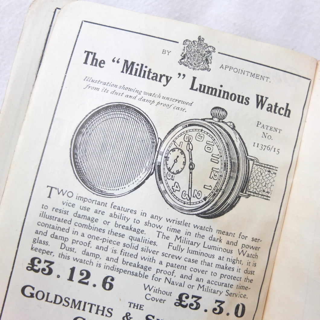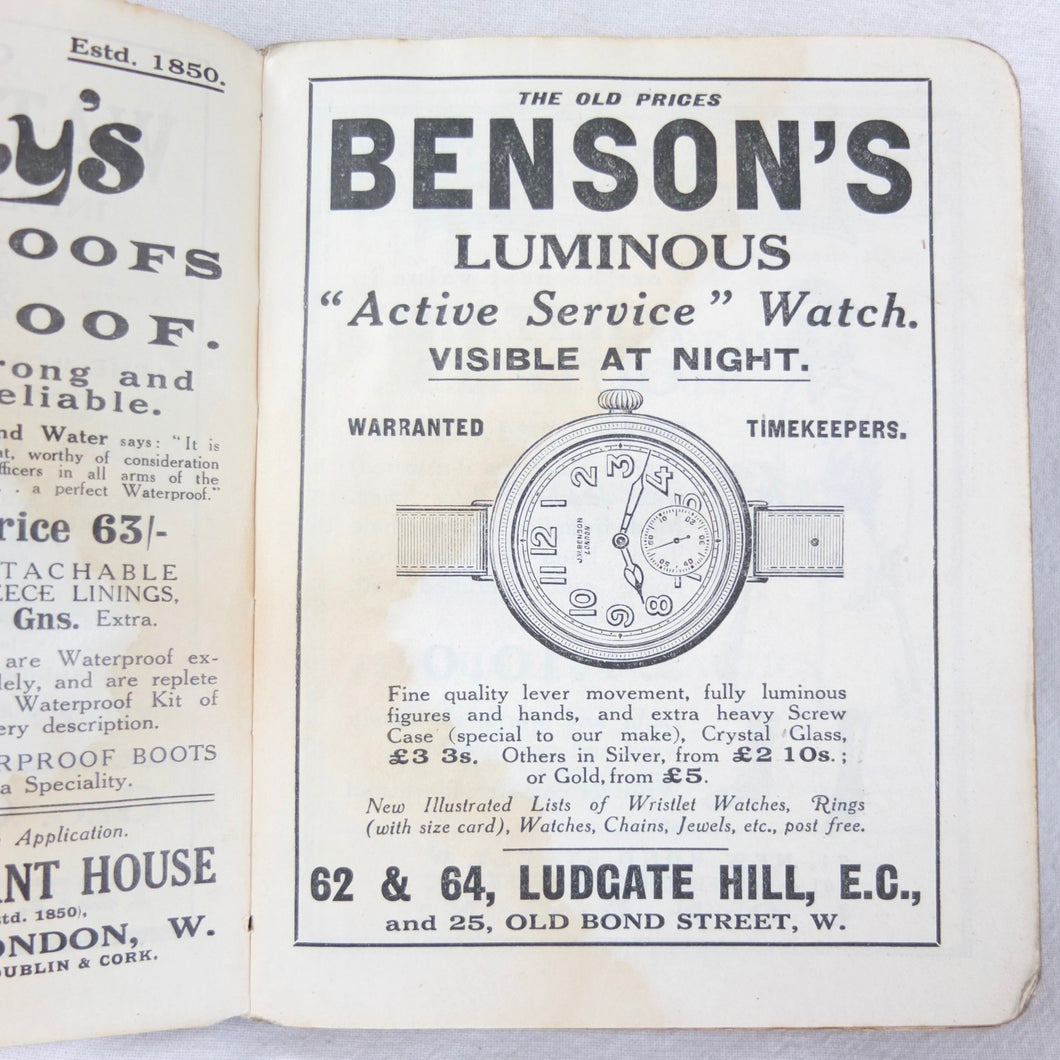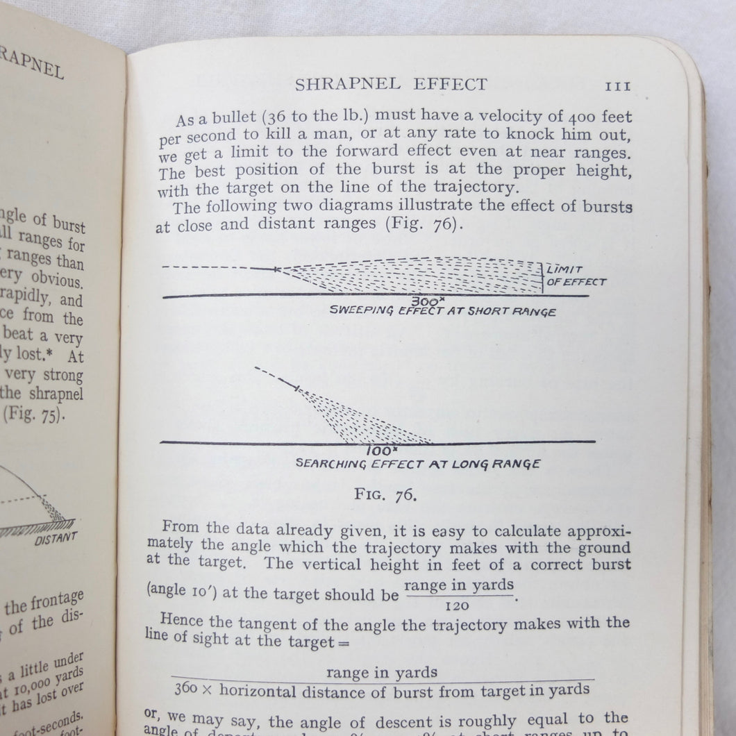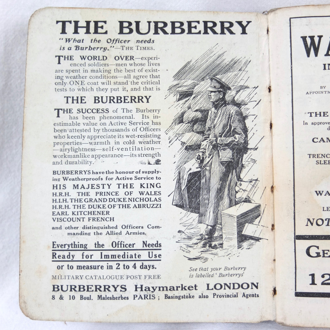 Field Gunnery includes comprehensive details of the effective use of artillery in trench warfare. Covering everything that an artillery officer or battery commander would need to know when bringing his guns into action: from positioning and ranging the guns, to the creeping barrage and the different types of shrapnel shell and fuse that might be used. The book is very well illustrated throughout, with diagrams and line drawings. There are also some interesting advertisements for officers trench equipment, with details of popular brands of officer's kit, ear protection ('Fibrous Plasticine: an absolute necessity for the gunners'), and luminous military watches.