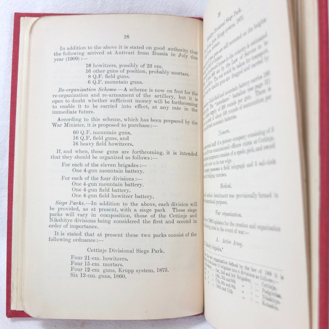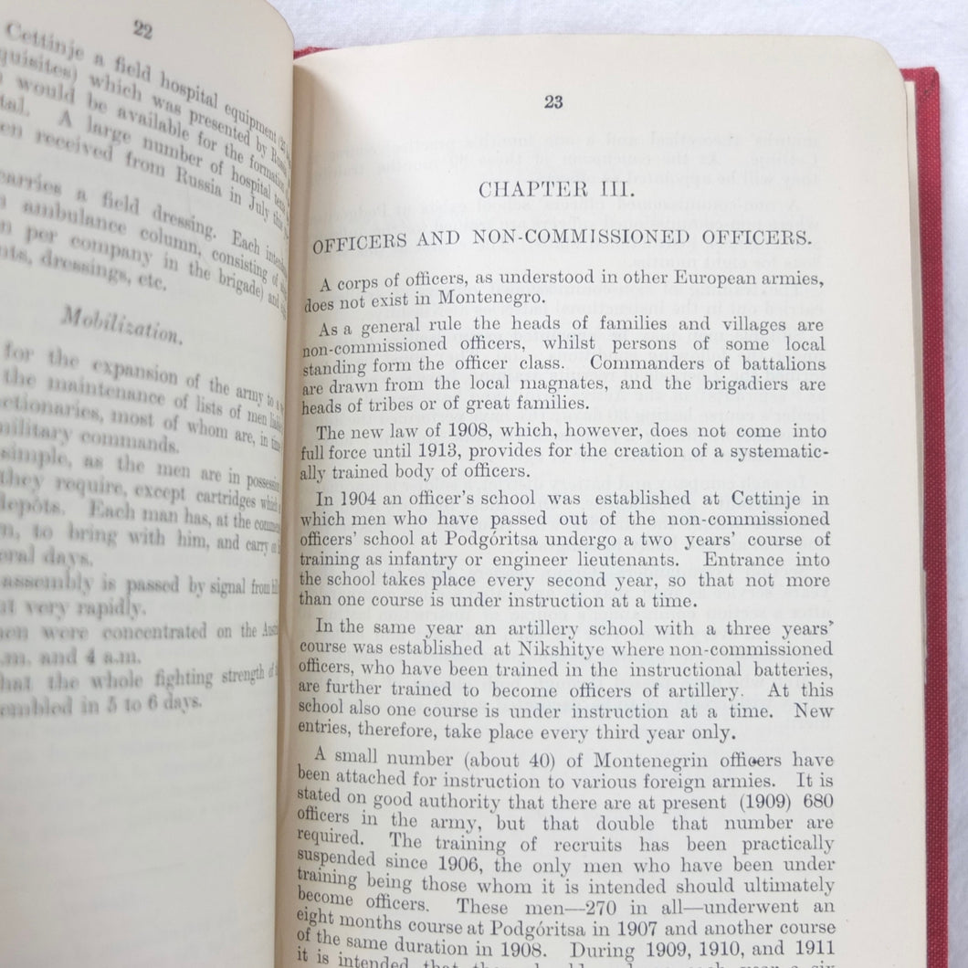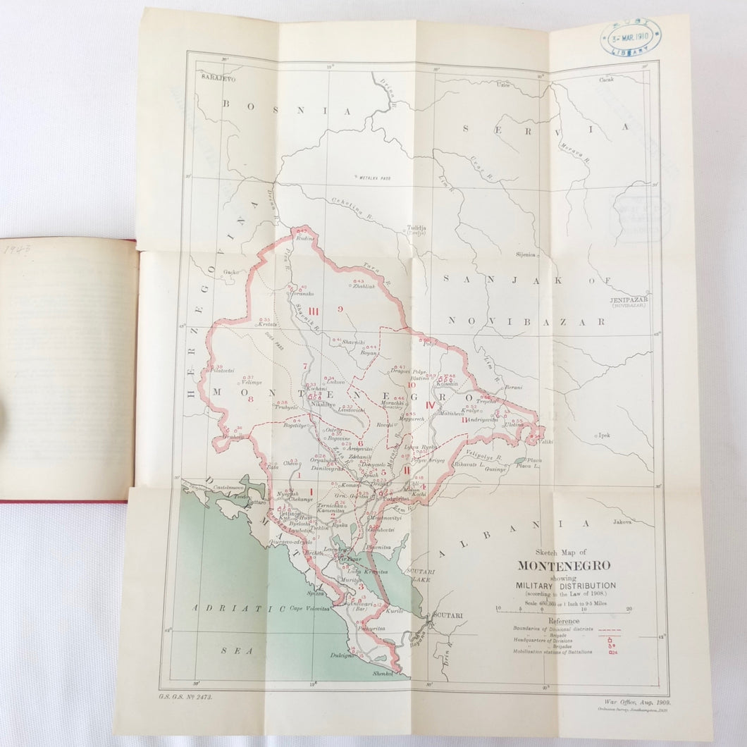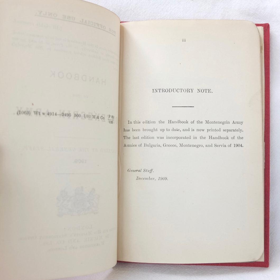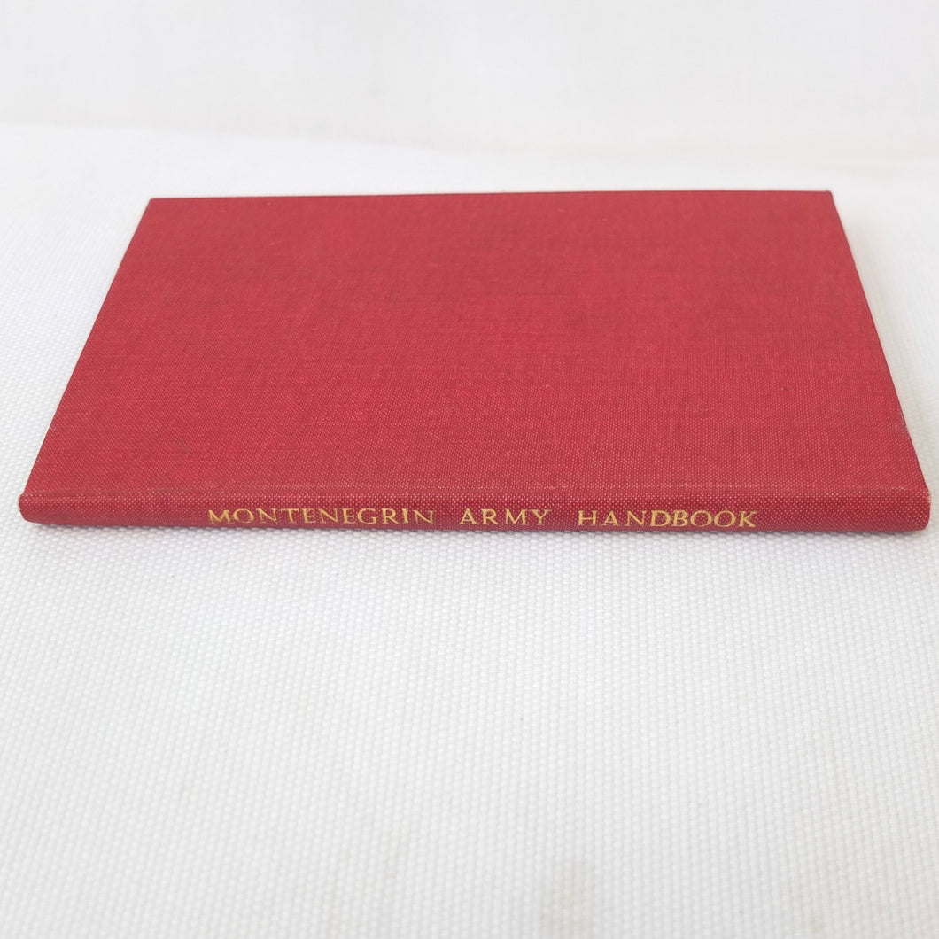 A very rare, original, WW1 era British War Office Handbook of the Montenegrin Army, published in December 1909. Produced at a time of great turmoil in the Balkans - the Balkan Wars of 1912-13, the events leading up to the outbreak of WW1, and the assasination of Archduke Francis Ferdinand in Sarajevo in 1914 - this handbook would have been very useful to those members of the British government and military forces planning for war in the years leading up to 1914. Subjects covered include: history, government and population of Montenegro, composition of the army, conditions of service, training, general organization, supreme command, Ministry of War, infantry, armament, ammunition, cavalry, scouts, artillery, pioneers, medical services, officers, NCOs, badges of rank, uniforms, and fortifications. The handbook includes a large fold-ot War Office map of Montenegro.