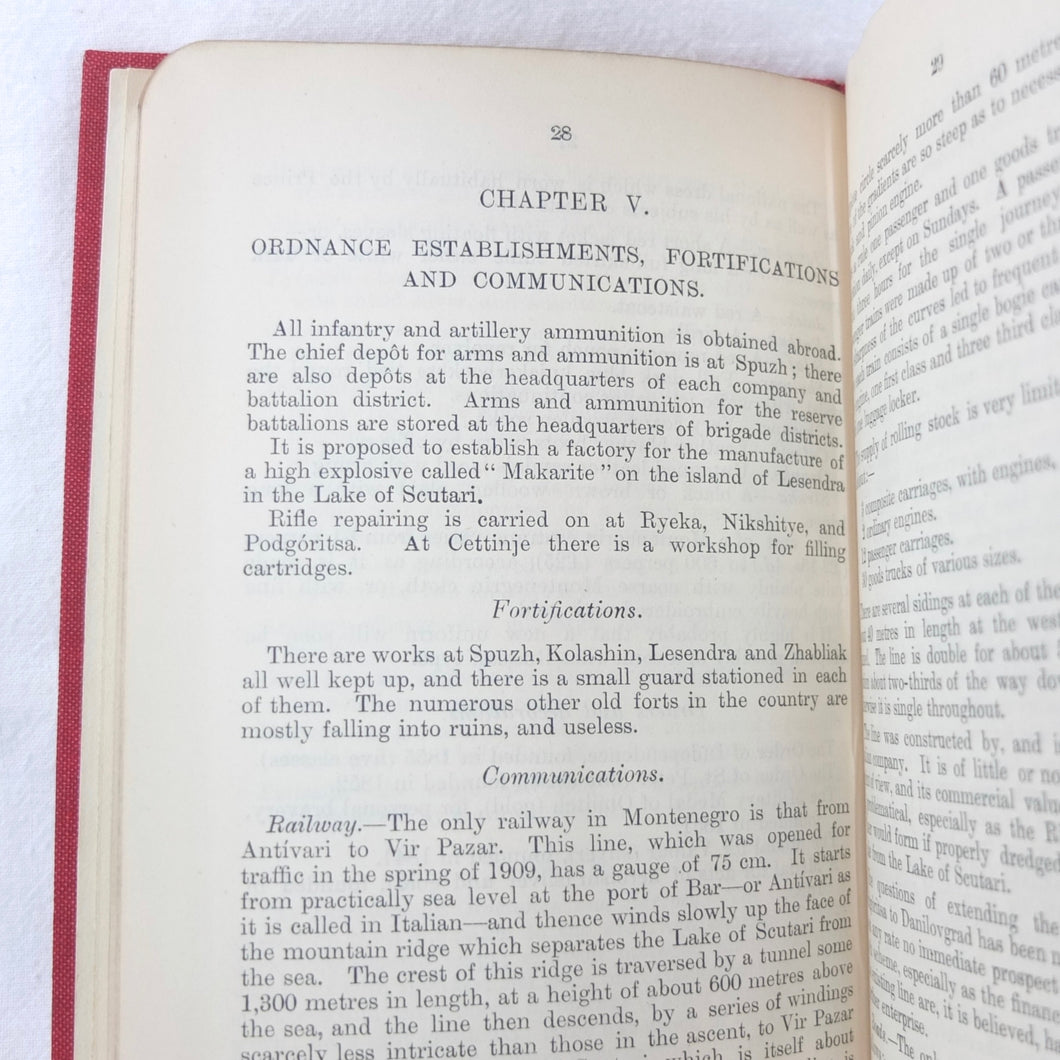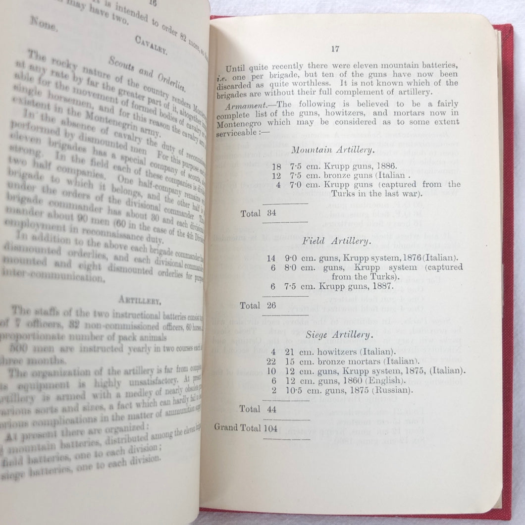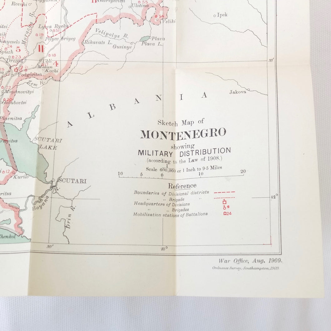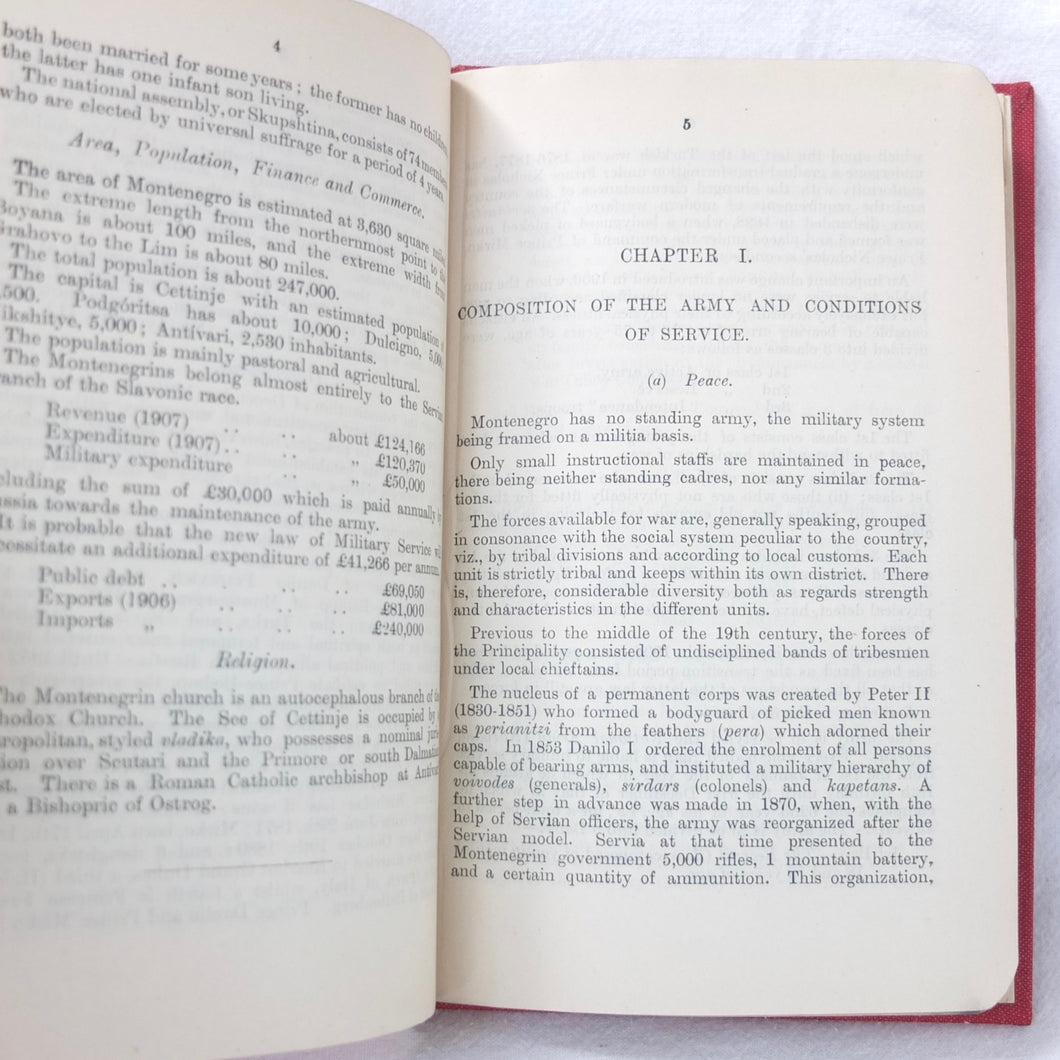A very rare, original, WW1 era British War Office Handbook of the Montenegrin Army, published in December 1909. Produced at a time of great turmoil in the Balkans - the Balkan Wars of 1912-13, the events leading up to the outbreak of WW1, and the assasination of Archduke Francis Ferdinand in Sarajevo in 1914 - this handbook would have been very useful to those members of the British government and military forces planning for war in the years leading up to 1914. Subjects covered include: history, government and population of Montenegro, composition of the army, conditions of service, training, general organization, supreme command, Ministry of War, infantry, armament, ammunition, cavalry, scouts, artillery, pioneers, medical services, officers, NCOs, badges of rank, uniforms, and fortifications. The handbook includes a large fold-ot War Office map of Montenegro.