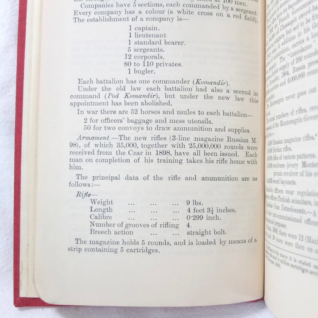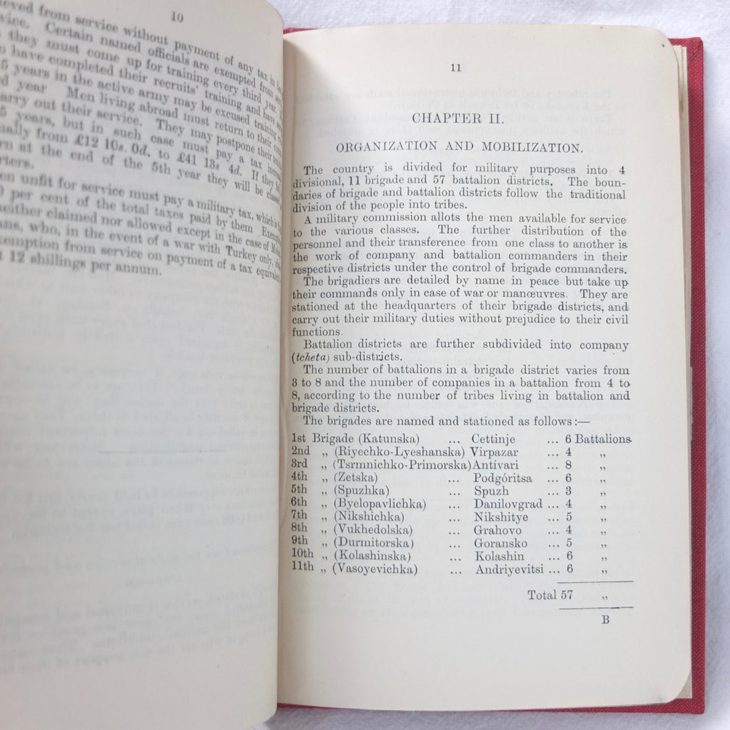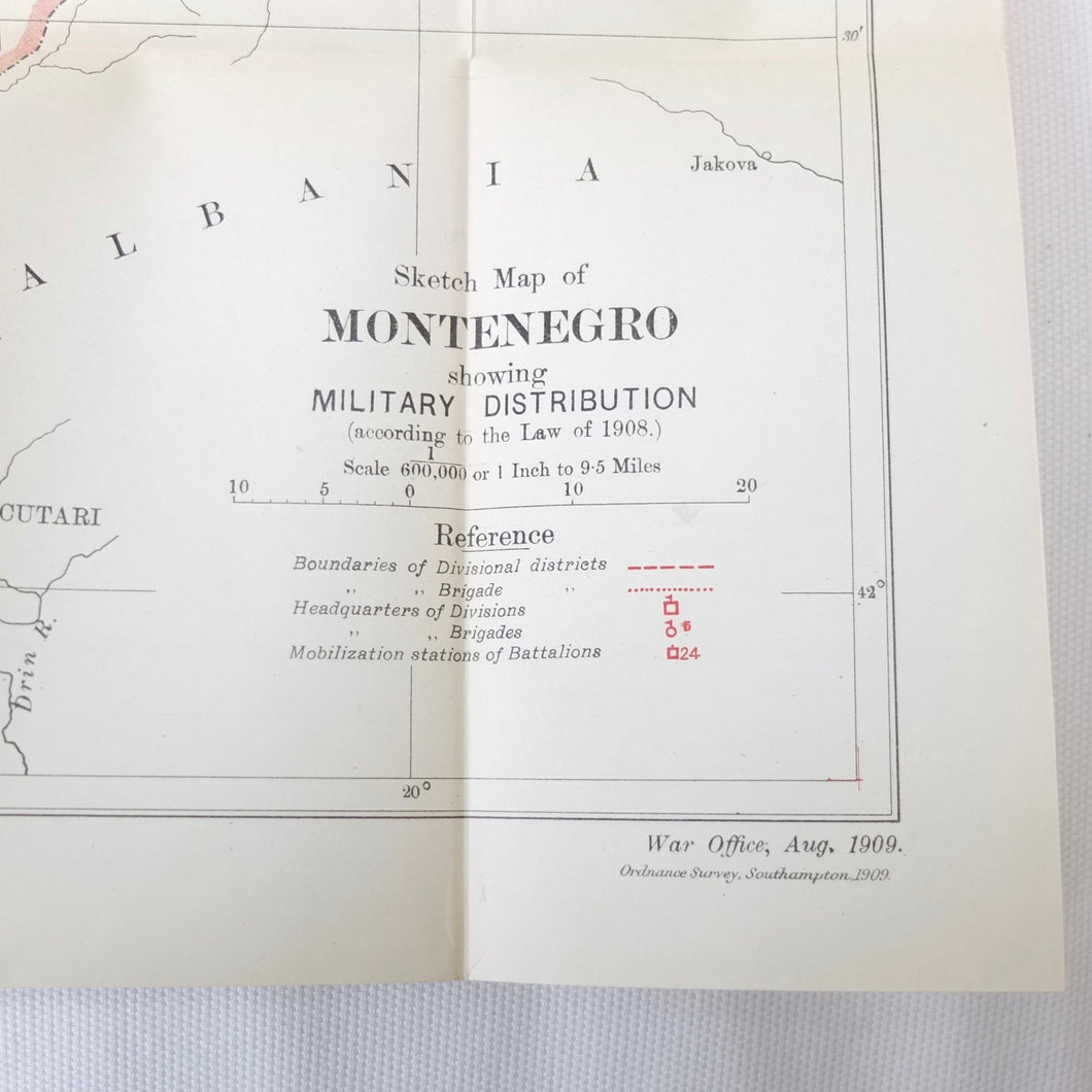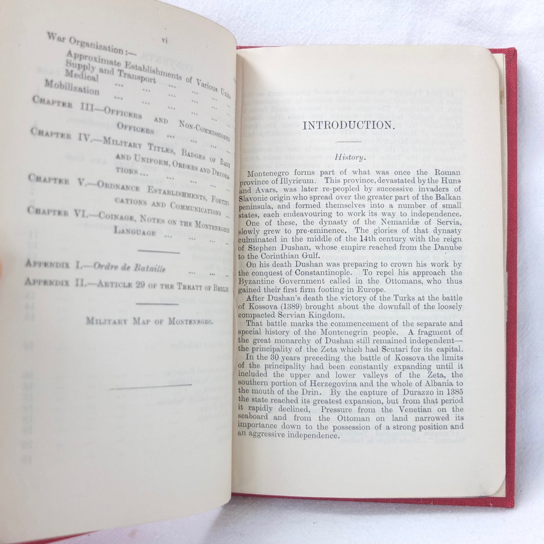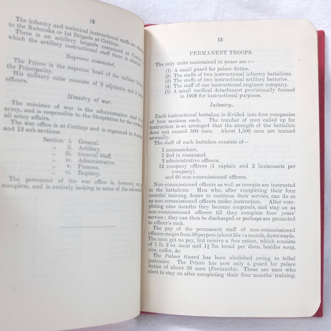 A very rare, original, WW1 era British War Office Handbook of the Montenegrin Army, published in December 1909. Produced at a time of great turmoil in the Balkans - the Balkan Wars of 1912-13, the events leading up to the outbreak of WW1, and the assasination of Archduke Francis Ferdinand in Sarajevo in 1914 - this handbook would have been very useful to those members of the British government and military forces planning for war in the years leading up to 1914. Subjects covered include: history, government and population of Montenegro, composition of the army, conditions of service, training, general organization, supreme command, Ministry of War, infantry, armament, ammunition, cavalry, scouts, artillery, pioneers, medical services, officers, NCOs, badges of rank, uniforms, and fortifications. The handbook includes a large fold-ot War Office map of Montenegro.