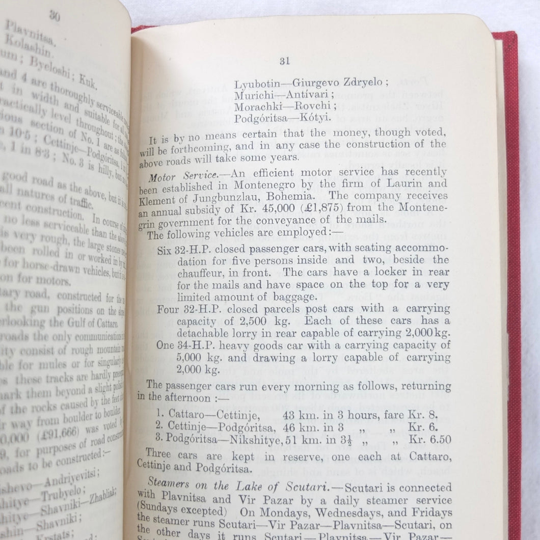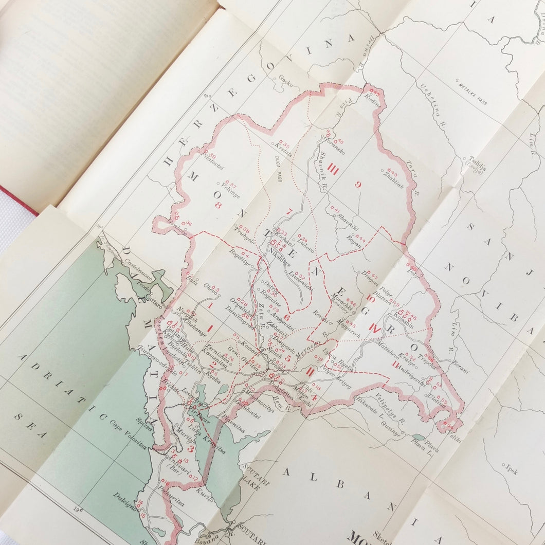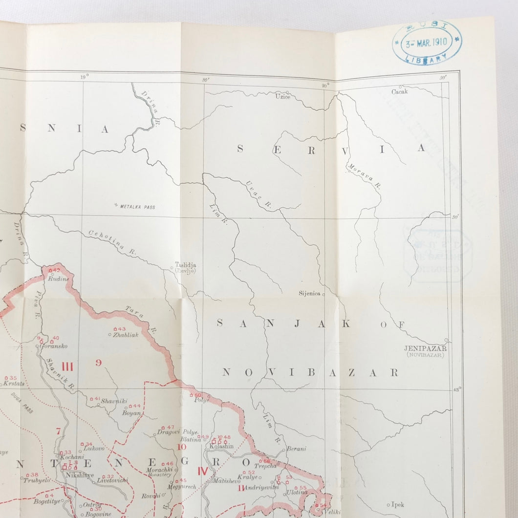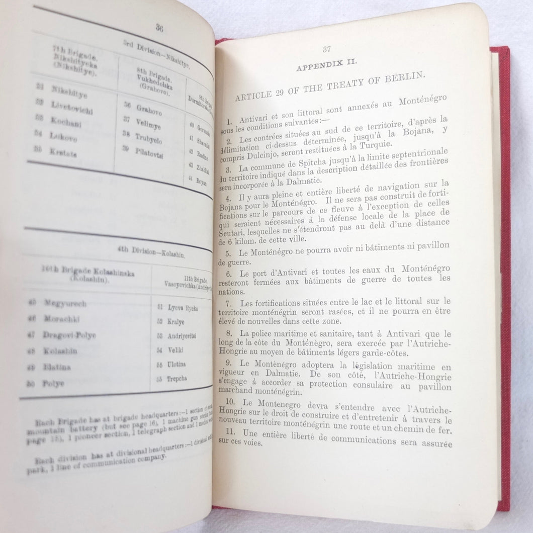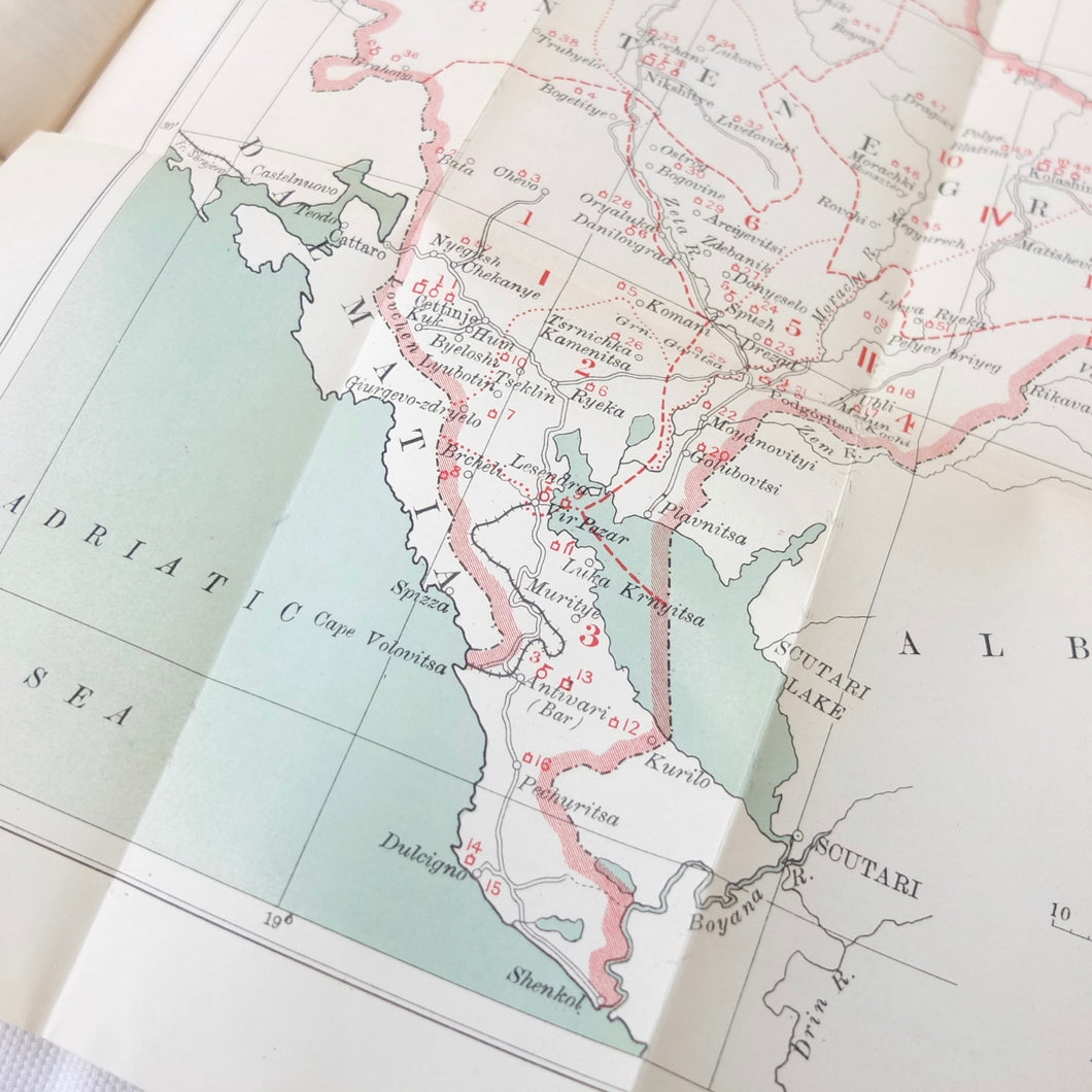 A very rare, original, WW1 era British War Office Handbook of the Montenegrin Army, published in December 1909. Produced at a time of great turmoil in the Balkans - the Balkan Wars of 1912-13, the events leading up to the outbreak of WW1, and the assasination of Archduke Francis Ferdinand in Sarajevo in 1914 - this handbook would have been very useful to those members of the British government and military forces planning for war in the years leading up to 1914. Subjects covered include: history, government and population of Montenegro, composition of the army, conditions of service, training, general organization, supreme command, Ministry of War, infantry, armament, ammunition, cavalry, scouts, artillery, pioneers, medical services, officers, NCOs, badges of rank, uniforms, and fortifications. The handbook includes a large fold-ot War Office map of Montenegro.
