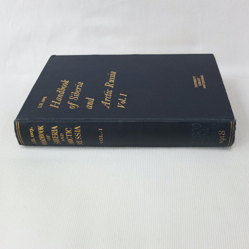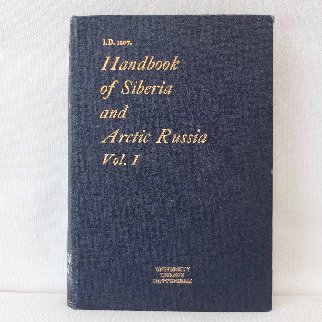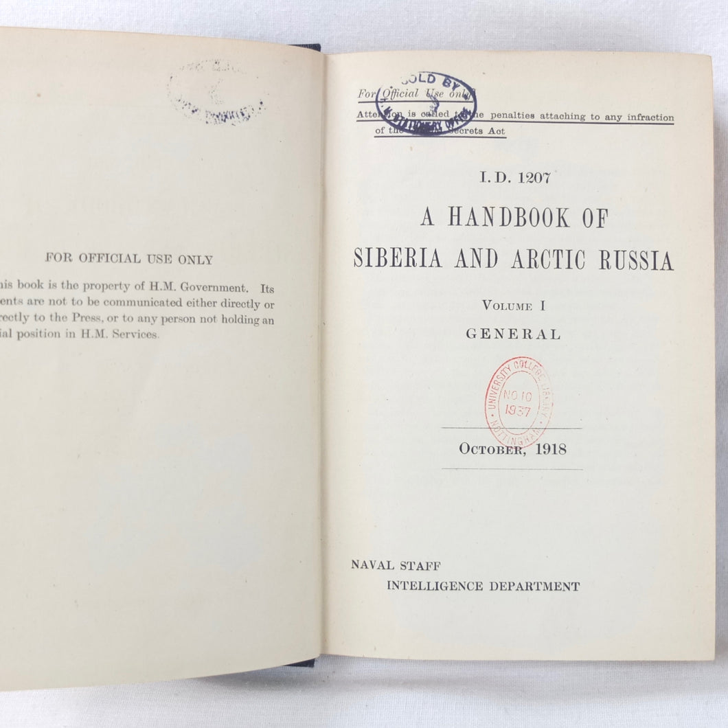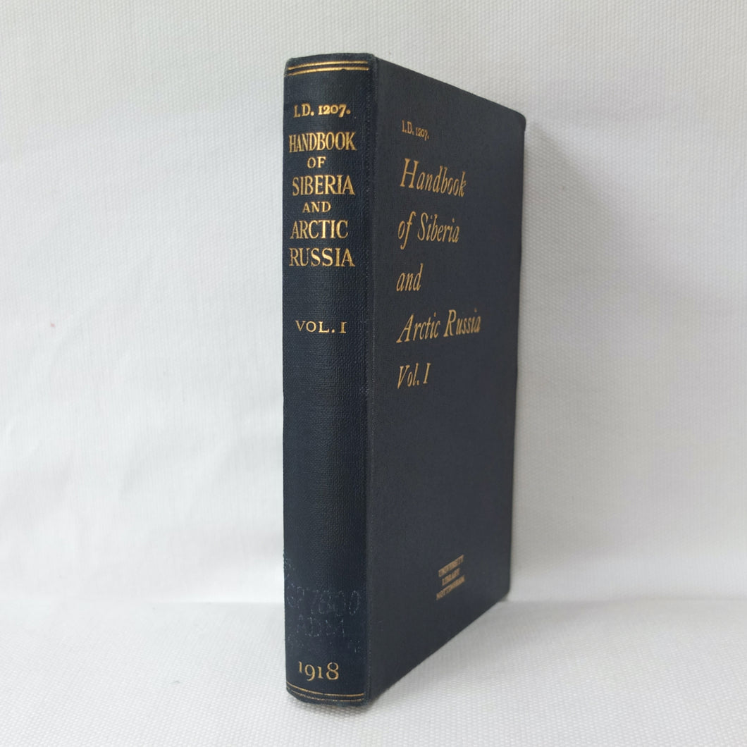 A very rare, original, 1918 edition of volume one of the British Naval Staff Intelligence Department Handbook of Siberia and Arctic Russia. Classified as secret, and with a very restricted circulation, this handbook was part of a three volume set produced during WW1 for official use only. Its use was covered by the Official Secrets Act. It is a very detailed and comprehensive survey of all that was known at the time about the topography, peoples, customs, climate, religions, railways, transport, agriculture, natural resources, and industry of Siberia and Arctic Russia in 1918. It comes complete with the large coloured folding map of Siberia (53cm x 66cm) in a pocket at the rear. An invaluable reference work for anyone interested in this region during the First World War.
