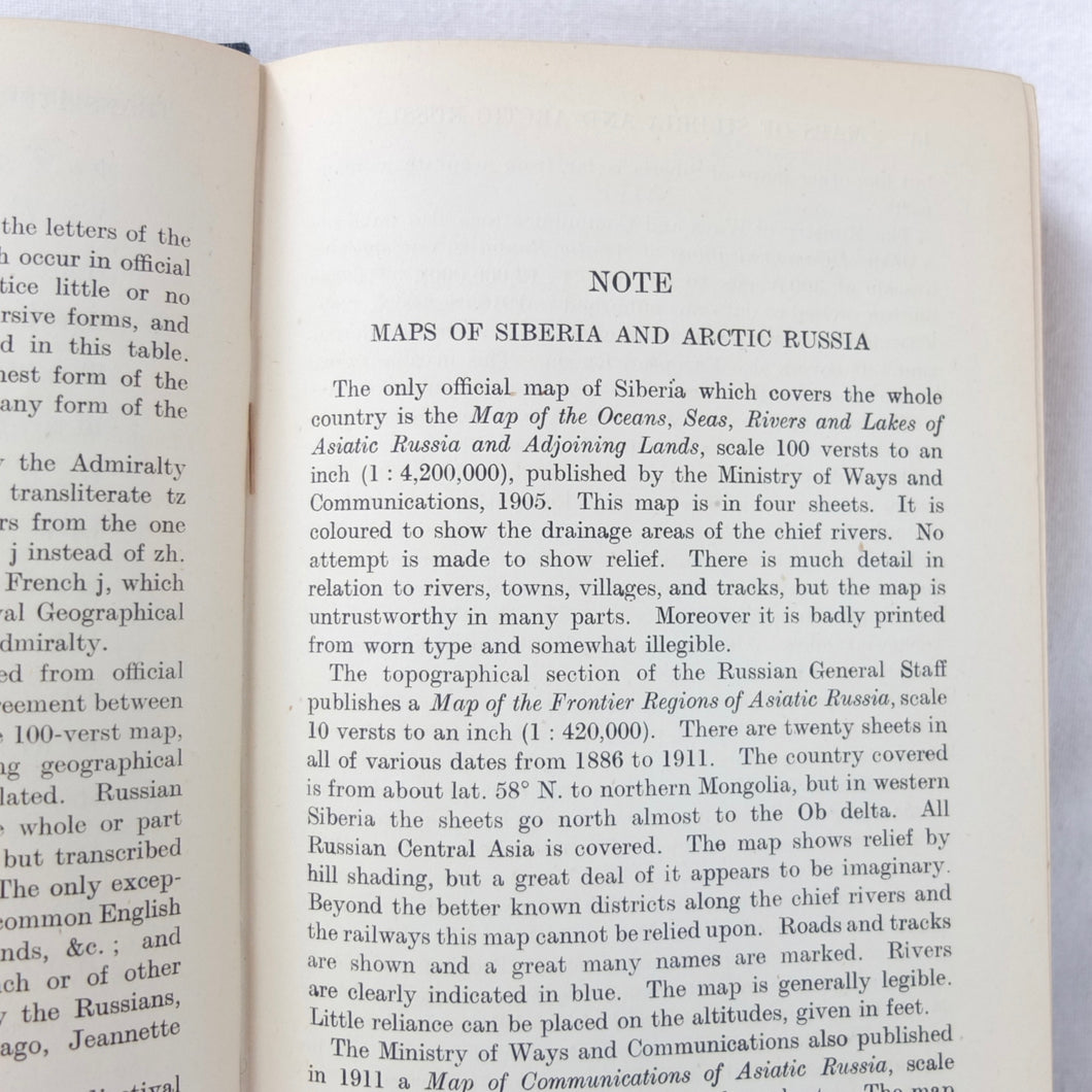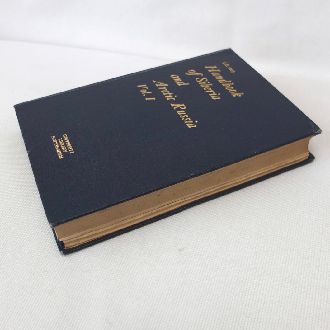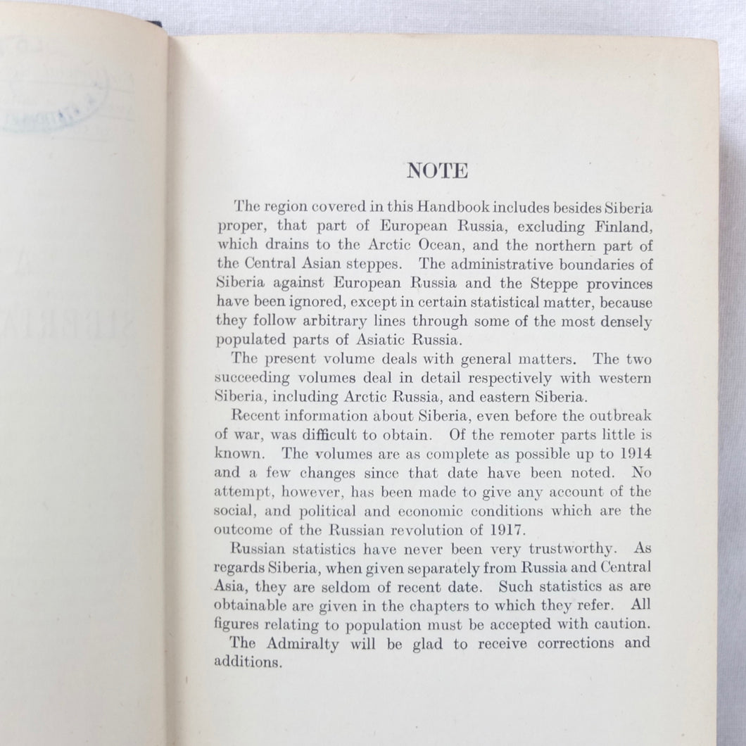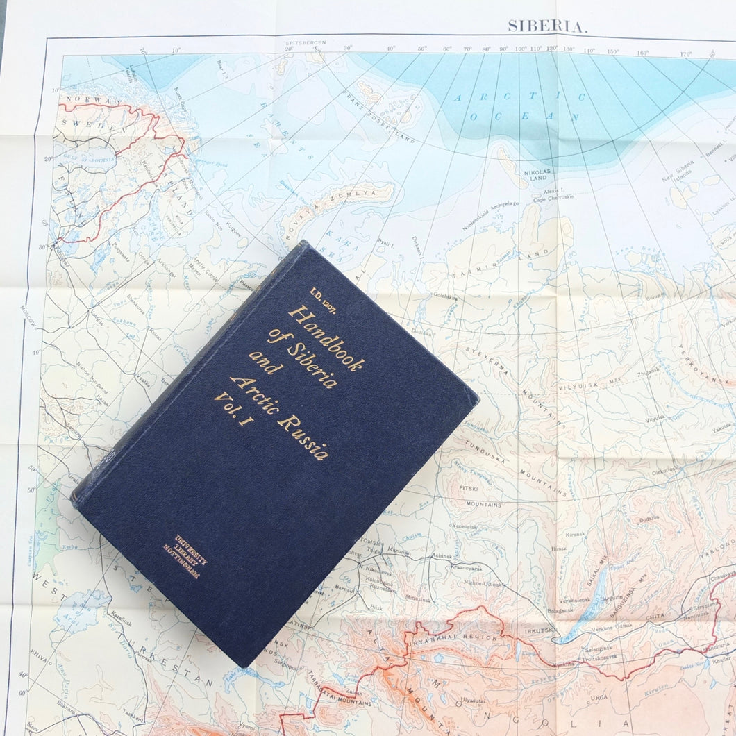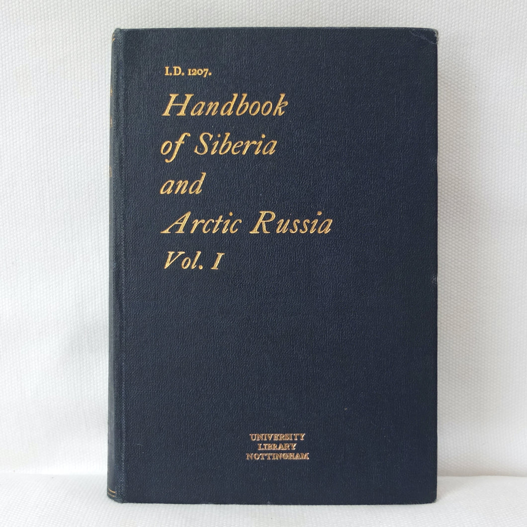 A very rare, original, 1918 edition of volume one of the British Naval Staff Intelligence Department Handbook of Siberia and Arctic Russia. Classified as secret, and with a very restricted circulation, this handbook was part of a three volume set produced during WW1 for official use only. Its use was covered by the Official Secrets Act. It is a very detailed and comprehensive survey of all that was known at the time about the topography, peoples, customs, climate, religions, railways, transport, agriculture, natural resources, and industry of Siberia and Arctic Russia in 1918. It comes complete with the large coloured folding map of Siberia (53cm x 66cm) in a pocket at the rear. An invaluable reference work for anyone interested in this region during the First World War.