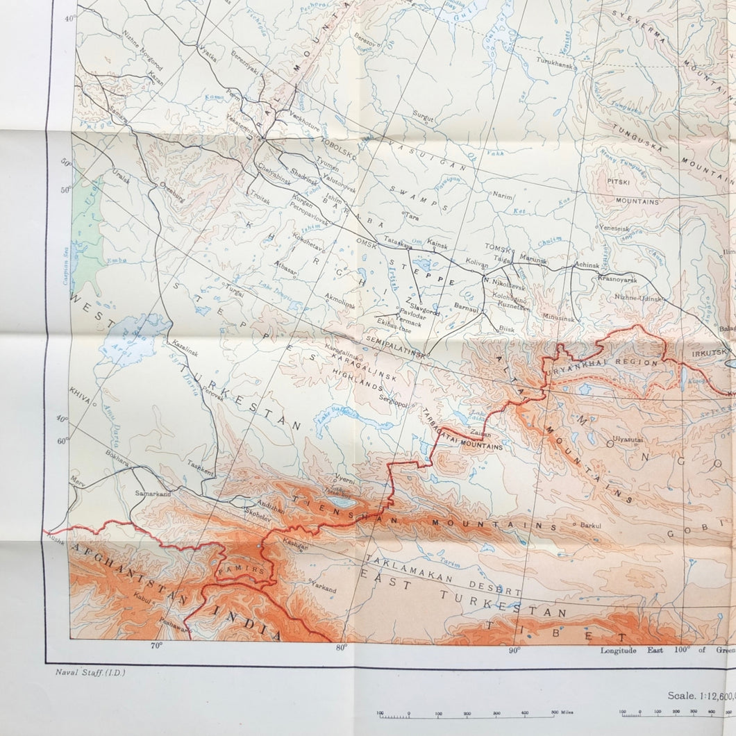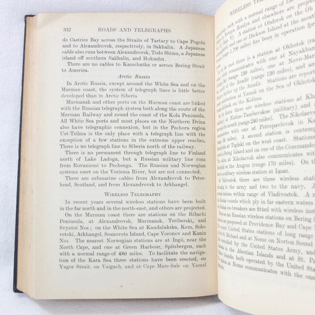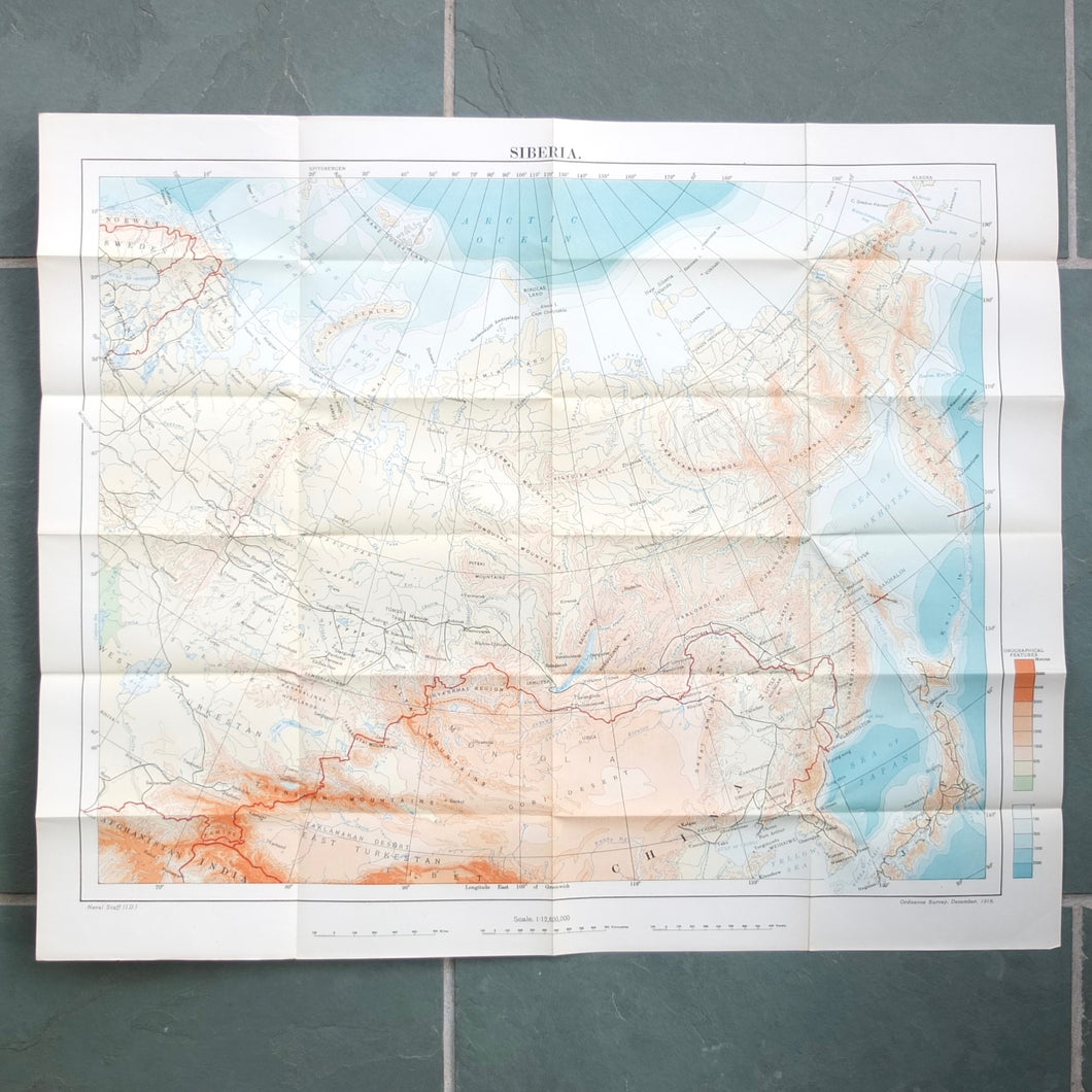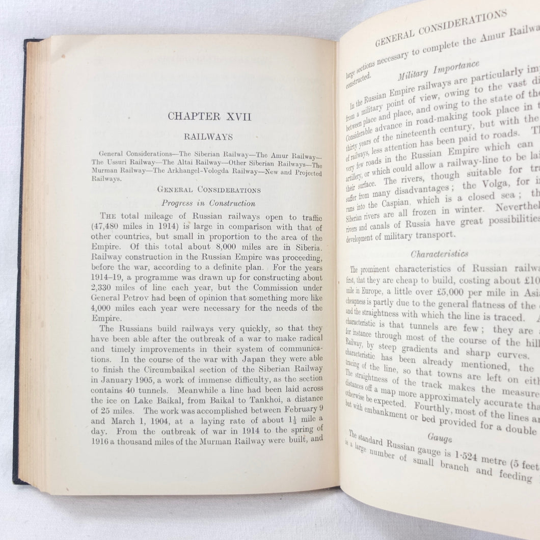 A very rare, original, 1918 edition of volume one of the British Naval Staff Intelligence Department Handbook of Siberia and Arctic Russia. Classified as secret, and with a very restricted circulation, this handbook was part of a three volume set produced during WW1 for official use only. Its use was covered by the Official Secrets Act. It is a very detailed and comprehensive survey of all that was known at the time about the topography, peoples, customs, climate, religions, railways, transport, agriculture, natural resources, and industry of Siberia and Arctic Russia in 1918. It comes complete with the large coloured folding map of Siberia (53cm x 66cm) in a pocket at the rear. An invaluable reference work for anyone interested in this region during the First World War.