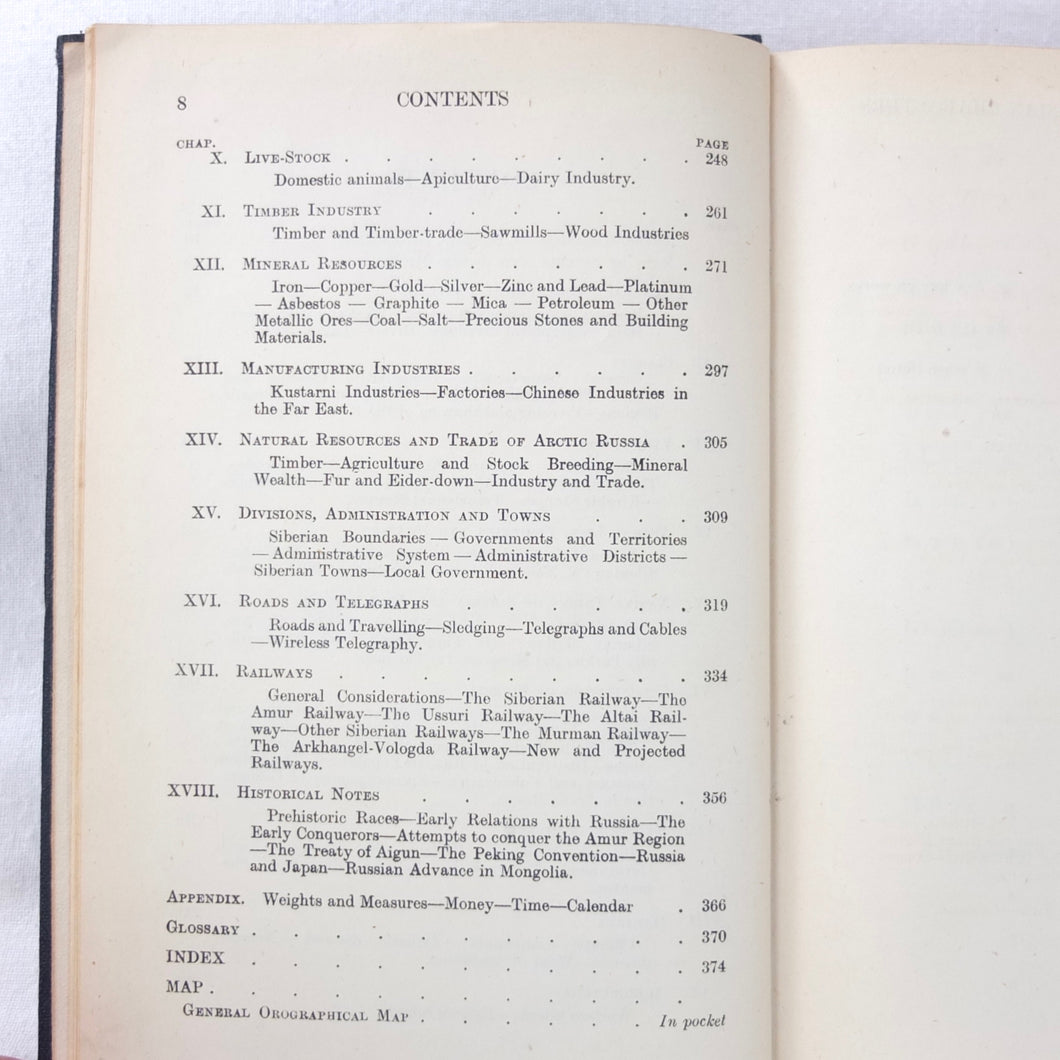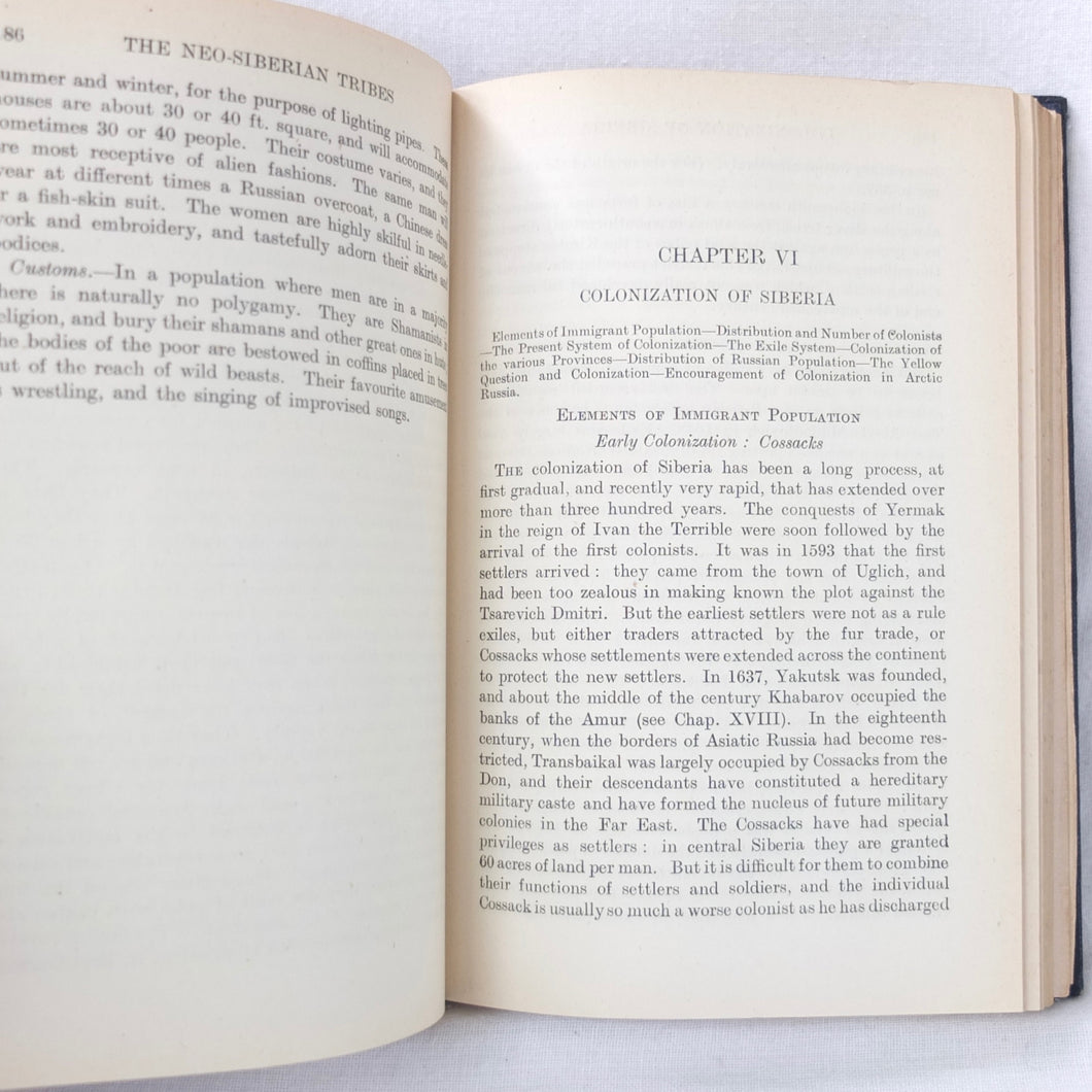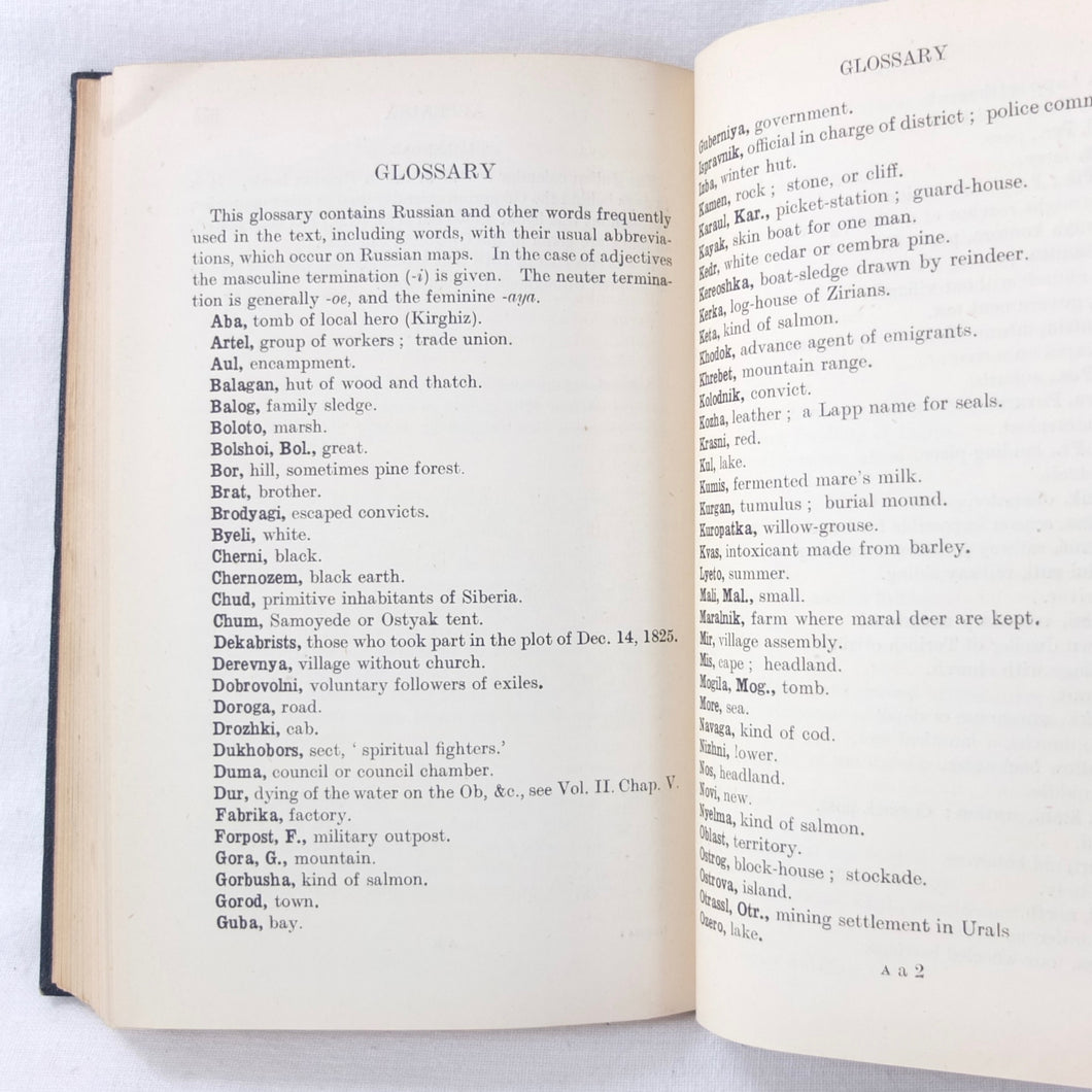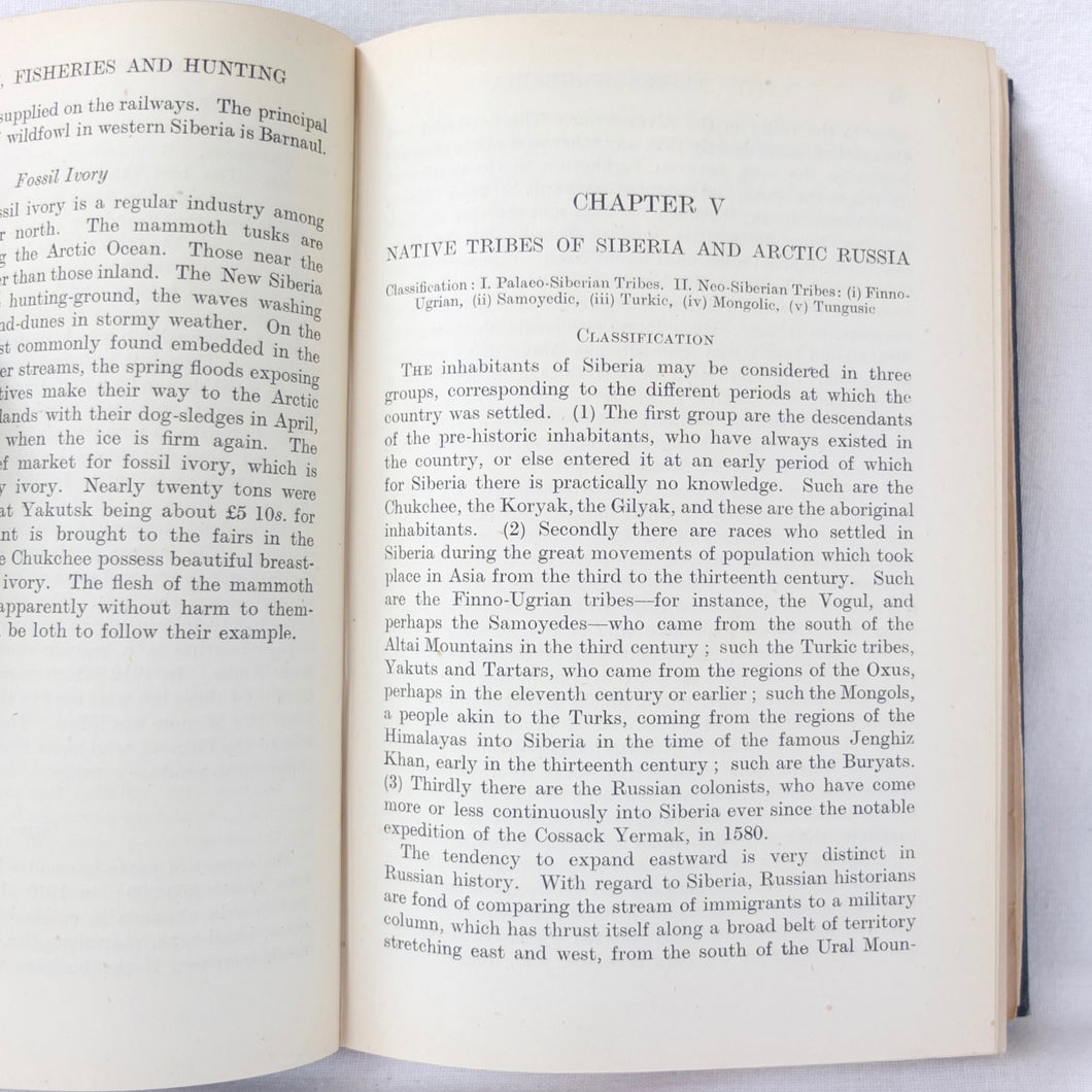 In very good condition. The boards are in very good condition, with minor signs of wear, the remains of an index number at the bottom of the spine, and a small gilt library stamp to the front board. The binding and hinges are very good and secure. The text is in very good condition, with university library ‘Withdrawn’ ink stamps and labels to the front endpapers and title page. The map of Siberia in the pocket at the rear is in excellent condition.