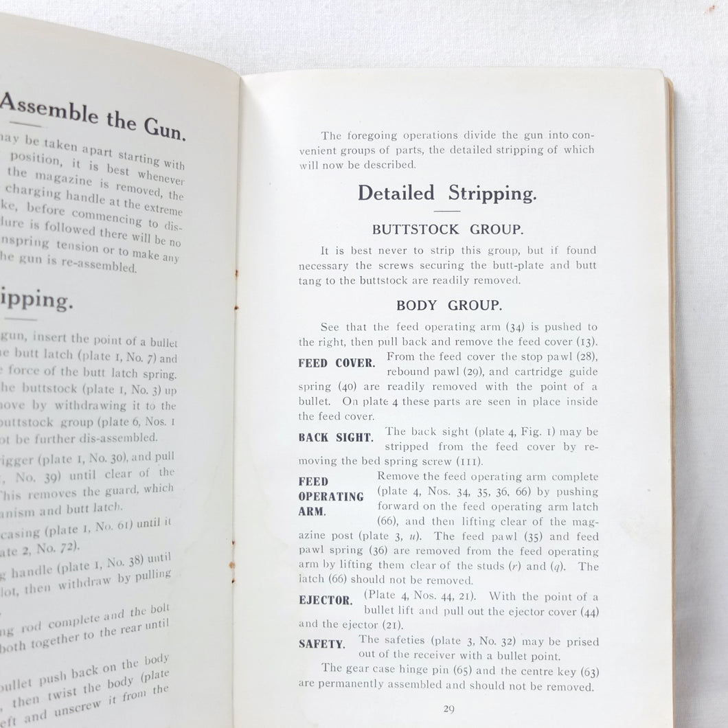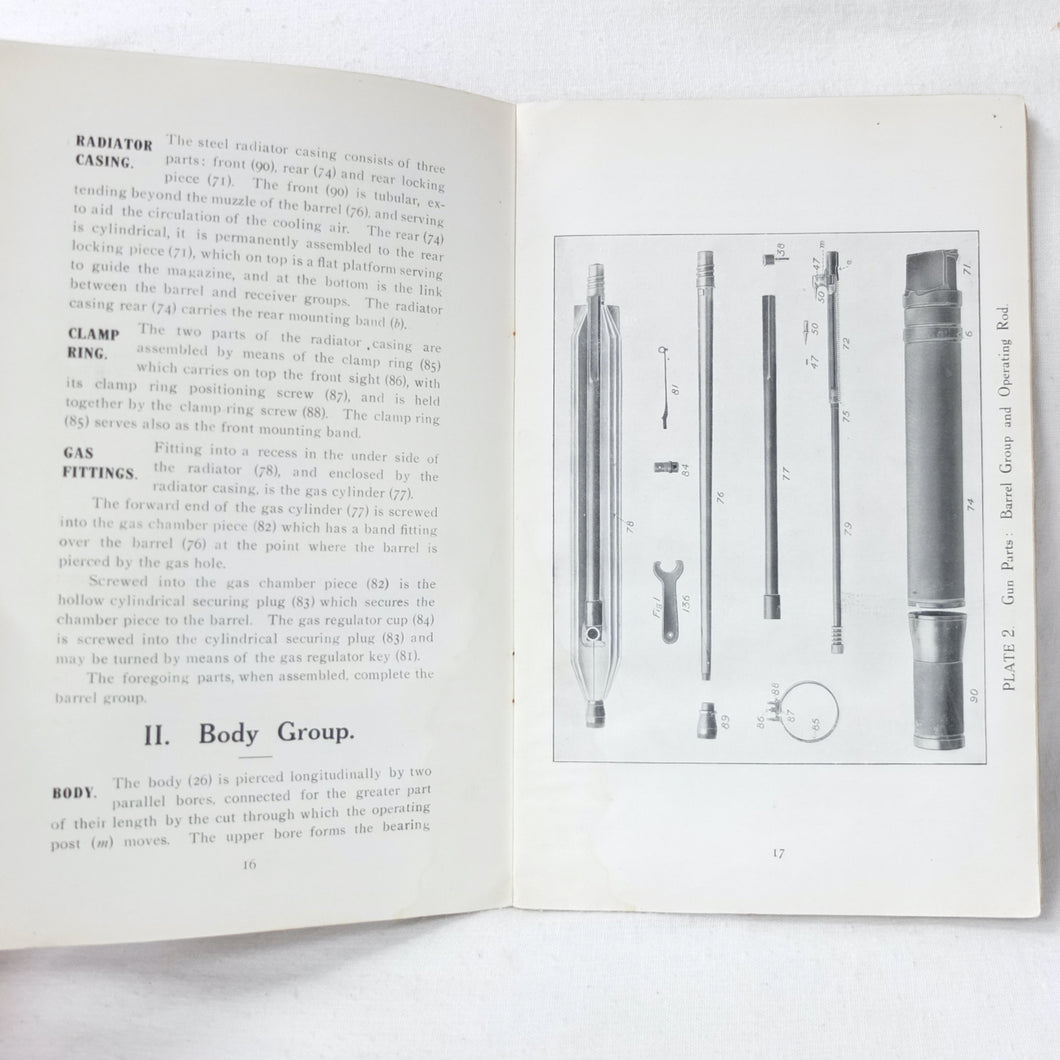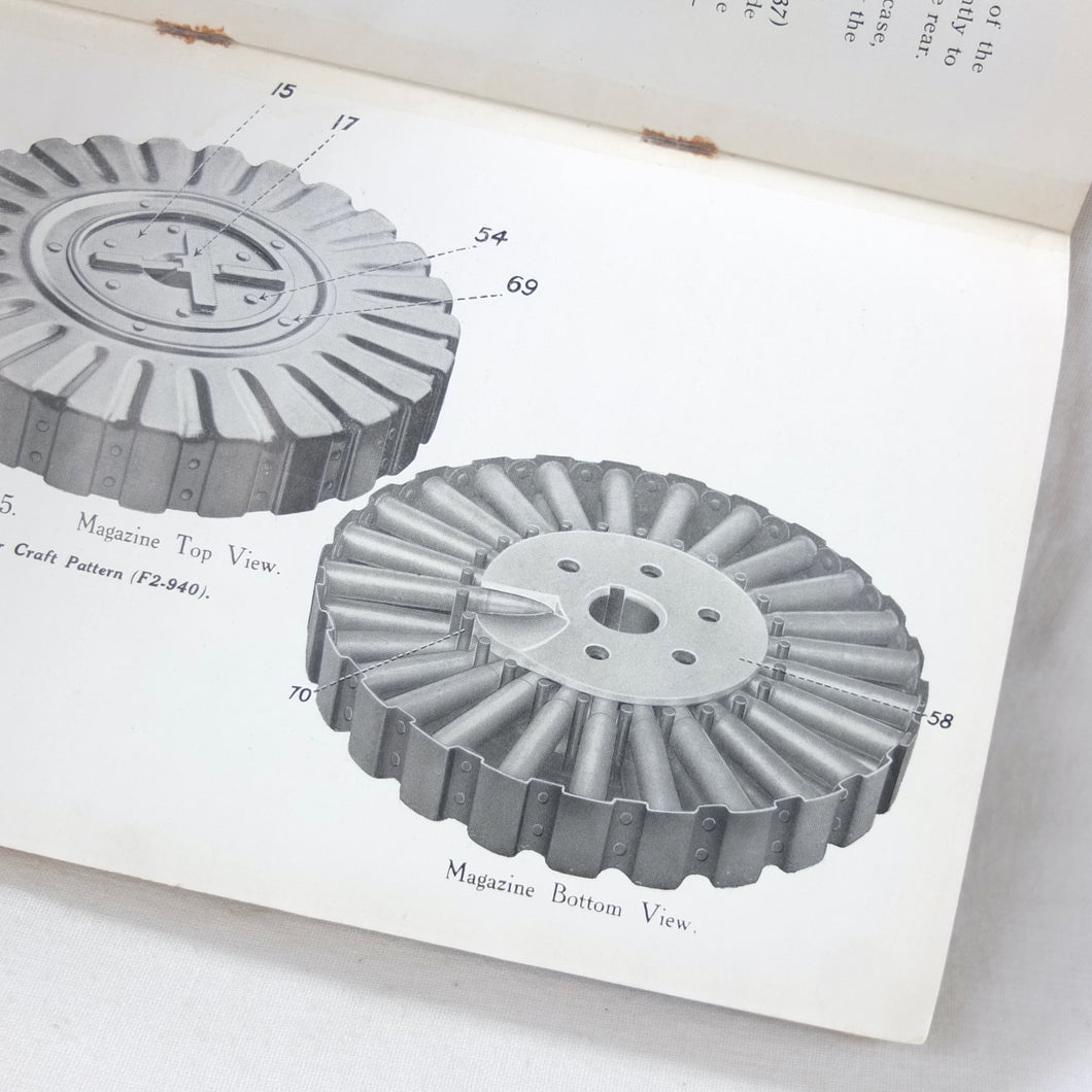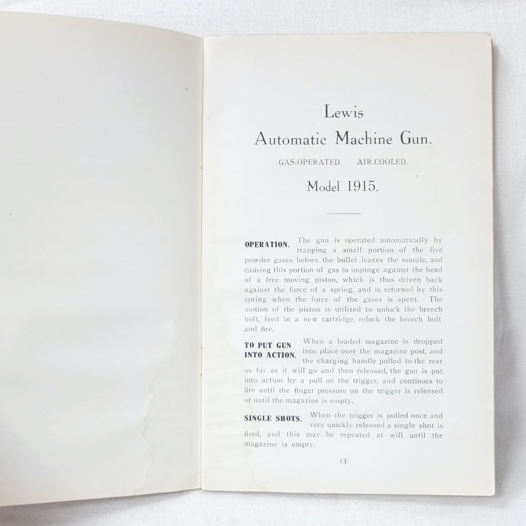 A rare original WW1 Lewis Automatic Machine Gun handbook, published by the manufacturer, the Birmingham Small Arms Co. Ltd in 1915. The Lewis Gun was manufactured during the First World War by both BSA of Birmingham and the Savage Arms Co. of New York. This book is a guide to the mechanism, handling and maintenance of the ground and aircraft variants of the Lewis Gun, as used by the British Army Royal Flying Corps and RAF during WW1. Illustrated with photographs and a large fold out diagram of the Lewis, it includes a great deal of useful information, including details of how to assemble, load and fire the gun, parts, spares and accessories.