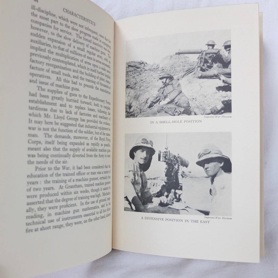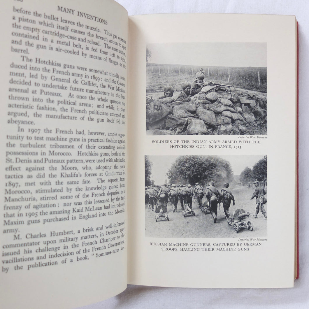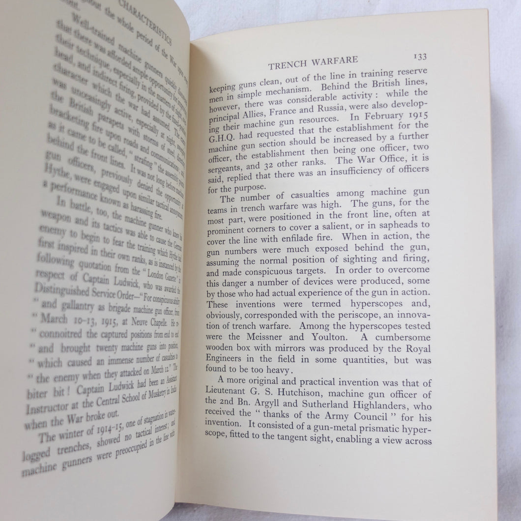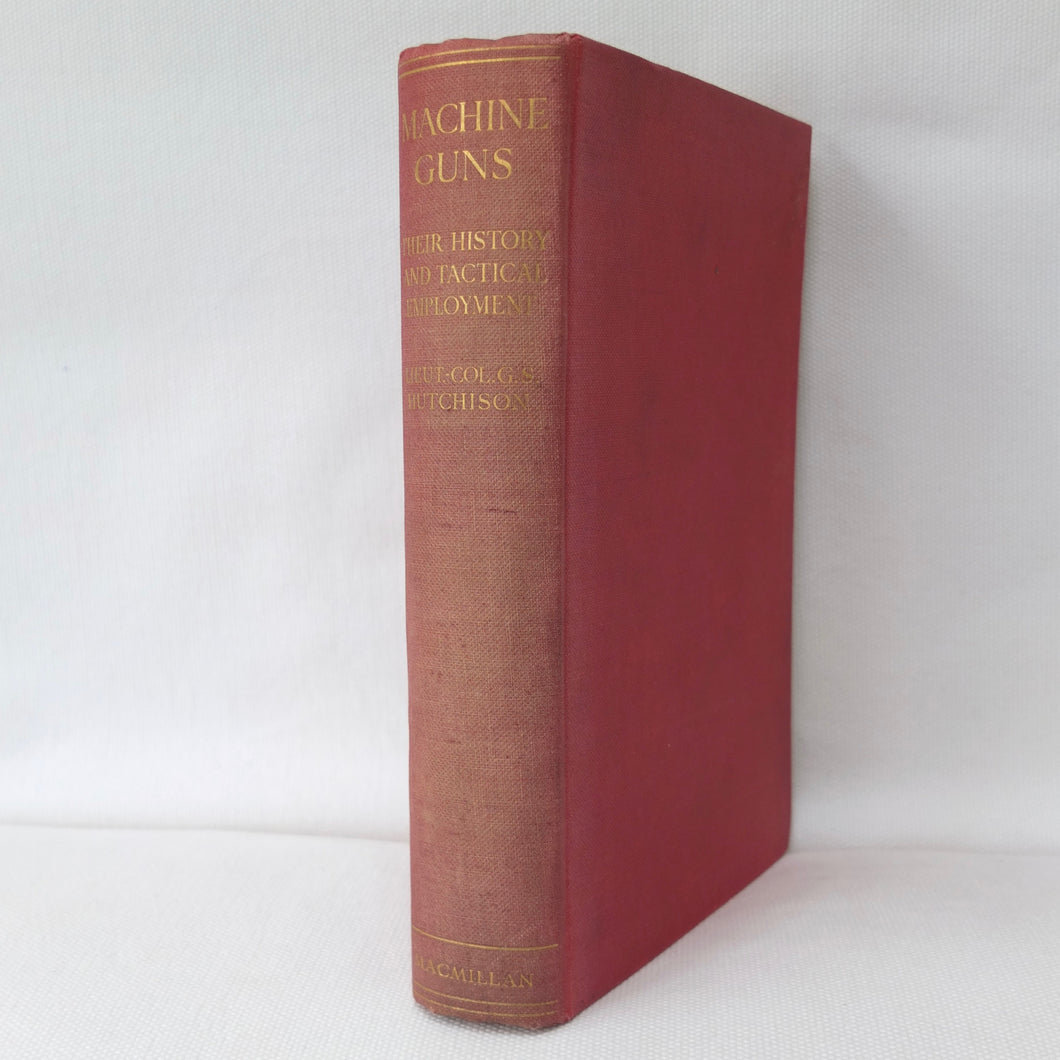 A 1st edition of Lt-Colonel Hutchinson’s classic survey of the role of the machine gun in WW1, and the history of the Machine Gun Corps. Although mainly concerned with the role of the weapon during the Great War, Lt-Col. Hutchinson examines how the machine gun evolved, with sections on the Gatling Gun, the prototype machine gun much favoured in 19th century colonial wars, and on Hiram Maxim, the cheerfully amoral inventor who was the creator of the modern machine gun. In discussing the role of the machine gun on the western front, the author describes the early advantage enjoyed by the Germans, who initially had far more of the weapons per head than the British. He does not attempt to hide the horrendous toll taken by the German machine gunners on what may have been the weapon’s bloodiest and most successful day: the decimation of the British advance on July 1st, 1916, the first day of the battle of the Somme. But Hutchinson goes on to show the British army learned from their errors, caught up with the Germans, and devised new machine gun tactics. The book includes sections on the use of the gun in other theatres of war, including Italy, the Balkans and the Middle East. A well-written, sober and informative account, packed with detailed and fascinating information.