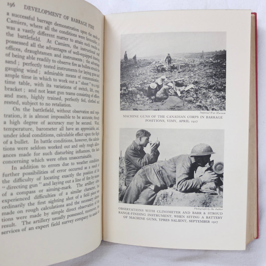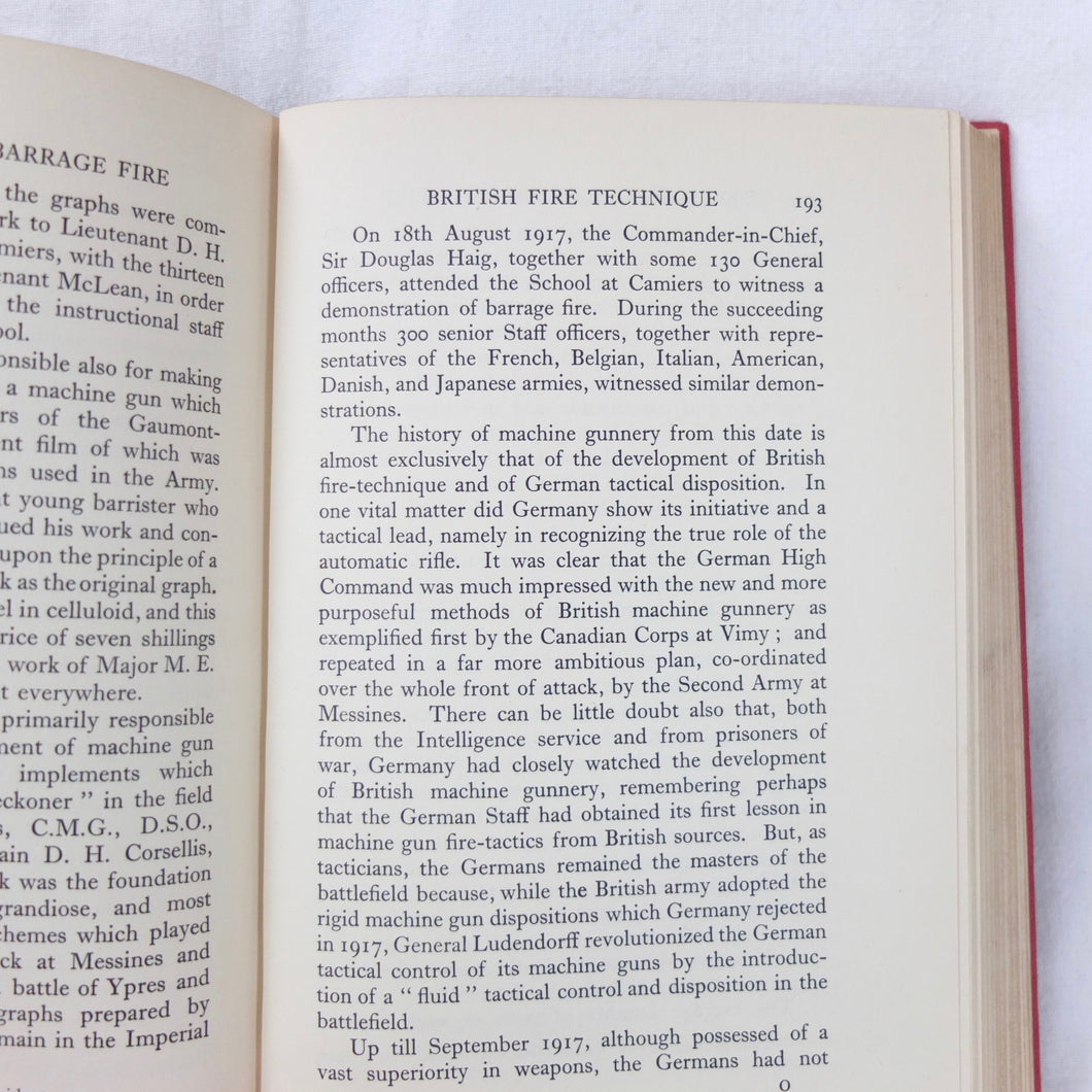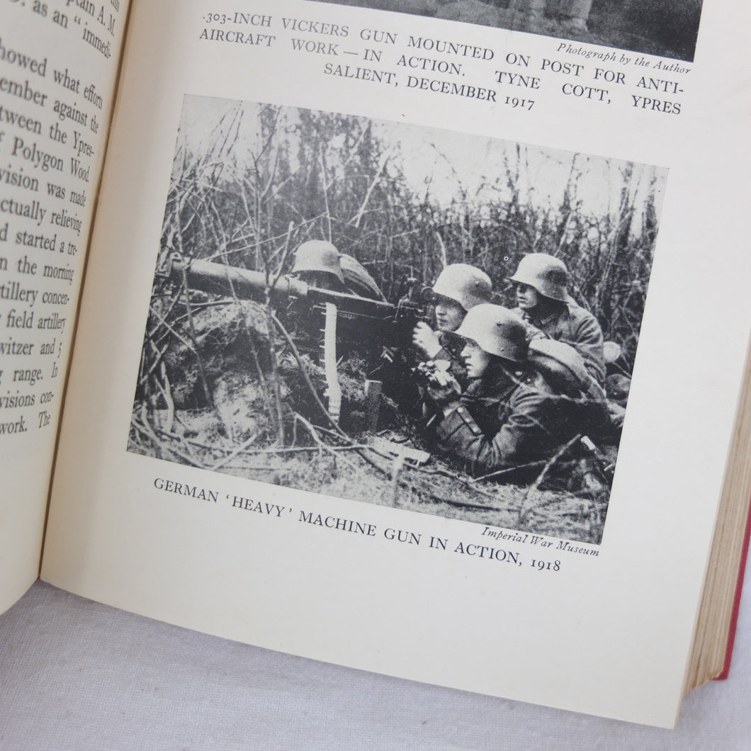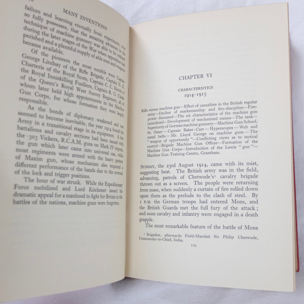 A 1st edition of Lt-Colonel Hutchinson’s classic survey of the role of the machine gun in WW1, and the history of the Machine Gun Corps. Although mainly concerned with the role of the weapon during the Great War, Lt-Col. Hutchinson examines how the machine gun evolved, with sections on the Gatling Gun, the prototype machine gun much favoured in 19th century colonial wars, and on Hiram Maxim, the cheerfully amoral inventor who was the creator of the modern machine gun. In discussing the role of the machine gun on the western front, the author describes the early advantage enjoyed by the Germans, who initially had far more of the weapons per head than the British. He does not attempt to hide the horrendous toll taken by the German machine gunners on what may have been the weapon’s bloodiest and most successful day: the decimation of the British advance on July 1st, 1916, the first day of the battle of the Somme. But Hutchinson goes on to show the British army learned from their errors, caught up with the Germans, and devised new machine gun tactics. The book includes sections on the use of the gun in other theatres of war, including Italy, the Balkans and the Middle East. A well-written, sober and informative account, packed with detailed and fascinating information.