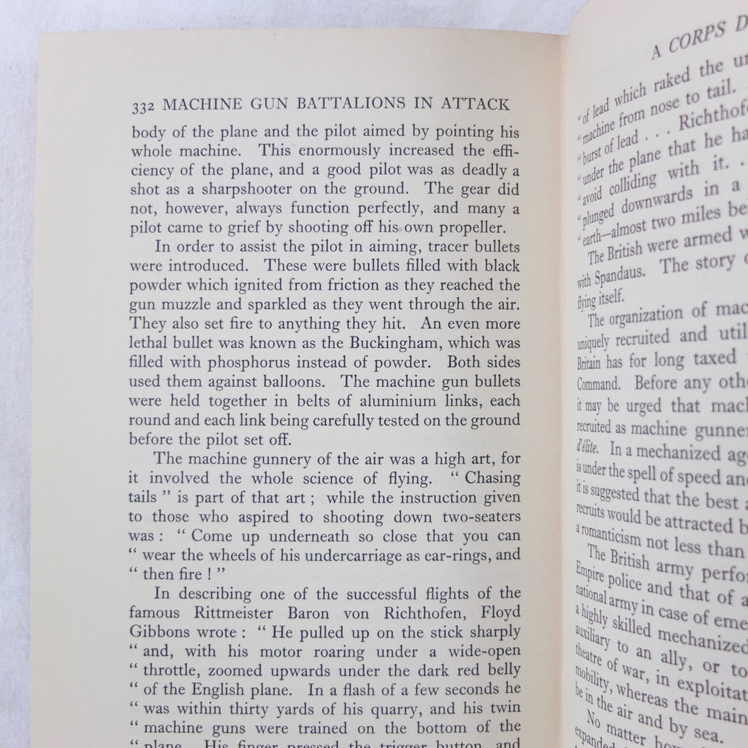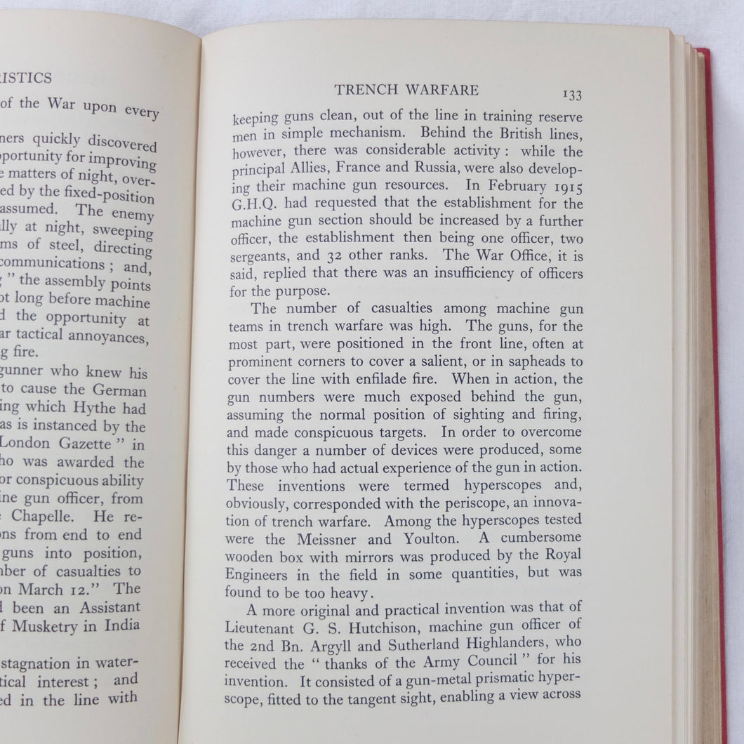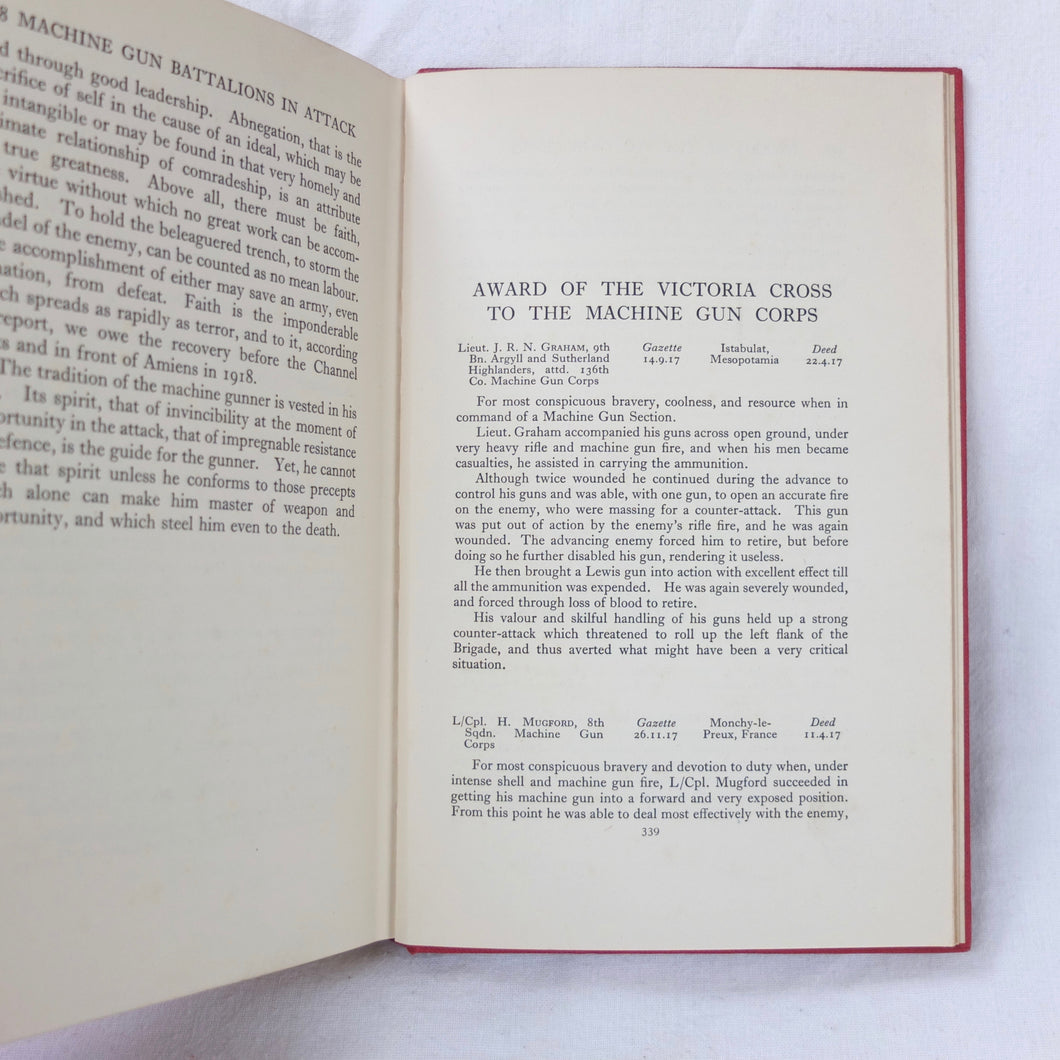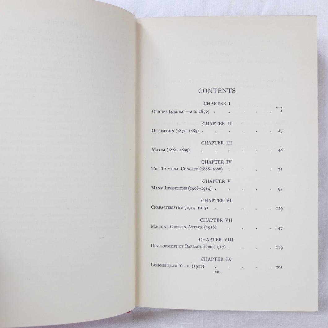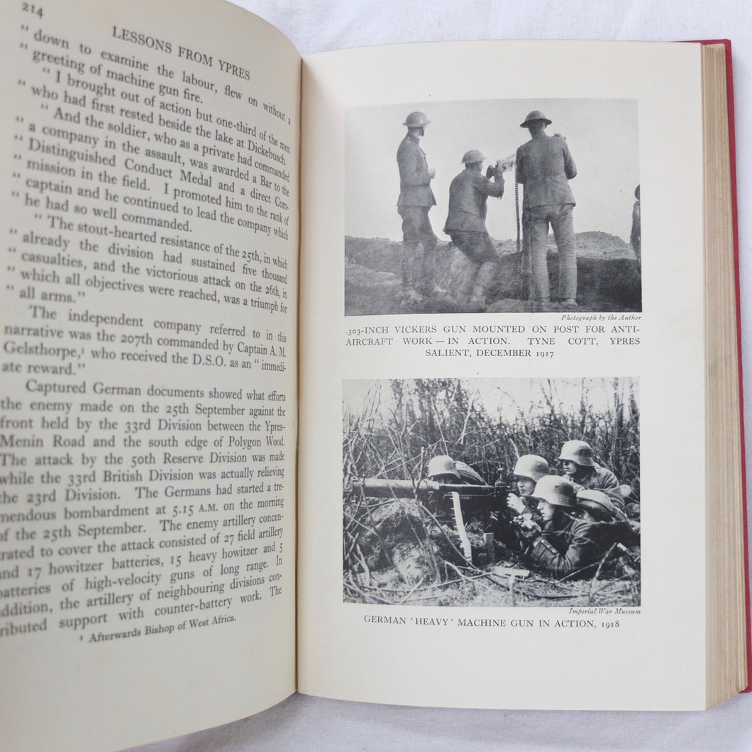 A 1st edition of Lt-Colonel Hutchinson’s classic survey of the role of the machine gun in WW1, and the history of the Machine Gun Corps. Although mainly concerned with the role of the weapon during the Great War, Lt-Col. Hutchinson examines how the machine gun evolved, with sections on the Gatling Gun, the prototype machine gun much favoured in 19th century colonial wars, and on Hiram Maxim, the cheerfully amoral inventor who was the creator of the modern machine gun. In discussing the role of the machine gun on the western front, the author describes the early advantage enjoyed by the Germans, who initially had far more of the weapons per head than the British. He does not attempt to hide the horrendous toll taken by the German machine gunners on what may have been the weapon’s bloodiest and most successful day: the decimation of the British advance on July 1st, 1916, the first day of the battle of the Somme. But Hutchinson goes on to show the British army learned from their errors, caught up with the Germans, and devised new machine gun tactics. The book includes sections on the use of the gun in other theatres of war, including Italy, the Balkans and the Middle East. A well-written, sober and informative account, packed with detailed and fascinating information.